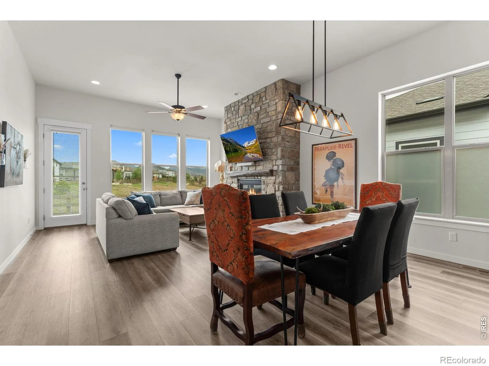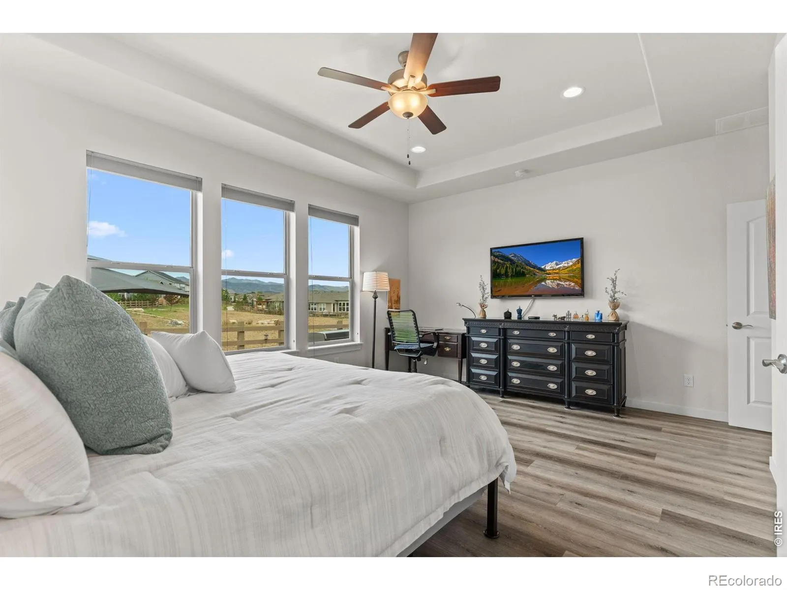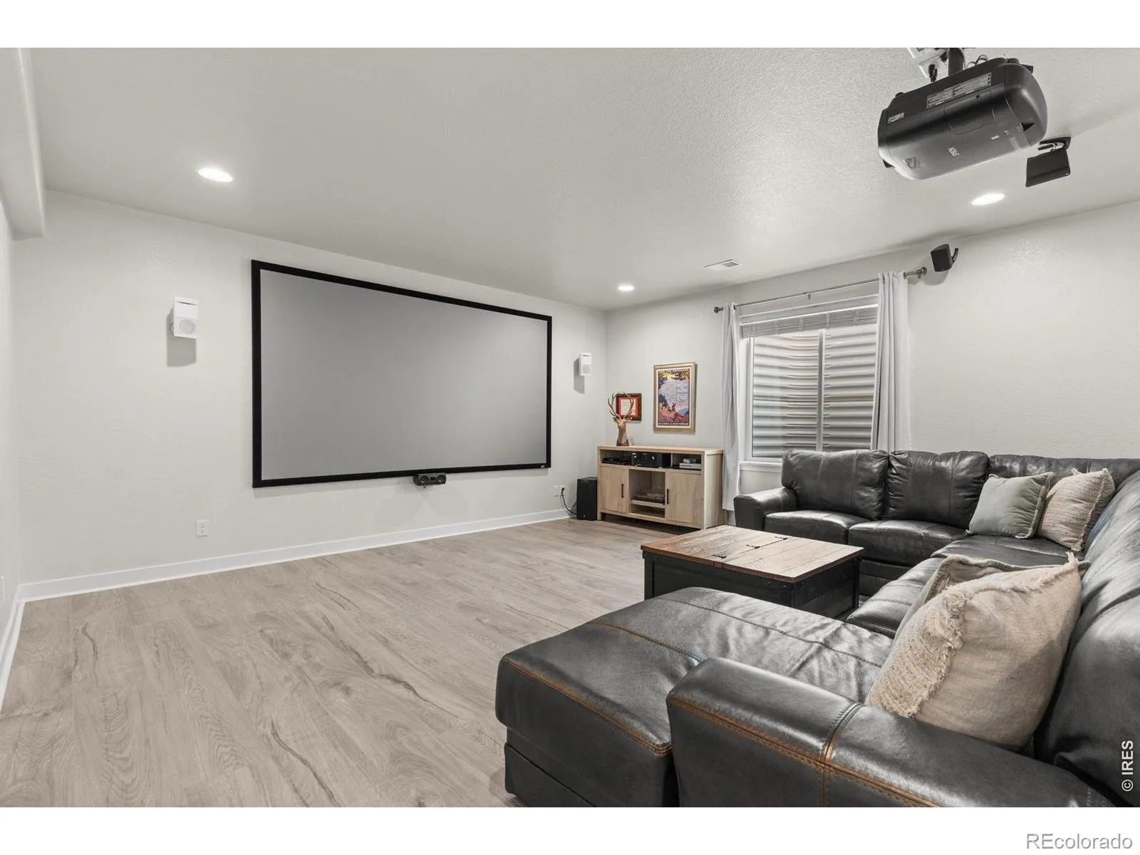 Colorado living is at its finest here in the Enclave at Mariana Butte. This highly desirable and beautiful area is nestled in the perfect location at the bottom of the foothills, bordering Boedecker lake and within walking distance to hiking, biking, trails, parks, and golfing! This 5-bedroom, 4-bathroom home is full of upgrades from the builder, and the over 3,531 square feet of space is as functional as it is elevated and comfortable. Enjoy mountain views over open space from oversized windows in the living room and primary suite, or immerse yourself even further into nature on the oversized back patio. On the main level you will find your generously sized Primary suite, with a spacious walk in closet and soaking tub. Also on the main floor is the laundry room and two other bedrooms and bathrooms. In the finished basement you will find two other bedrooms with oversized closets and another beautifully designed full bathroom. Built-in theater equipment is a dream for lovers of entertainment, and can be left with the home or removed if desired. Even with so much finished living space, there is still ample unfinished storage left! Come tour this West Loveland gem for yourself, you won’t want to miss it!