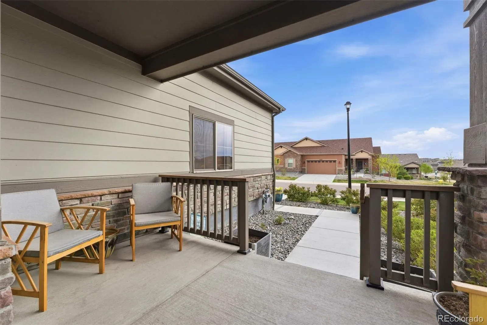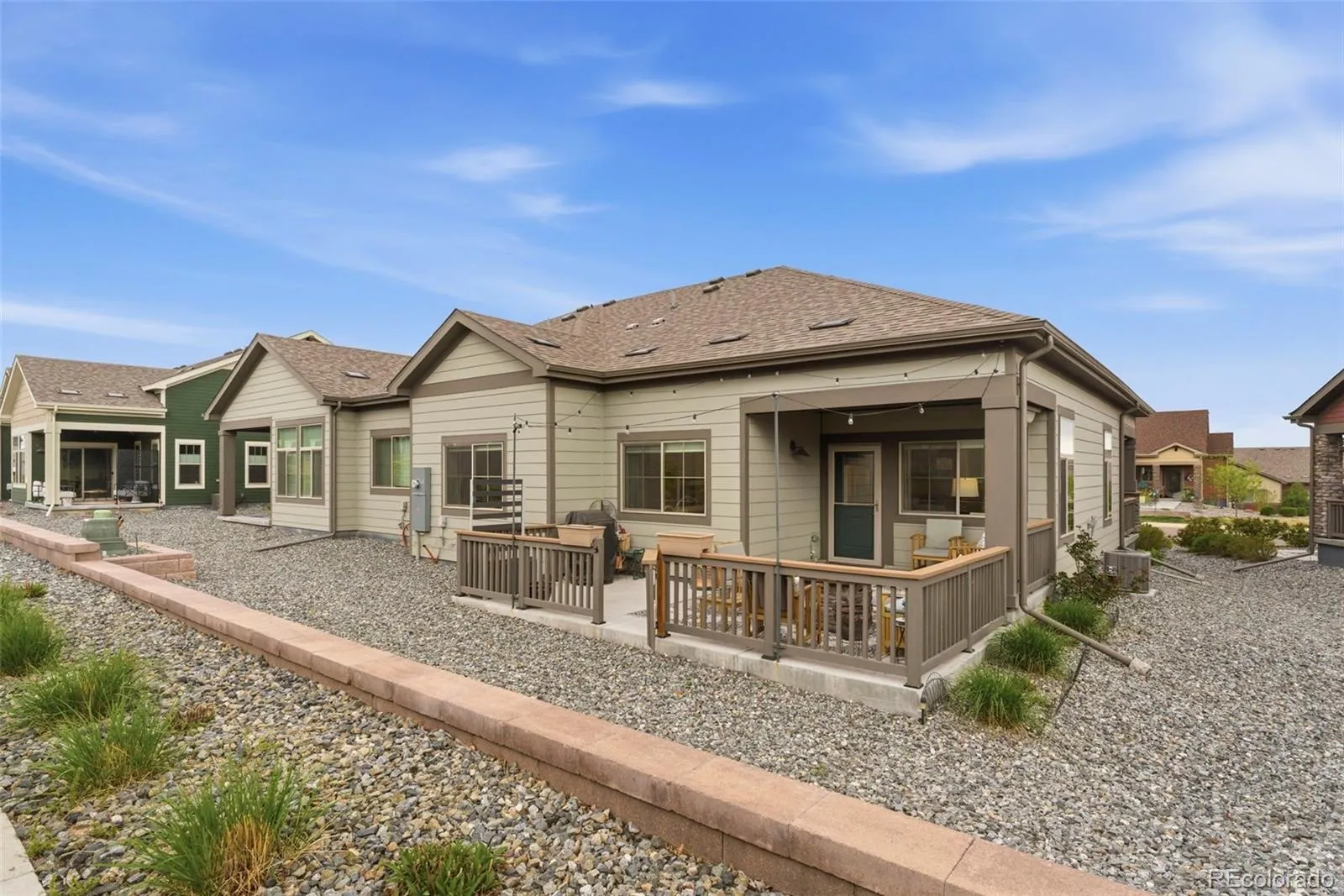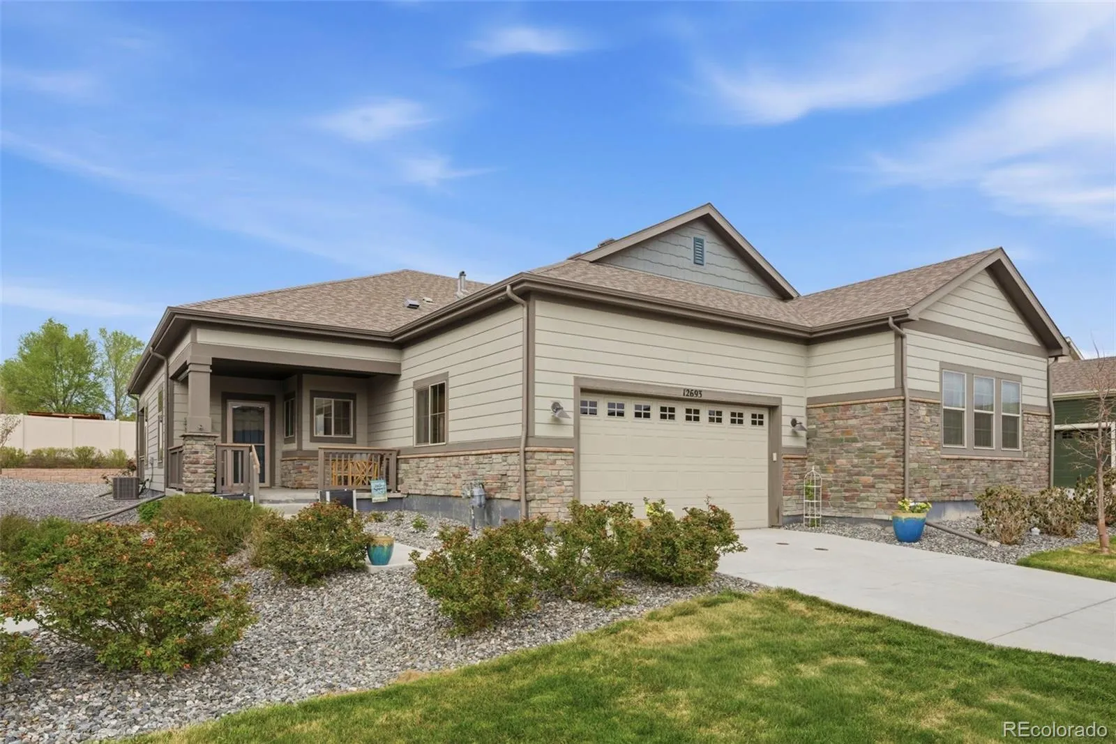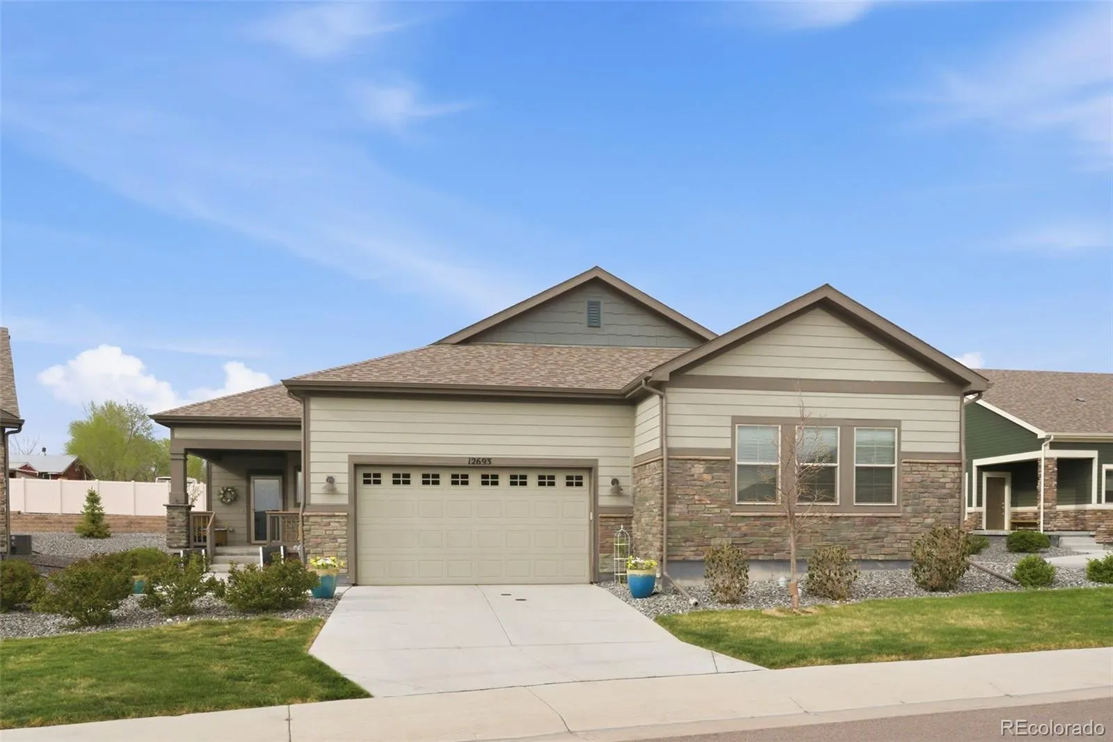 Welcome to truly maintenance-free living in this beautifully upgraded patio-style home located in the Riverdale Ranch community. Built in 2021 and meticulously cared for, this home features a thoughtfully designed open-concept layout with high ceilings and abundant natural light, creating a bright and inviting atmosphere The kitchen is a standout, highlighted by a large granite island with seating, 42-inch upper cabinets with crown molding, pull-out shelving, soft-close drawers, stylish pendant lighting, and a modern gas range complete with convection oven and air fryer. A tile backsplash and stainless steel appliances complete the space, making it both functional and elegant The spacious family room flows seamlessly into the dining area, offering the perfect setting for entertaining or everyday living. At day’s end, retreat to the oversized primary suite featuring a luxurious en suite bath with dual sinks, a large granite countertop, upgraded fixtures, custom tile work, and a large walk-in closet. A secondary bedroom provides flexibility for guests, a home office, or additional living space, complemented by a full secondary bathroom. Enjoy Colorado’s outdoor lifestyle from the covered front patio—perfect for sunsets—or the extended 300 sq ft covered back patio with Trex-style railing, ideal for relaxing, entertaining, or accommodating pets. The oversized two-car garage includes durable floor coating, loft storage, and a convenient water hookup for easy cleaning. Located just steps from a community garden and the scenic trails of Brantner Gulch Open Space, this home offers both tranquility and convenience. As part of Boulder Creek Neighborhoods’ “Easy House” lifestyle, residents enjoy snow removal (including driveways and sidewalks), exterior home maintenance, landscaping maintenance, and irrigation—providing truly low-maintenance living. With close proximity to shopping, dining, and Riverdale Golf Course. Don’t miss the virtual 3D tour—your next home awaits!