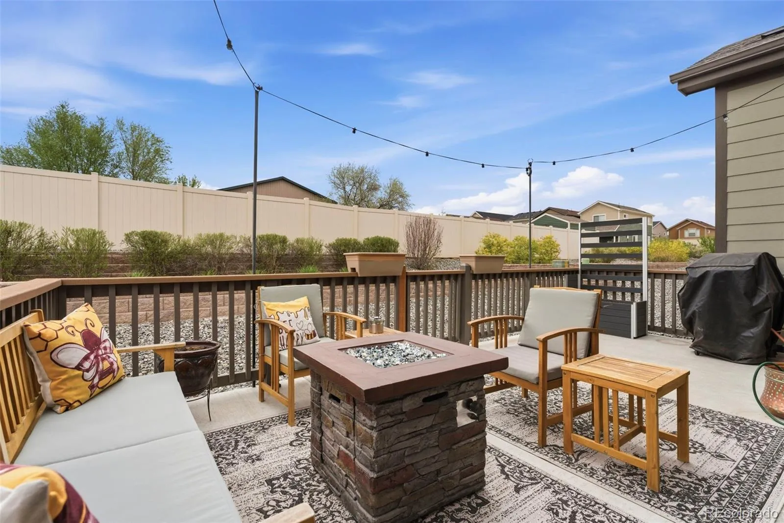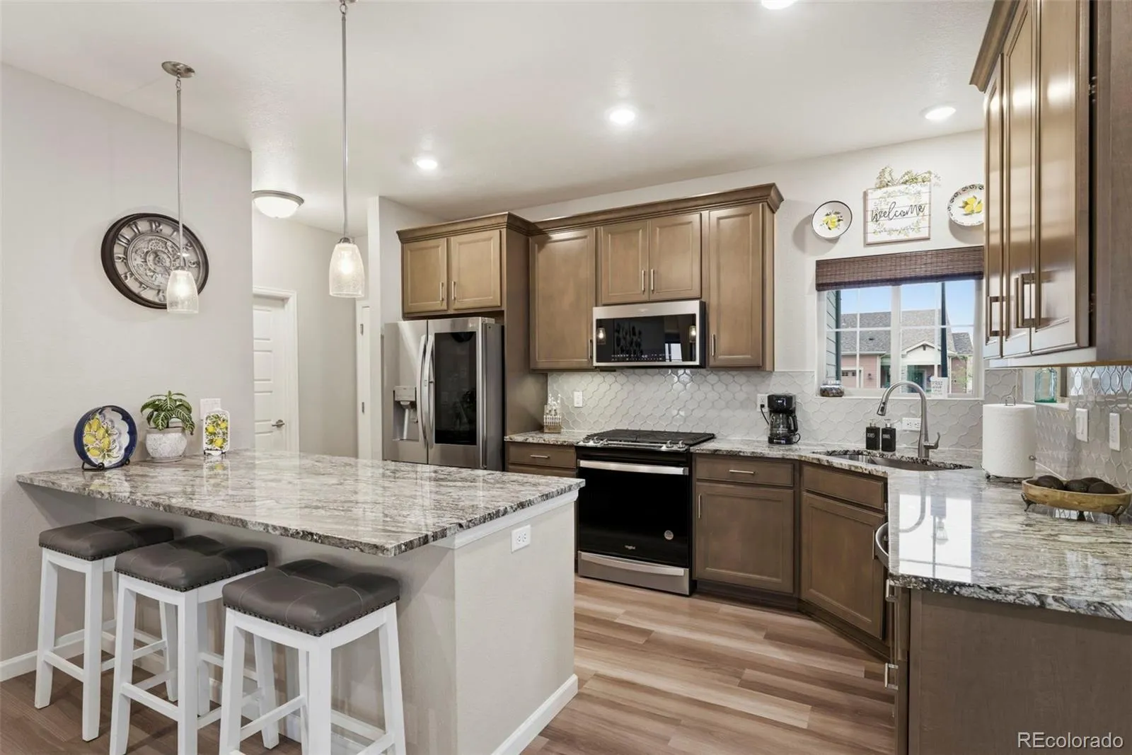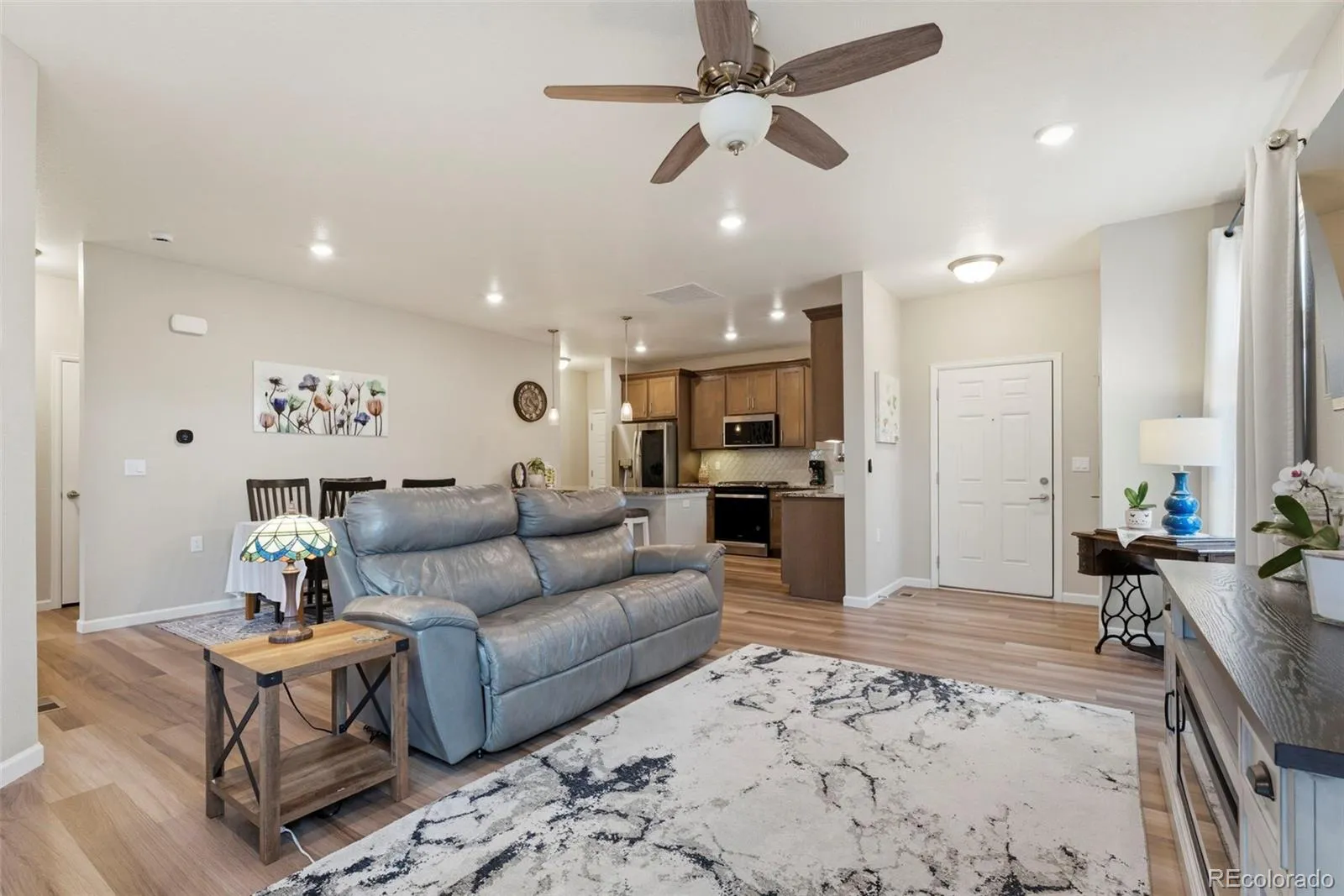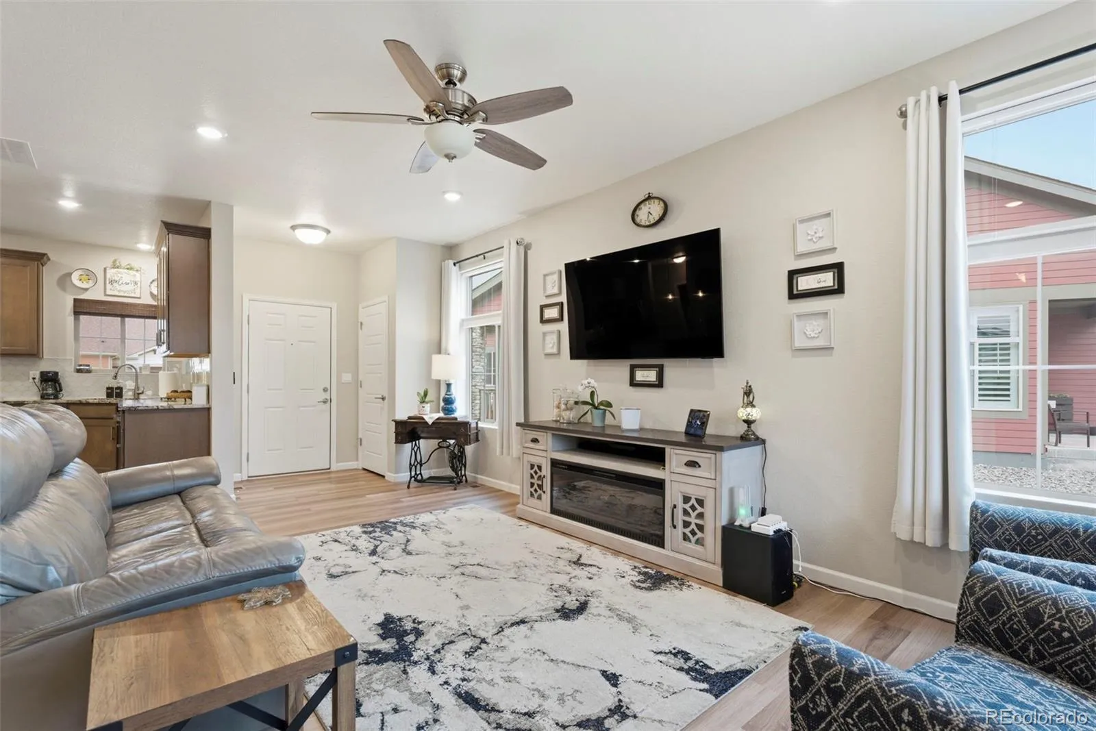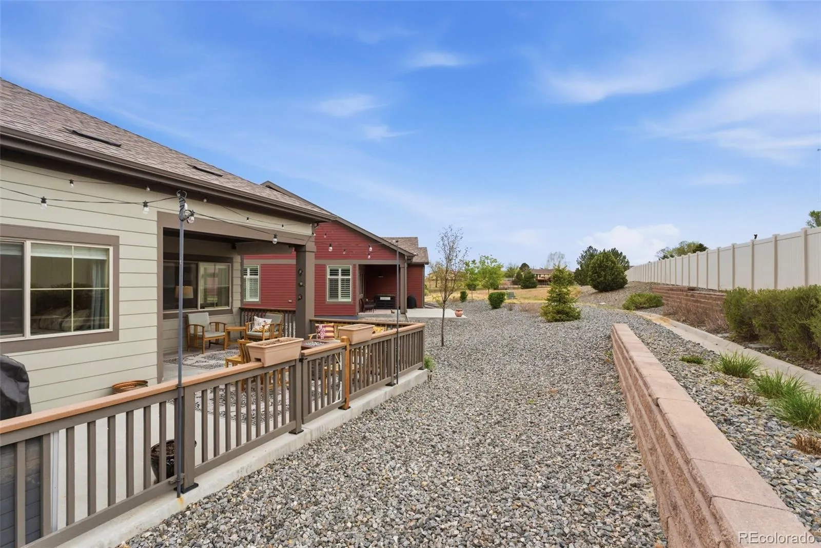 Welcome to truly maintenance-free living in this beautifully upgraded patio-style home located in the Riverdale Ranch community. Built in 2021 and meticulously cared for, this home features a thoughtfully designed open-concept layout with high ceilings and abundant natural light, creating a bright and inviting atmosphere The kitchen is a standout, highlighted by a large granite island with seating, 42-inch upper cabinets with crown molding, pull-out shelving, soft-close drawers, stylish pendant lighting, and a modern gas range complete with convection oven and air fryer. A tile backsplash and stainless steel appliances complete the space, making it both functional and elegant The spacious family room flows seamlessly into the dining area, offering the perfect setting for entertaining or everyday living. At day’s end, retreat to the oversized primary suite featuring a luxurious en suite bath with dual sinks, a large granite countertop, upgraded fixtures, custom tile work, and a large walk-in closet. A secondary bedroom provides flexibility for guests, a home office, or additional living space, complemented by a full secondary bathroom. Enjoy Colorado’s outdoor lifestyle from the covered front patio—perfect for sunsets—or the extended 300 sq ft covered back patio with Trex-style railing, ideal for relaxing, entertaining, or accommodating pets. The oversized two-car garage includes durable floor coating, loft storage, and a convenient water hookup for easy cleaning. Located just steps from a community garden and the scenic trails of Brantner Gulch Open Space, this home offers both tranquility and convenience. As part of Boulder Creek Neighborhoods’ “Easy House” lifestyle, residents enjoy snow removal (including driveways and sidewalks), exterior home maintenance, landscaping maintenance, and irrigation—providing truly low-maintenance living. With close proximity to shopping, dining, and Riverdale Golf Course. Don’t miss the virtual 3D tour—your next home awaits!