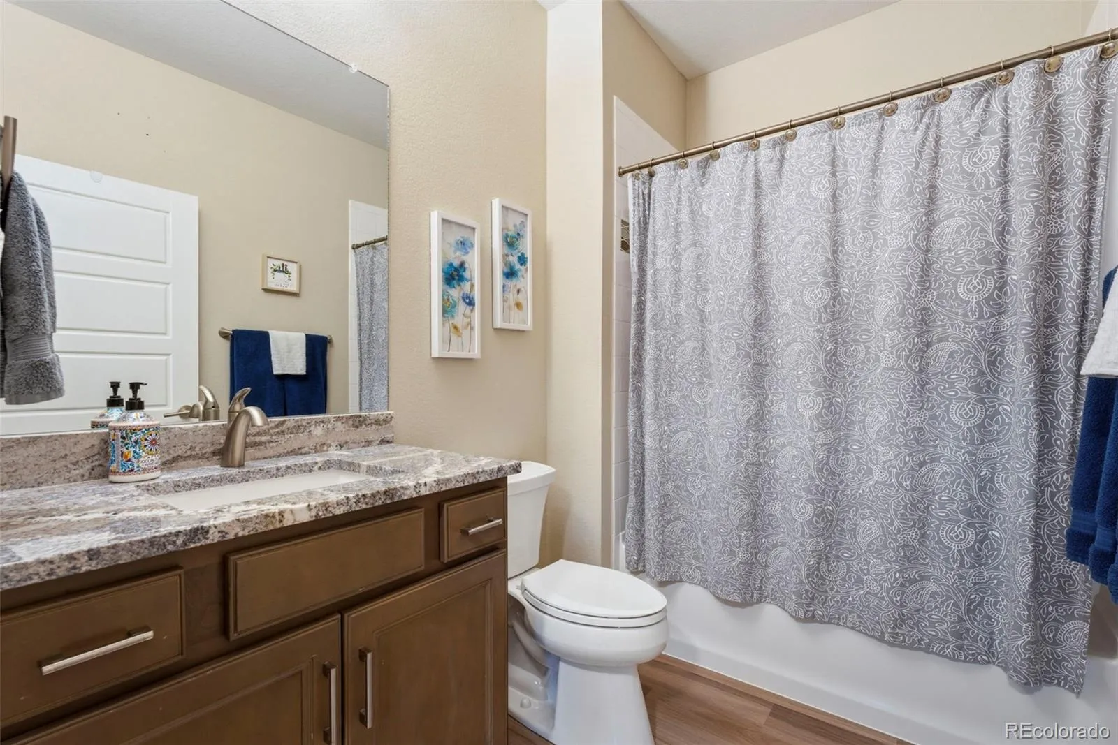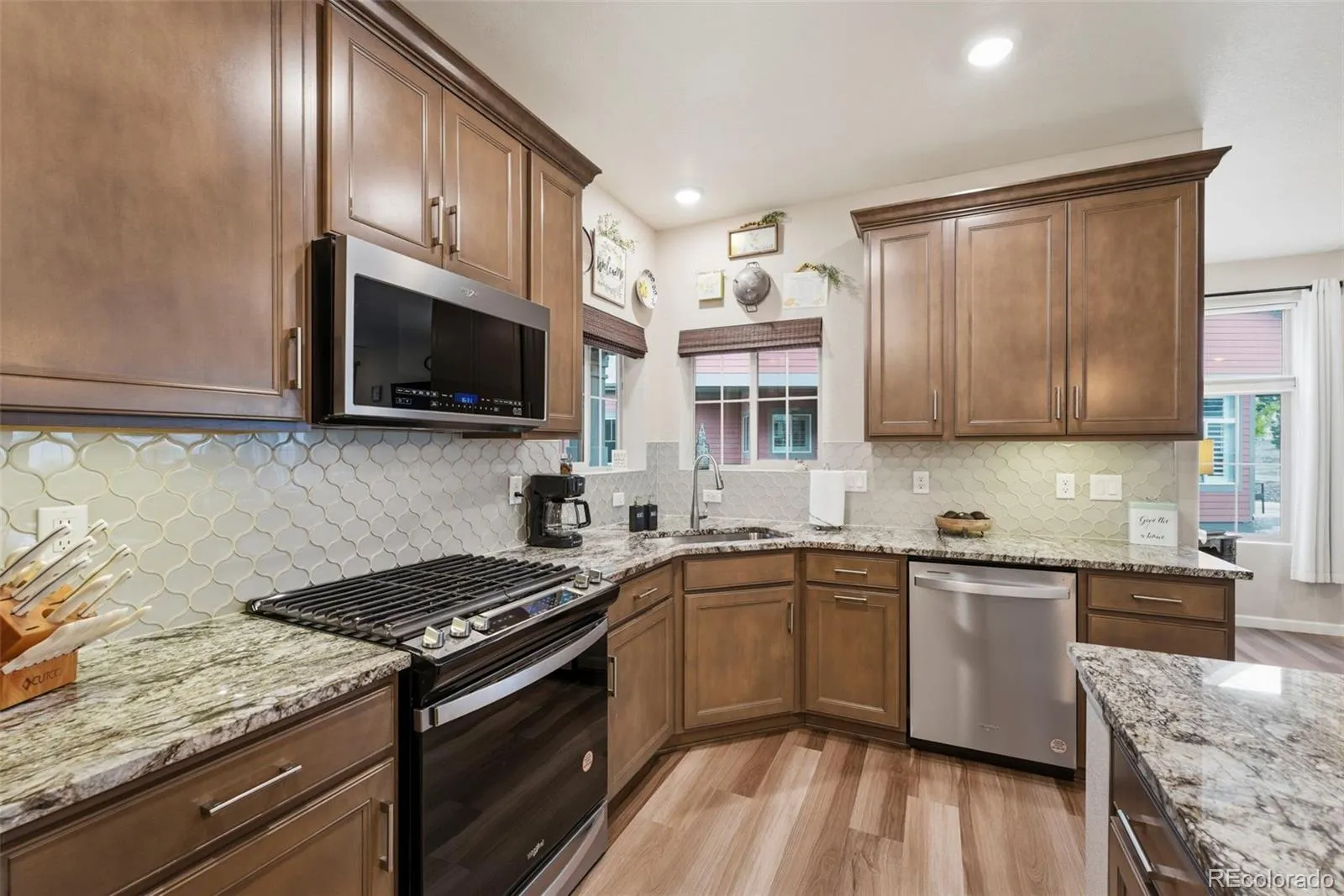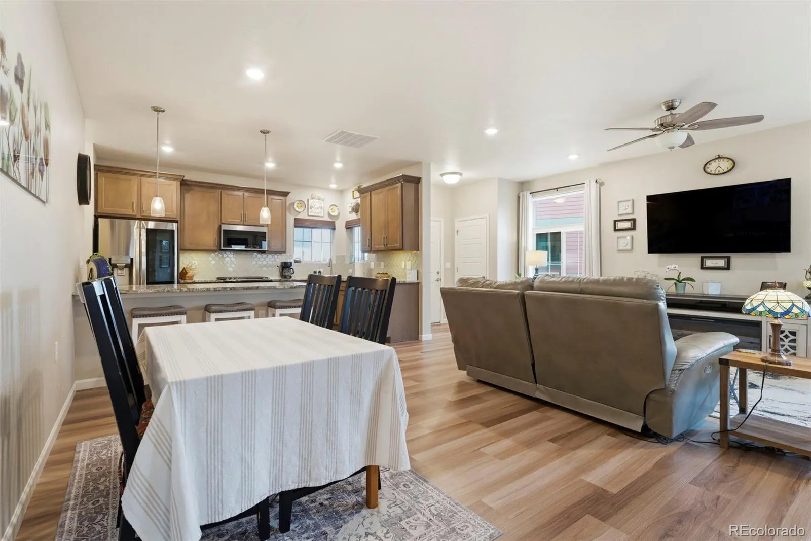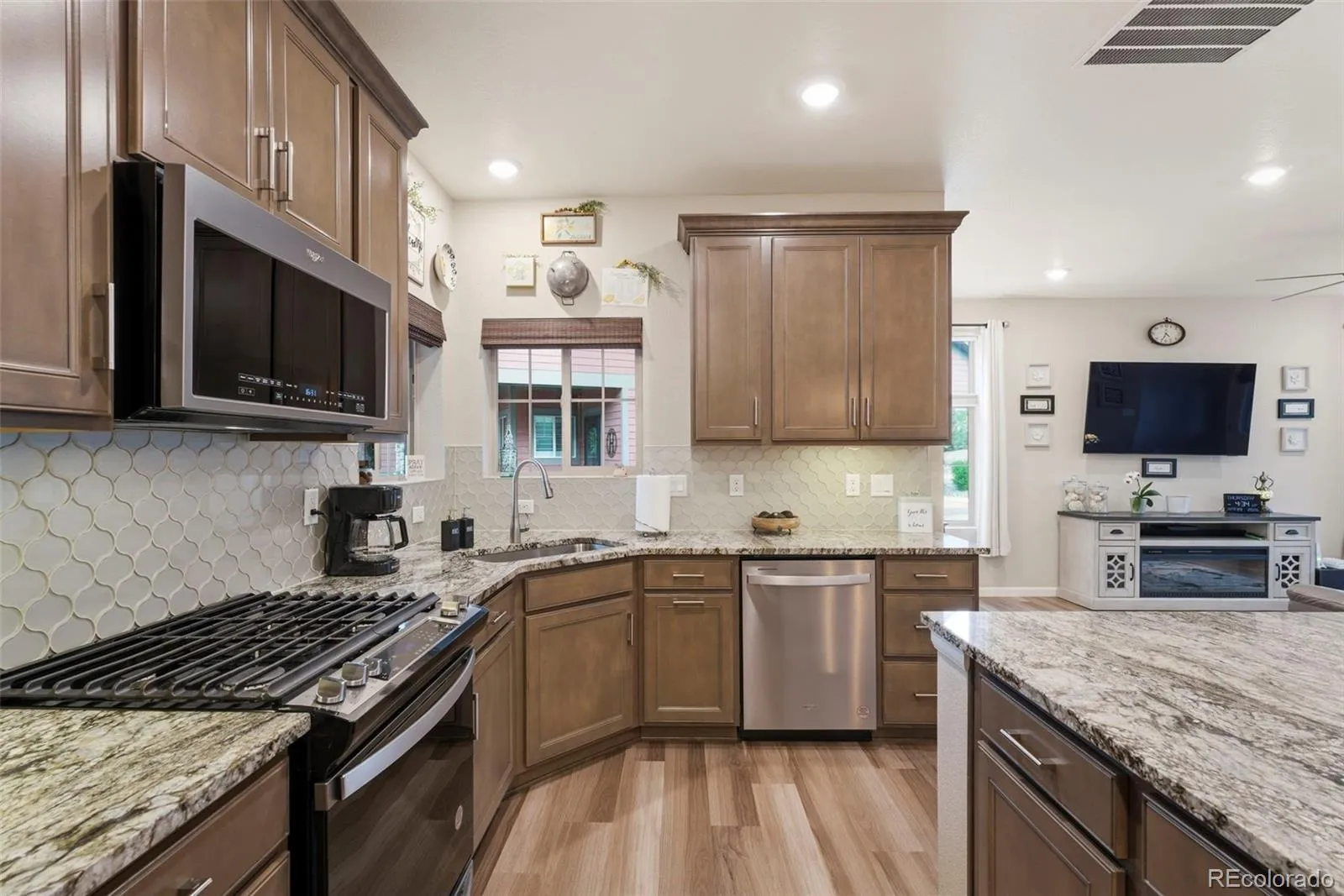 Welcome to truly maintenance-free living in this beautifully upgraded patio-style home located in the Riverdale Ranch community. Built in 2021 and meticulously cared for, this home features a thoughtfully designed open-concept layout with high ceilings and abundant natural light, creating a bright and inviting atmosphere The kitchen is a standout, highlighted by a large granite island with seating, 42-inch upper cabinets with crown molding, pull-out shelving, soft-close drawers, stylish pendant lighting, and a modern gas range complete with convection oven and air fryer. A tile backsplash and stainless steel appliances complete the space, making it both functional and elegant The spacious family room flows seamlessly into the dining area, offering the perfect setting for entertaining or everyday living. At day’s end, retreat to the oversized primary suite featuring a luxurious en suite bath with dual sinks, a large granite countertop, upgraded fixtures, custom tile work, and a large walk-in closet. A secondary bedroom provides flexibility for guests, a home office, or additional living space, complemented by a full secondary bathroom. Enjoy Colorado’s outdoor lifestyle from the covered front patio—perfect for sunsets—or the extended 300 sq ft covered back patio with Trex-style railing, ideal for relaxing, entertaining, or accommodating pets. The oversized two-car garage includes durable floor coating, loft storage, and a convenient water hookup for easy cleaning. Located just steps from a community garden and the scenic trails of Brantner Gulch Open Space, this home offers both tranquility and convenience. As part of Boulder Creek Neighborhoods’ “Easy House” lifestyle, residents enjoy snow removal (including driveways and sidewalks), exterior home maintenance, landscaping maintenance, and irrigation—providing truly low-maintenance living. With close proximity to shopping, dining, and Riverdale Golf Course. Don’t miss the virtual 3D tour—your next home awaits!