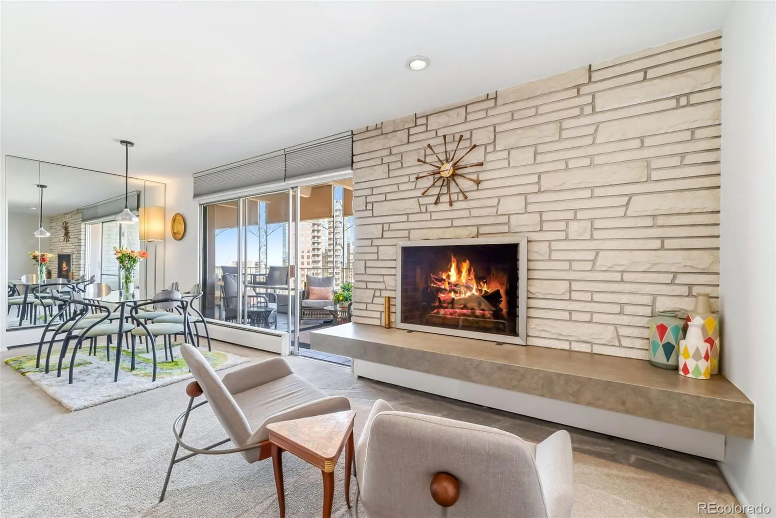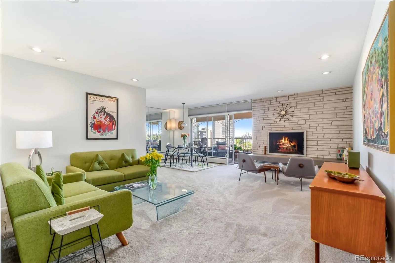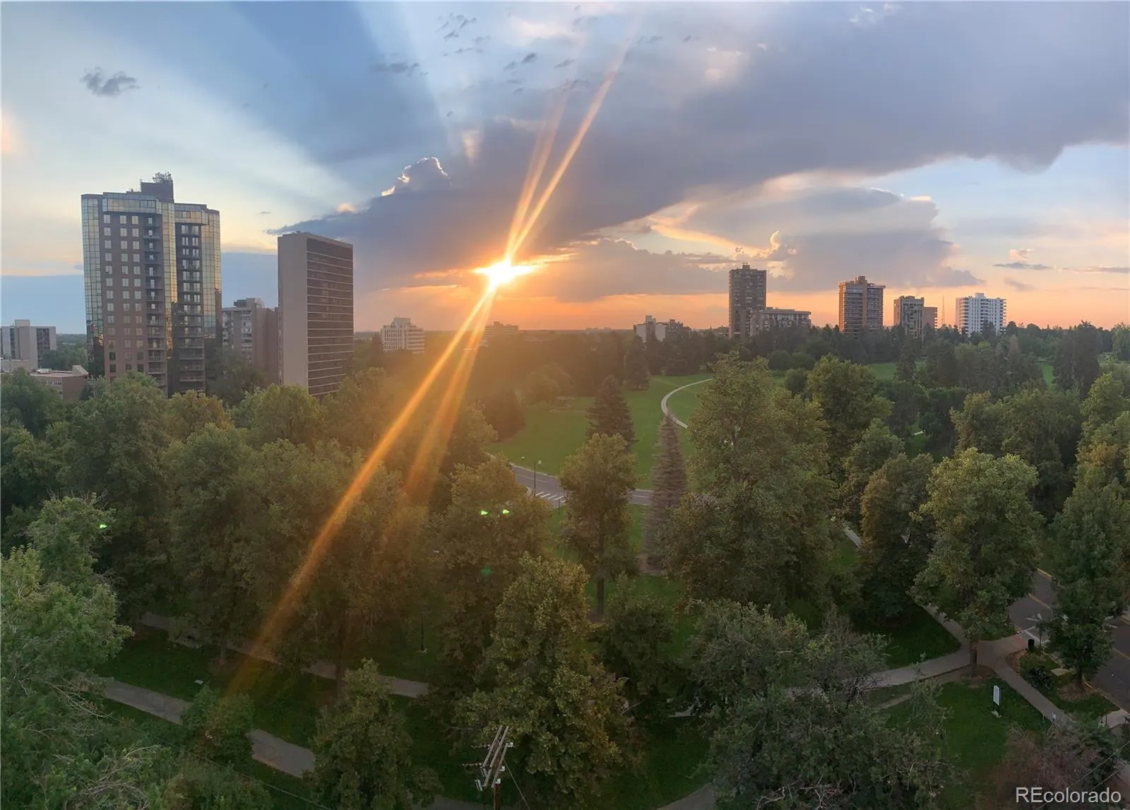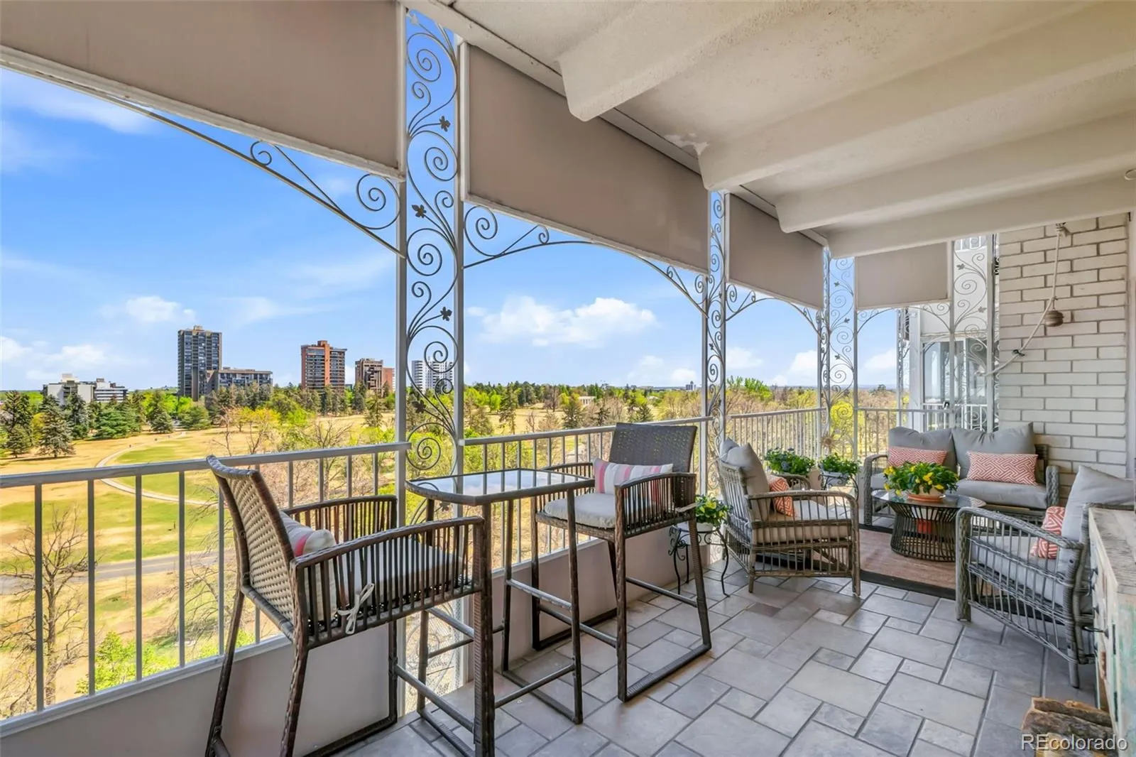 Rare opportunity to own a 3-bedroom mid-century condo overlooking Cheesman Park with city and mountain views. This light-filled 11th-floor residence features an updated kitchen with granite countertops and premium Thermador stainless steel appliances, including an induction cooktop. An expansive 24-foot balcony offers front-row views of sunrises, sunsets, fireworks, and the park—ideal for entertaining or unwinding above it all. Inside, a flexible layout includes three spacious bedrooms—one currently a den—and two dedicated office spaces with inspiring views, perfect for working from home. The living room features a wood-burning fireplace with a classic mid-century brick surround, while sliding glass doors from the kitchen and dining area open to the balcony. The condo is also equipped with motorized thermal blinds that help maintain a cool, comfortable interior.