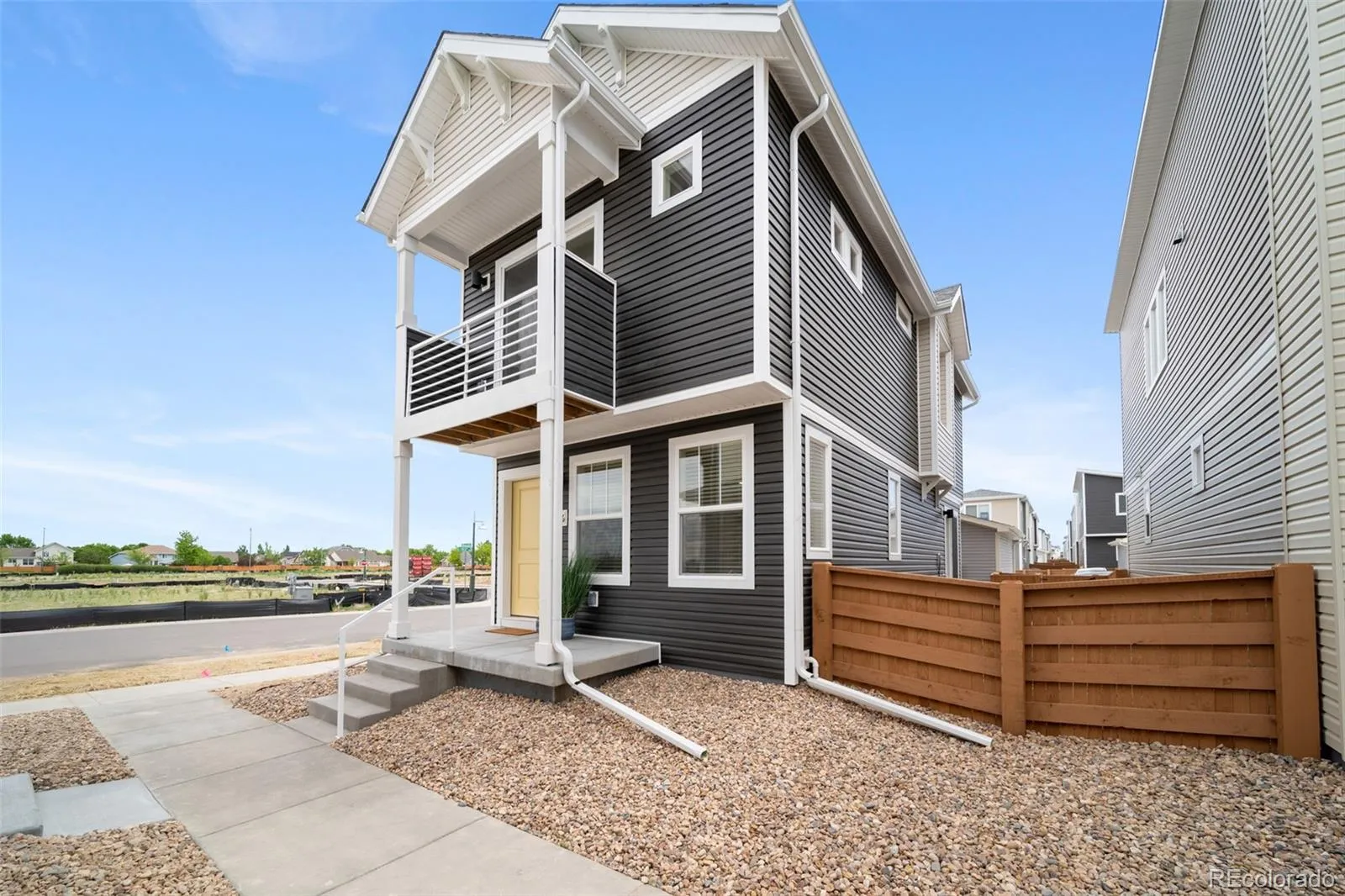 This home has plenty of curb appeal with a multi-dimensional exterior, maintained front landscaping, covered porch, balcony, patio, and fenced backyard. The open-concept main floor includes a spacious living area and a well- appointed kitchen with stainless-steel appliances, large center kitchen island, ample cabinetry, flowing into a dining space perfect for everyday meals and entertainment. The upstairs primary suite is spacious, and both 2nd floor bedrooms have a dedicated bathroom for comfort and privacy. White shaker cabinets, granite countertops, window coverings and a luxury vinyl plank flooring throughout the main level add style and durability.