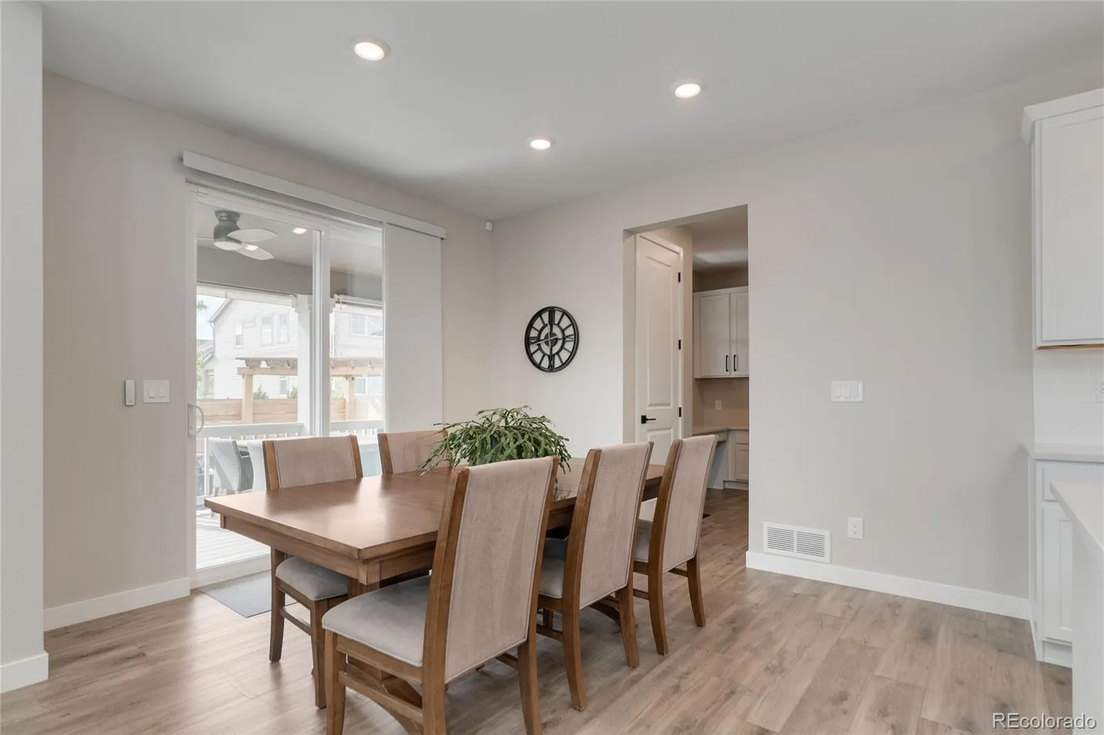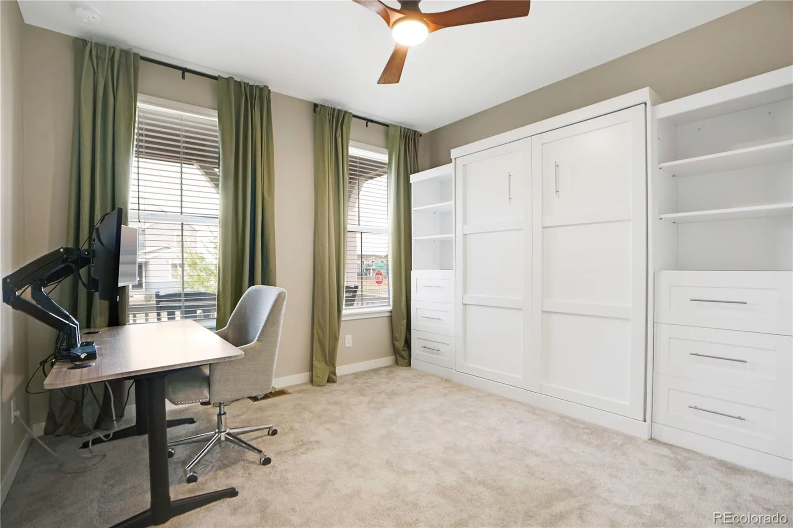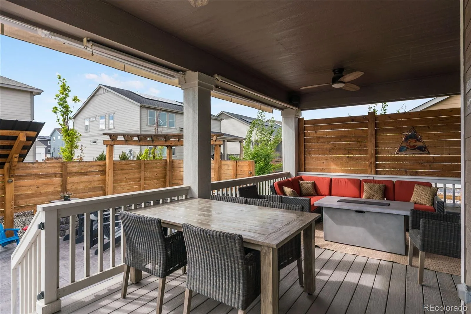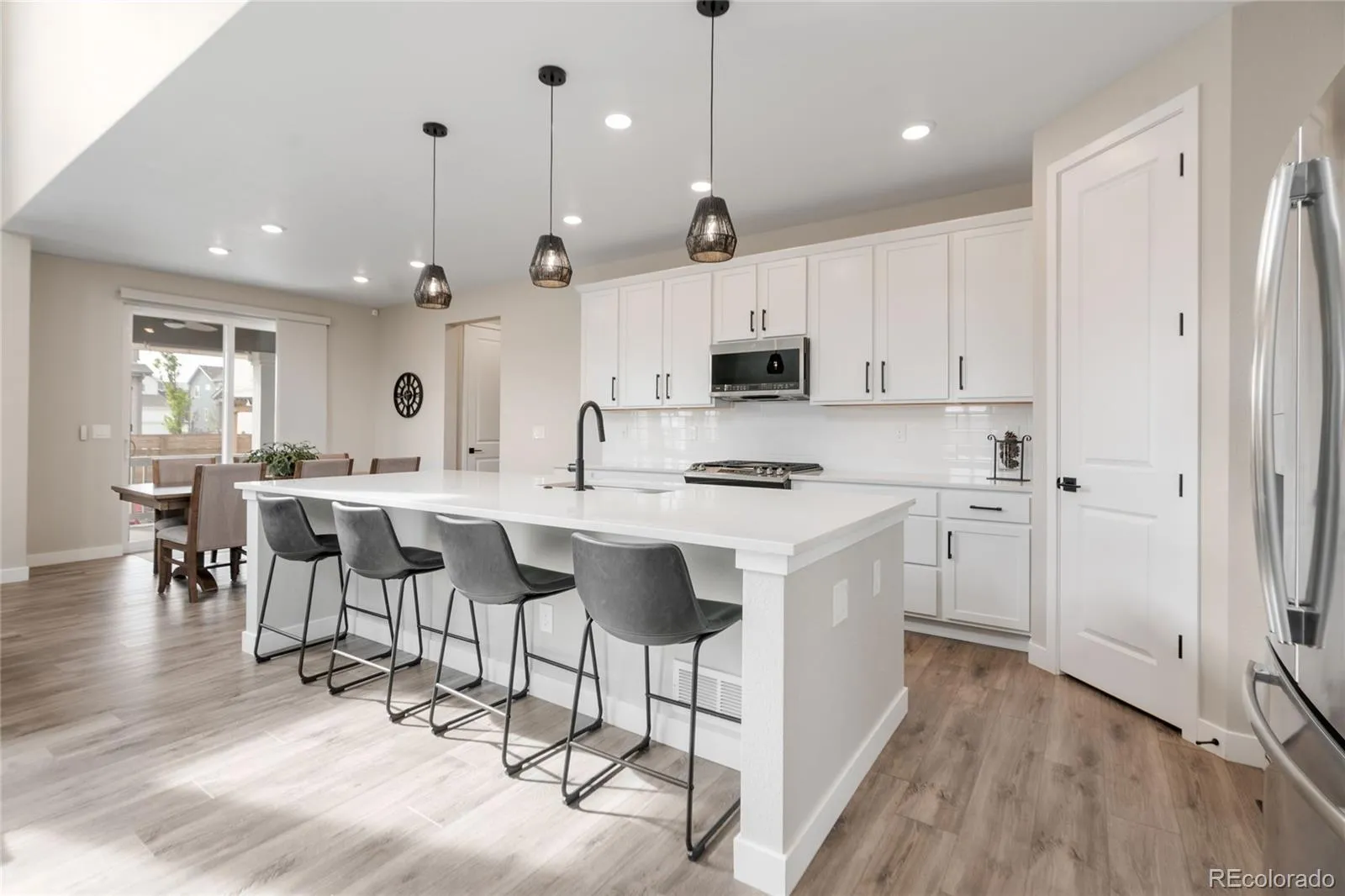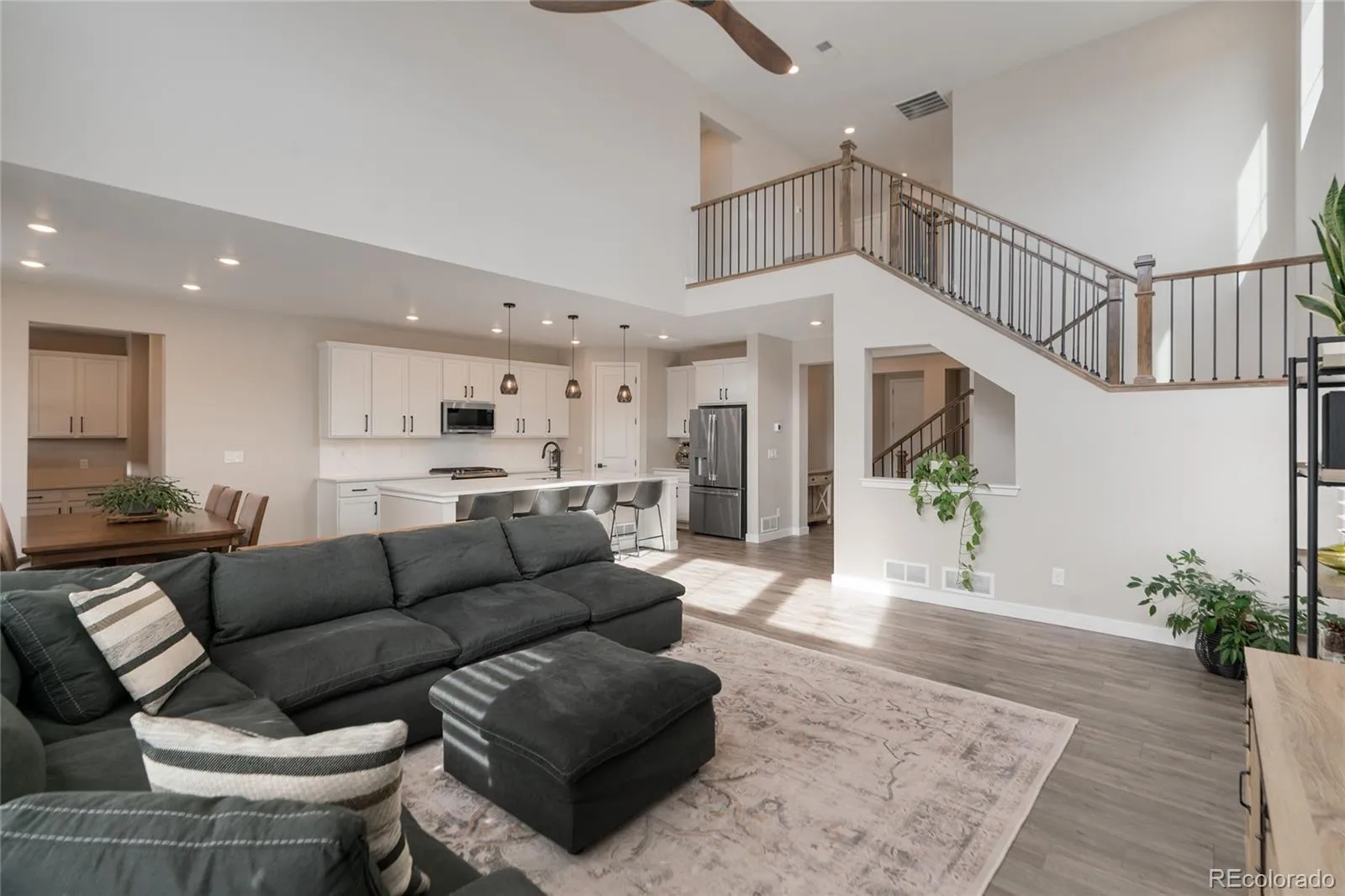This more up-to-date, beautifully designed home offers an array of upgrades and boasts an open concept. The luxury vinyl flooring is resilient and timeless. It provides the perfect blend of modern elegance, with everyday livability and functionality. The high ceilings enhance the home’s expansive feel. The upper windows in the great room have automatic shades. The open floor plan connects the dining and living spaces effortlessly. You’ll have a main floor bedroom that includes a murphy bed, perfect for guests or an office, with an adjacent bathroom. The gourmet kitchen has a large pantry for all your sweet and savory snacks, an extended island, sleek quartz countertops, a self-cleaning oven and ample cabinet space. Adjacent to the kitchen is a spacious mudroom, offering plenty of storage for coats, shoes and everyday essentials. From the mudroom, enter your 3-car garage. The upstairs primary suite serves as your private retreat, combining luxury and comfort, including a spacious bathroom, separate sinks and 2 walk-in closets. Additionally, you have a versatile loft that can be tailored to your needs, whether you’d like a media area, office or play space. The thoughtful layout is smart and functional. It also includes ceiling fans, an attic fan, a smart water shutoff valve and EV Charger. Do you love the outdoors? The backyard offers a terrific area for parties. The yard is the perfect size to maintain, providing grass for the kids and pets, plus an expanded deck, patio and firepit. It was built with thoughtful consideration for enjoying Colorado’s warm summer nights.