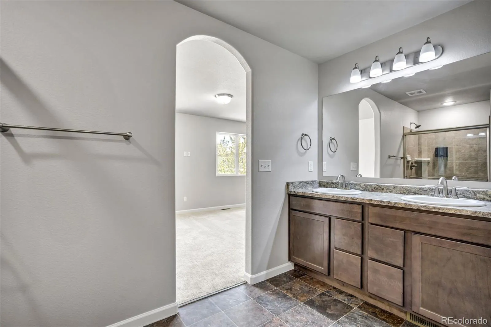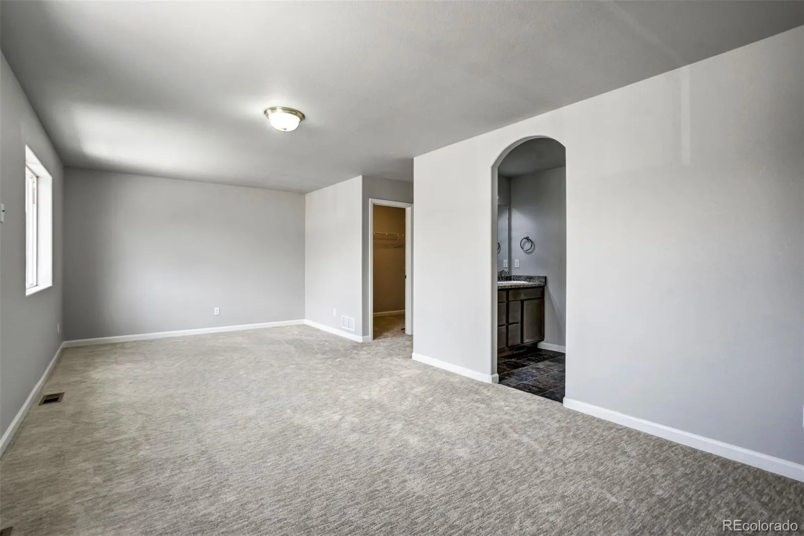 Upstairs, you’ll find brand-new carpet and a conveniently located laundry room between the bedrooms. The primary suite is generously sized, with room for a sitting area or workspace, along with a large walk-in closet and a private bath featuring an oversized shower and double vanity with granite counters. Two additional bedrooms—both with walk-in closets—and a full bathroom complete the upper level.