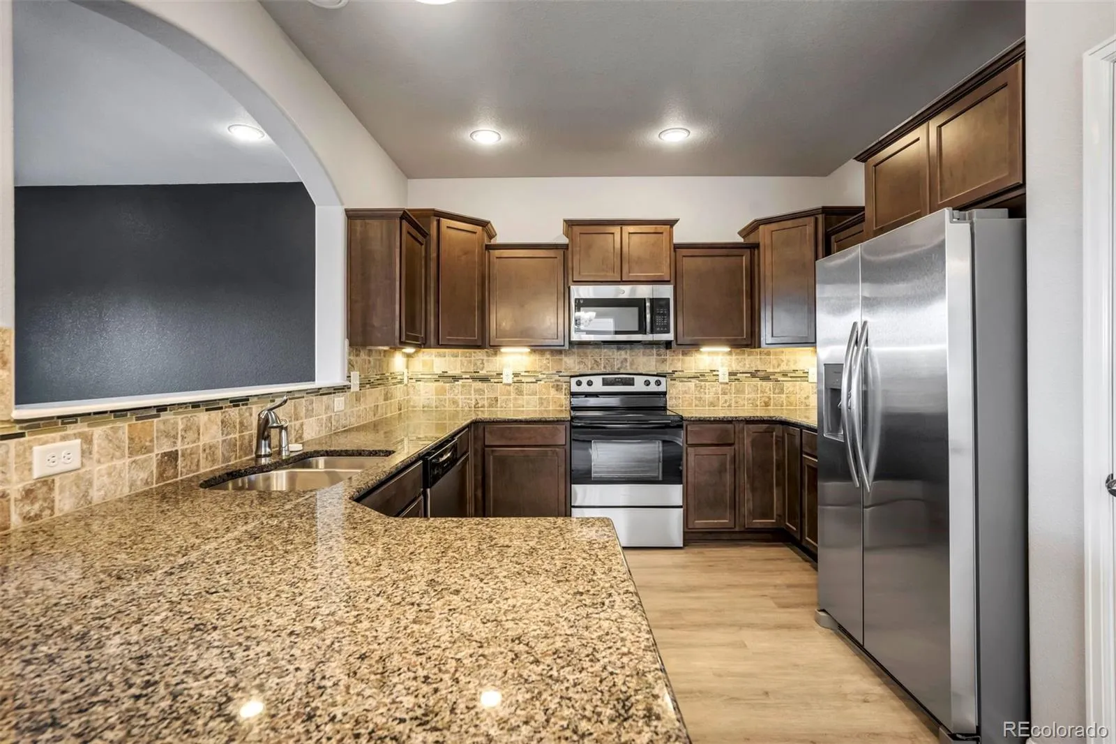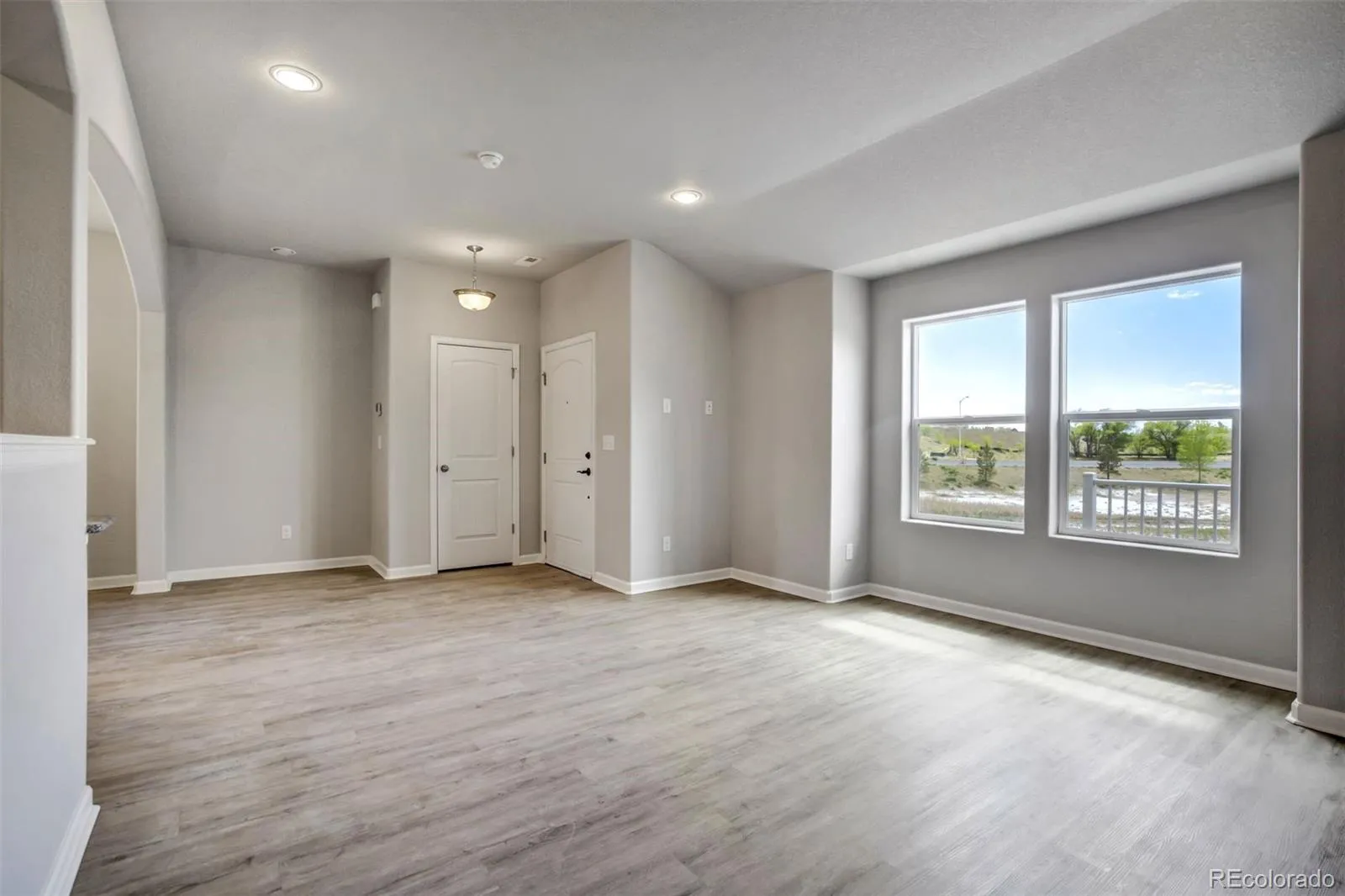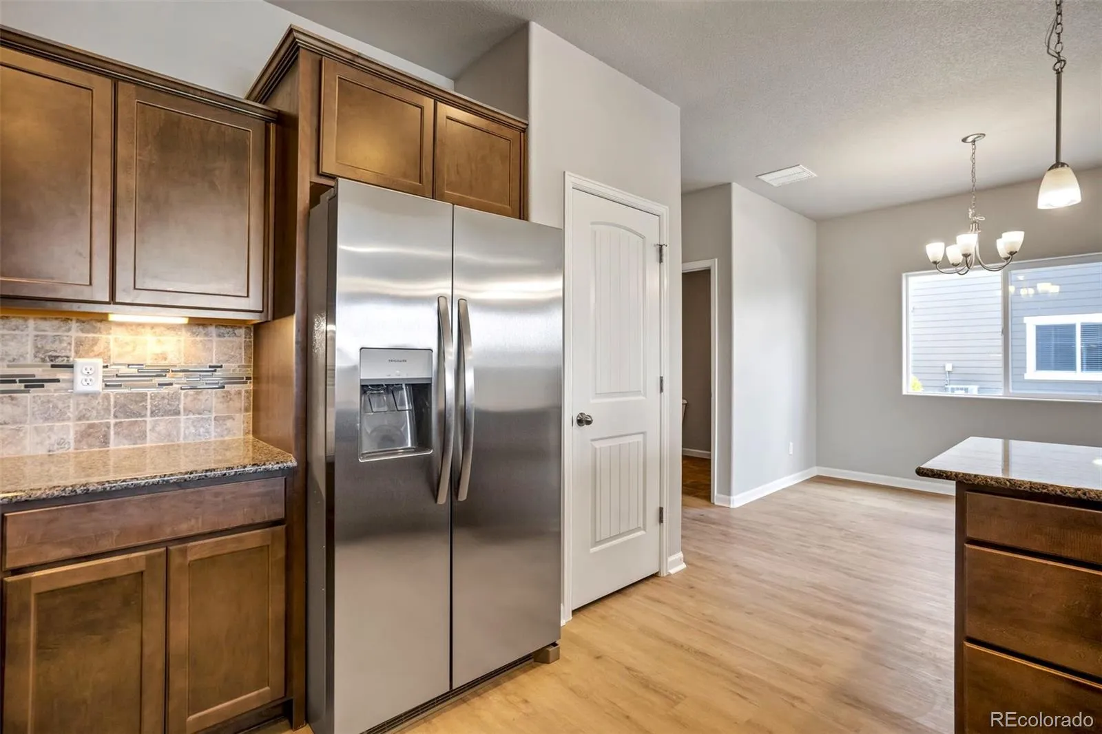 The main level welcomes you with an open, airy layout filled with natural light, making it ideal for everyday living and entertaining. A large front-facing window frames scenic mountain views, adding a special touch. The kitchen is well-appointed with granite countertops, staggered cabinetry, stainless steel appliances, a pantry, and convenient counter seating—plus plenty of storage. Durable LVT flooring runs throughout the main floor, which also includes a guest powder room and extra storage closets.