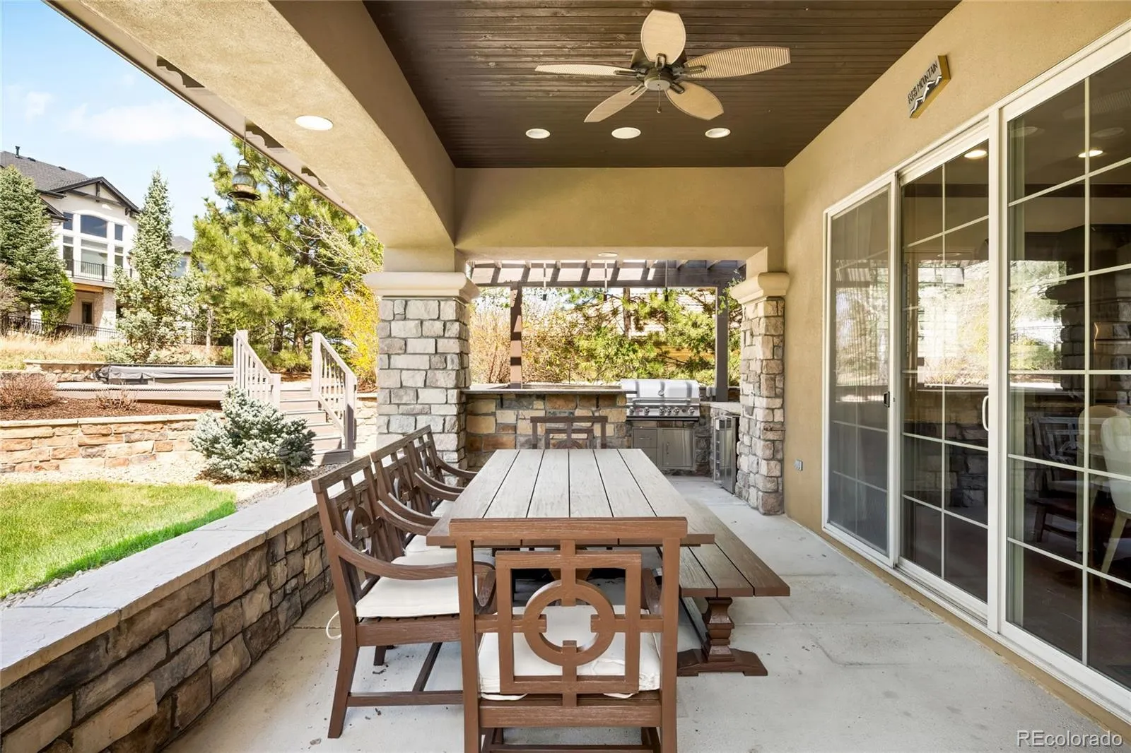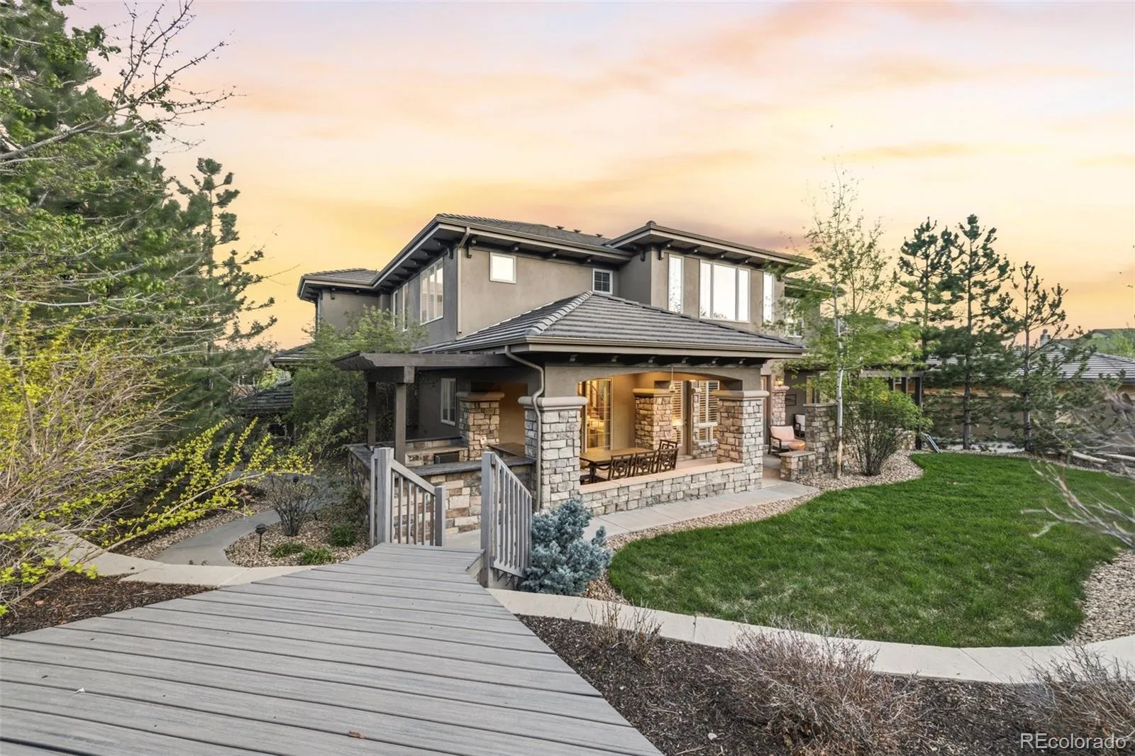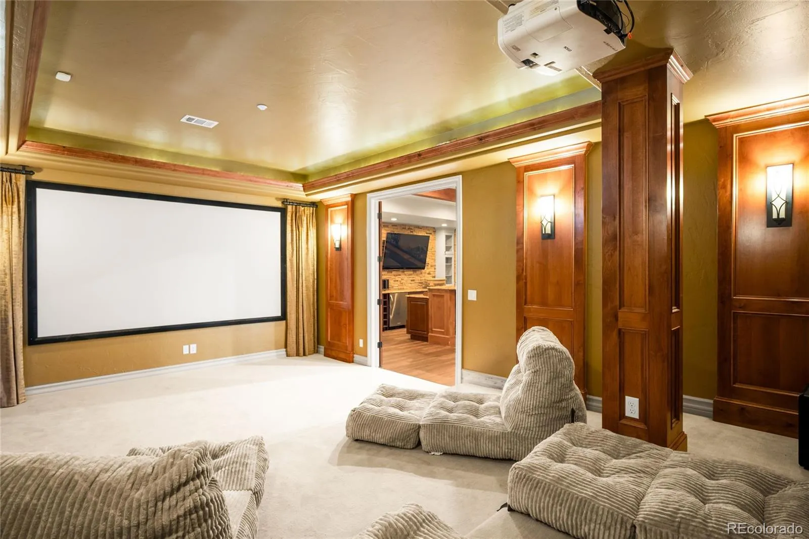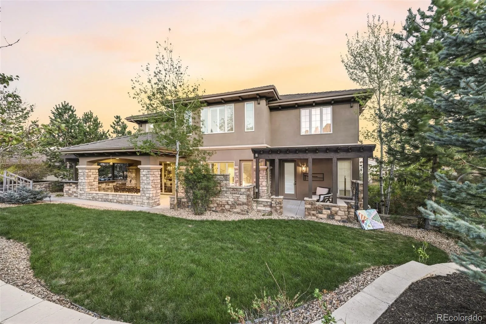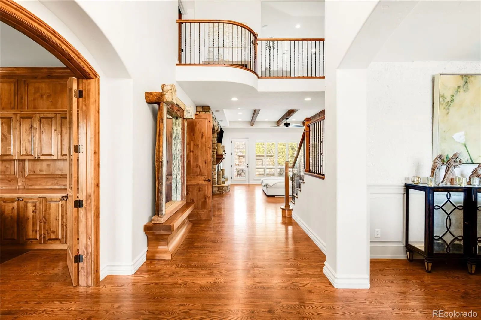 Privacy, scale, and thoughtful design — all set on an expansive 13,000+ square foot homesite backing to a serene greenbelt in a gated community. Inside, a showstopping two-story foyer welcomes residents into a functional floorplan beneath soaring ceilings. Rich wood floors, exposed beams, custom light fixtures, and a striking stone-surround fireplace anchor the main living space with warmth and sophistication. The heart of the home is a spacious kitchen designed for both everyday living and entertaining, featuring a large island, double ovens, a gas cooktop, and a butler’s pantry for seamless hosting. Just beyond, a sunlit formal dining room creates an elegant setting for gatherings, while a beautifully appointed office with extensive built-ins offers both function and style. A thoughtfully redesigned main-floor ensuite bedroom with private patio access provides flexibility for guests or multigenerational living. Upstairs, the primary suite serves as a private retreat, complete with its own balcony capturing sweeping mountain views. Two additional ensuite bedrooms and an open loft create a connected yet distinct upper level. The walk-out lower level expands the living space, offering a dedicated theater room, a stylish bar area, a light-filled recreation room or optional office, an additional ensuite bedroom, and a powder bath. The outdoor experience is equally as compelling as the interior — complete with a hot tub, fire pit, and tranquil natural views.