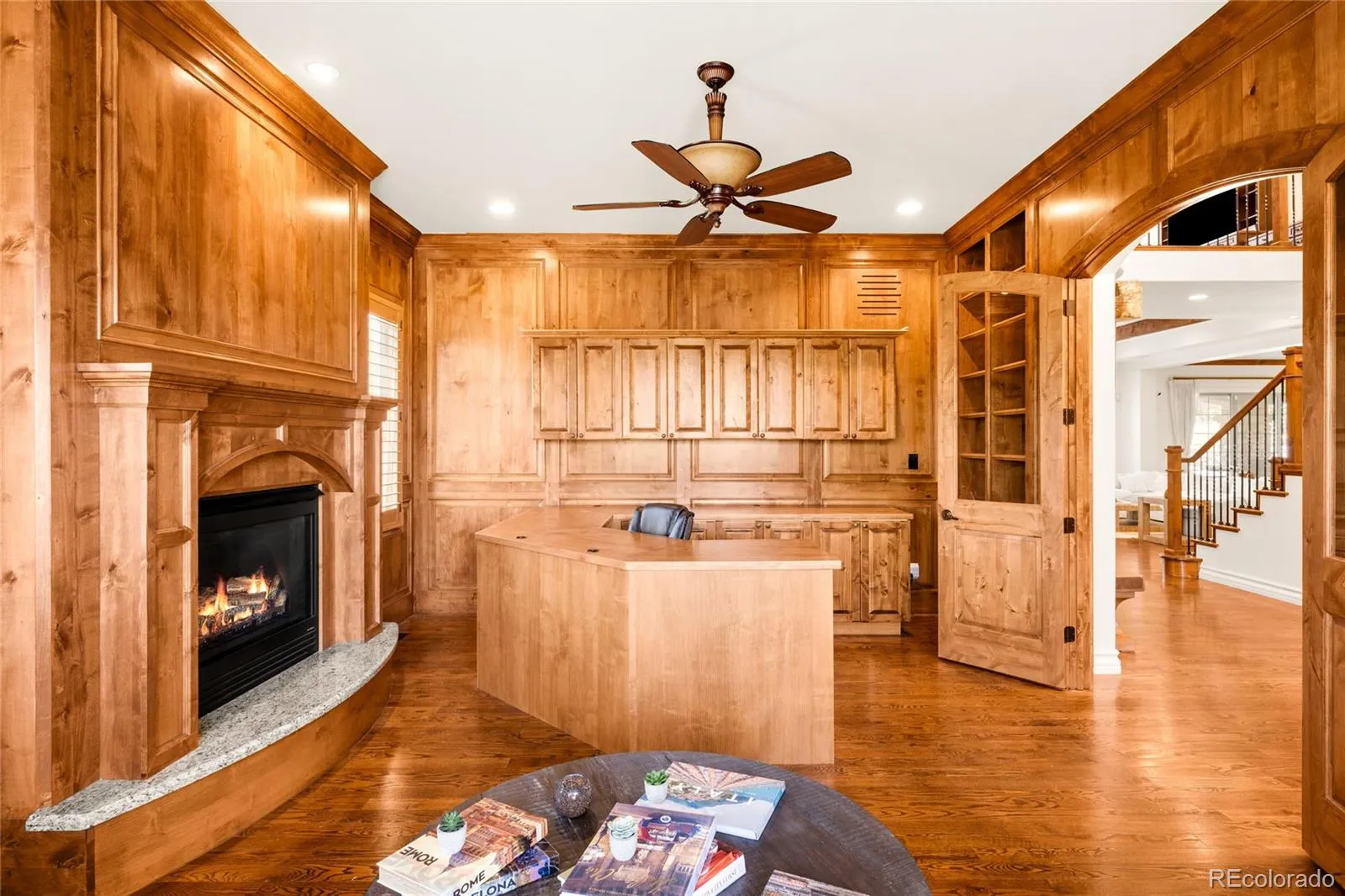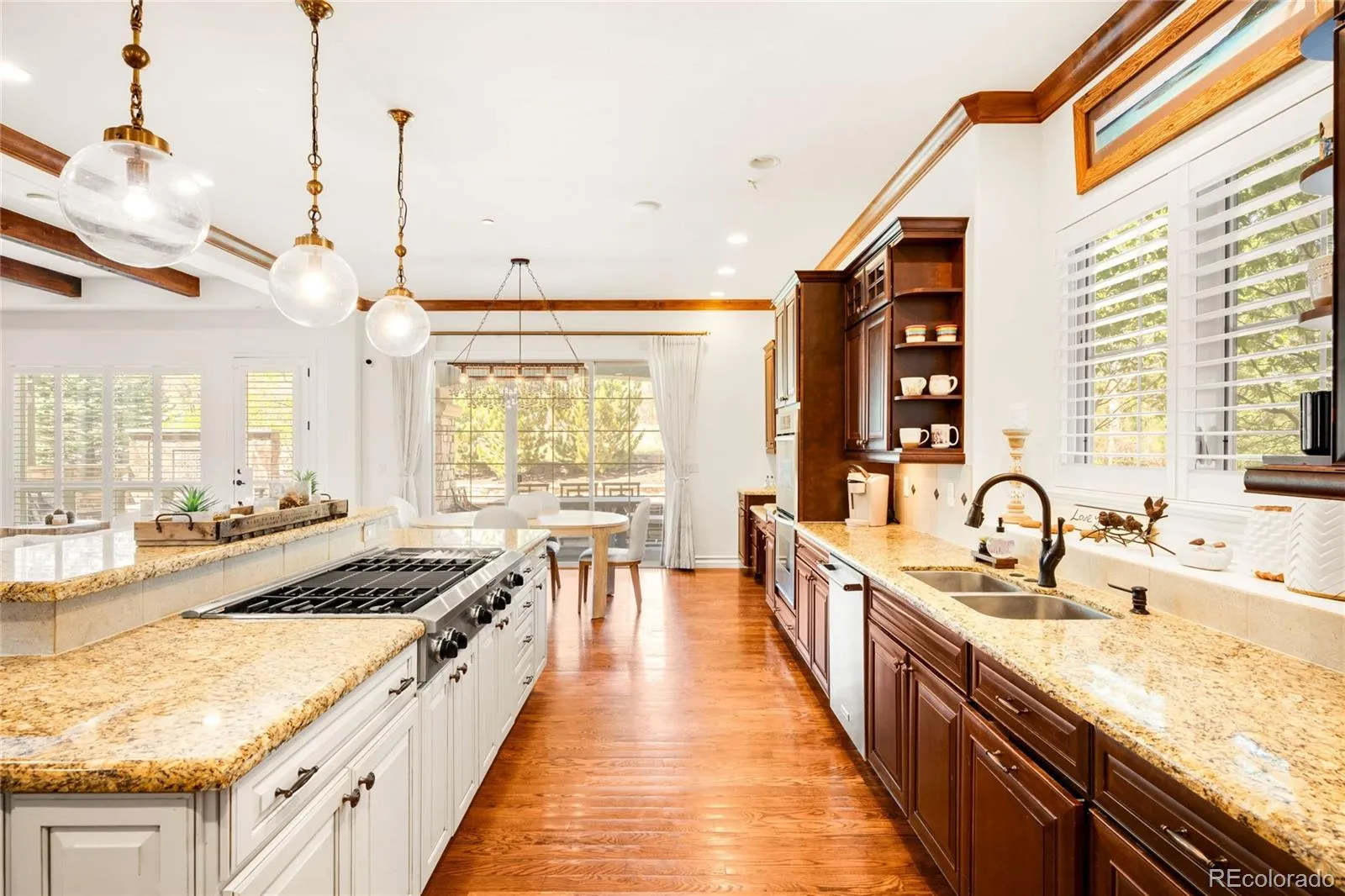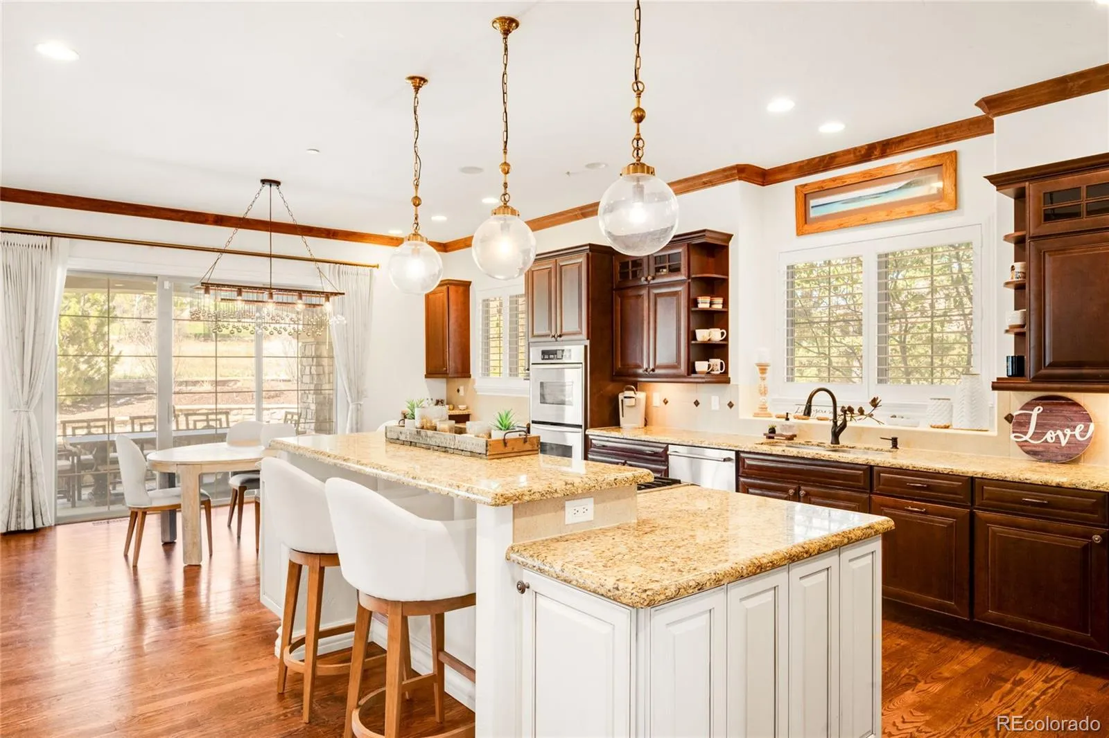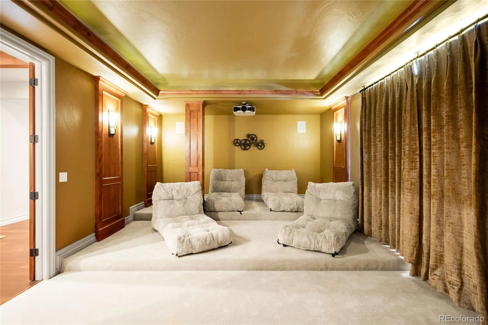 Privacy, scale, and thoughtful design — all set on an expansive 13,000+ square foot homesite backing to a serene greenbelt in a gated community. Inside, a showstopping two-story foyer welcomes residents into a functional floorplan beneath soaring ceilings. Rich wood floors, exposed beams, custom light fixtures, and a striking stone-surround fireplace anchor the main living space with warmth and sophistication. The heart of the home is a spacious kitchen designed for both everyday living and entertaining, featuring a large island, double ovens, a gas cooktop, and a butler’s pantry for seamless hosting. Just beyond, a sunlit formal dining room creates an elegant setting for gatherings, while a beautifully appointed office with extensive built-ins offers both function and style. A thoughtfully redesigned main-floor ensuite bedroom with private patio access provides flexibility for guests or multigenerational living. Upstairs, the primary suite serves as a private retreat, complete with its own balcony capturing sweeping mountain views. Two additional ensuite bedrooms and an open loft create a connected yet distinct upper level. The walk-out lower level expands the living space, offering a dedicated theater room, a stylish bar area, a light-filled recreation room or optional office, an additional ensuite bedroom, and a powder bath. The outdoor experience is equally as compelling as the interior — complete with a hot tub, fire pit, and tranquil natural views.