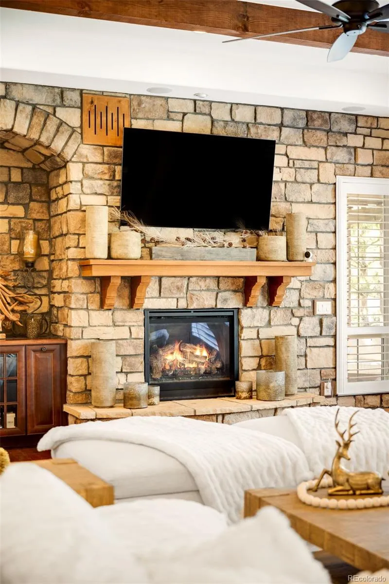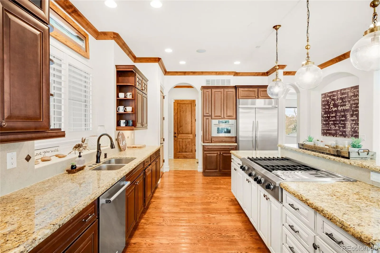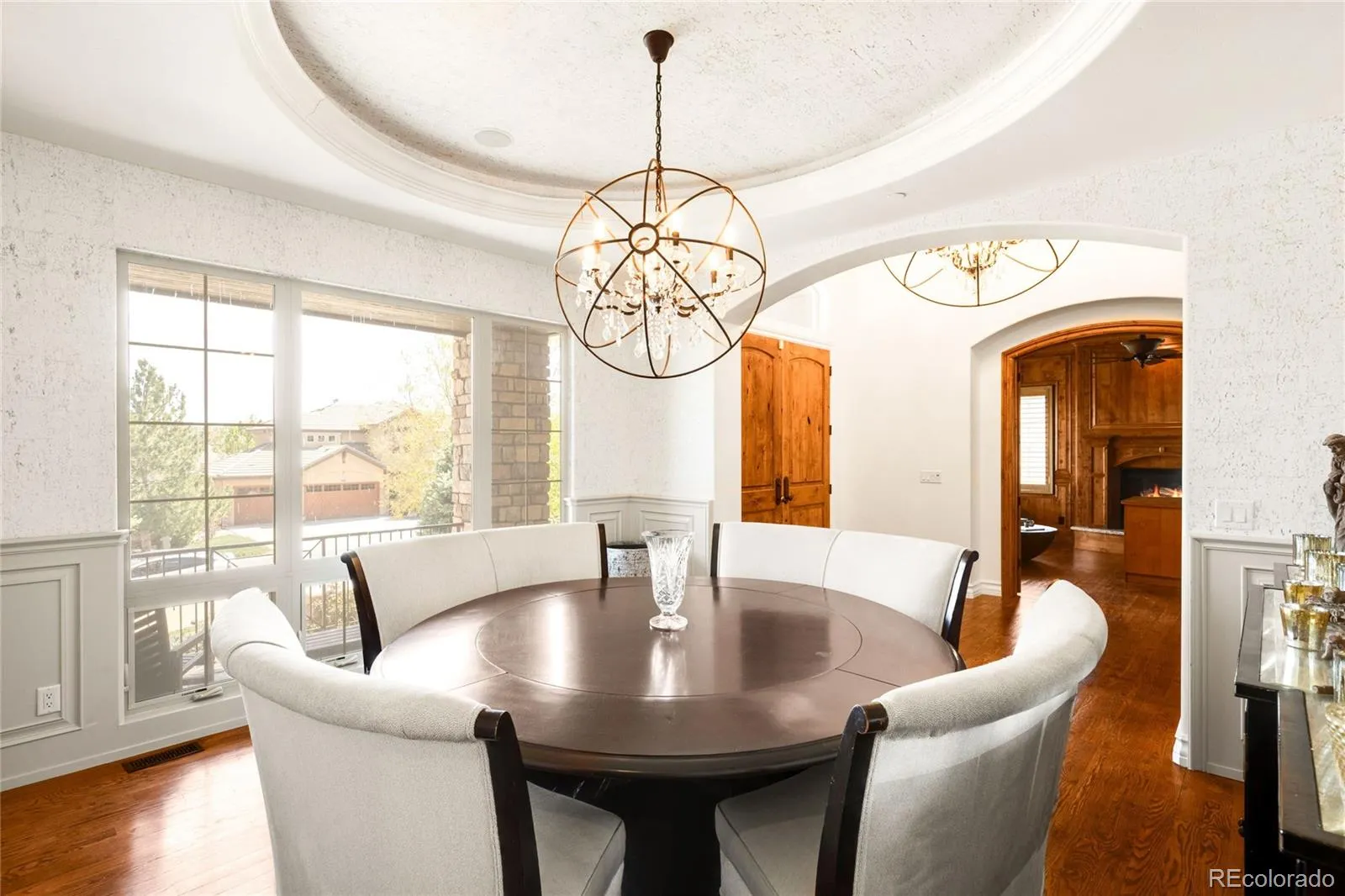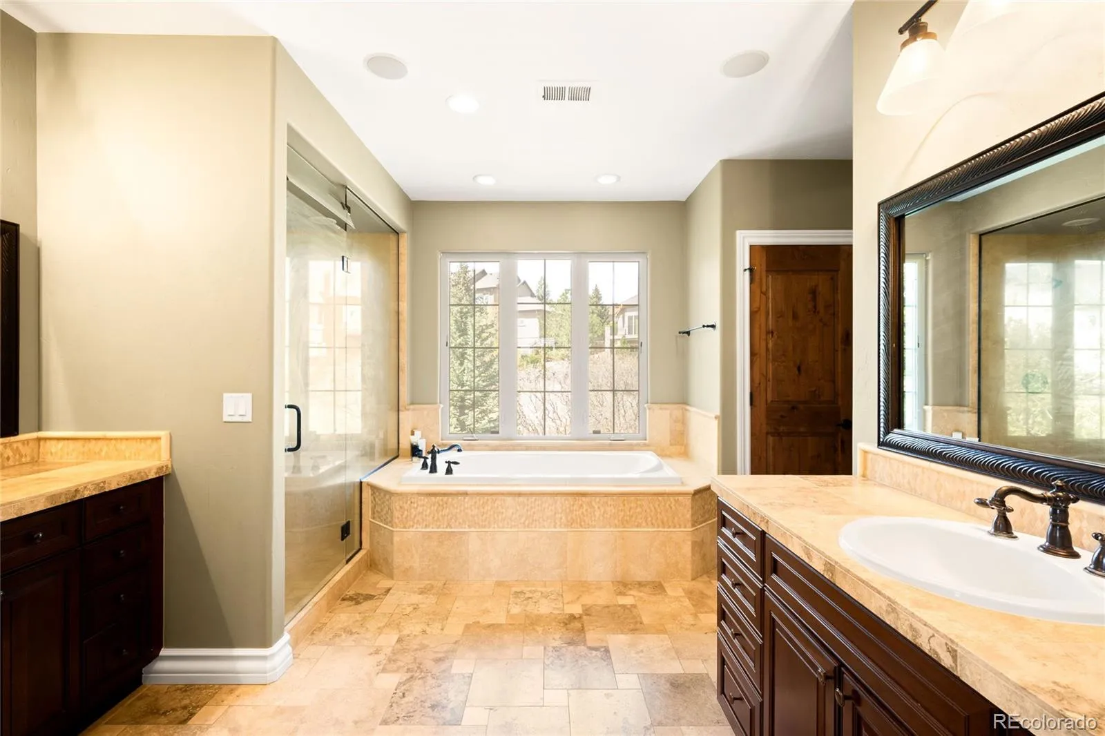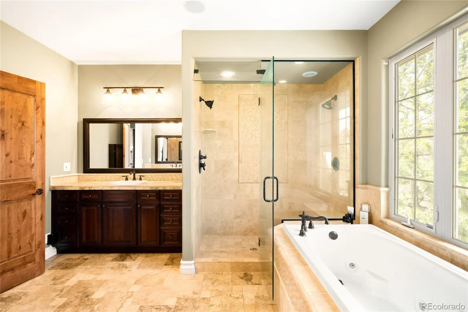 Privacy, scale, and thoughtful design — all set on an expansive 13,000+ square foot homesite backing to a serene greenbelt in a gated community. Inside, a showstopping two-story foyer welcomes residents into a functional floorplan beneath soaring ceilings. Rich wood floors, exposed beams, custom light fixtures, and a striking stone-surround fireplace anchor the main living space with warmth and sophistication. The heart of the home is a spacious kitchen designed for both everyday living and entertaining, featuring a large island, double ovens, a gas cooktop, and a butler’s pantry for seamless hosting. Just beyond, a sunlit formal dining room creates an elegant setting for gatherings, while a beautifully appointed office with extensive built-ins offers both function and style. A thoughtfully redesigned main-floor ensuite bedroom with private patio access provides flexibility for guests or multigenerational living. Upstairs, the primary suite serves as a private retreat, complete with its own balcony capturing sweeping mountain views. Two additional ensuite bedrooms and an open loft create a connected yet distinct upper level. The walk-out lower level expands the living space, offering a dedicated theater room, a stylish bar area, a light-filled recreation room or optional office, an additional ensuite bedroom, and a powder bath. The outdoor experience is equally as compelling as the interior — complete with a hot tub, fire pit, and tranquil natural views.