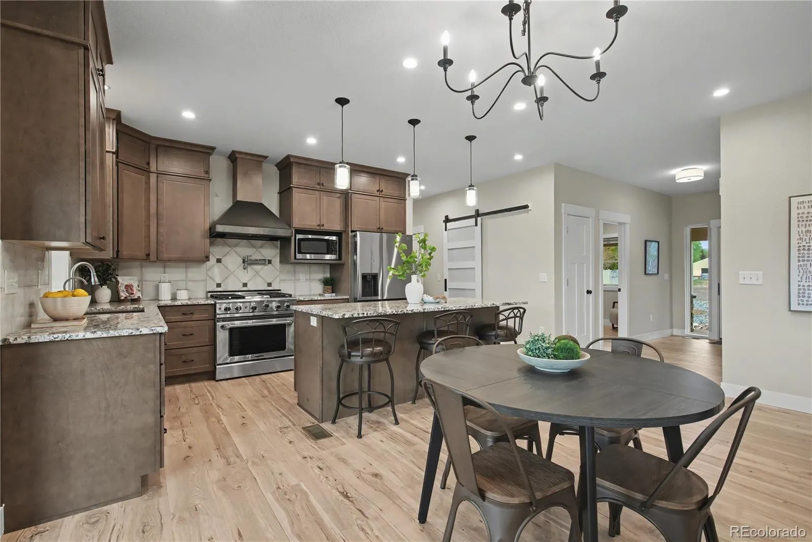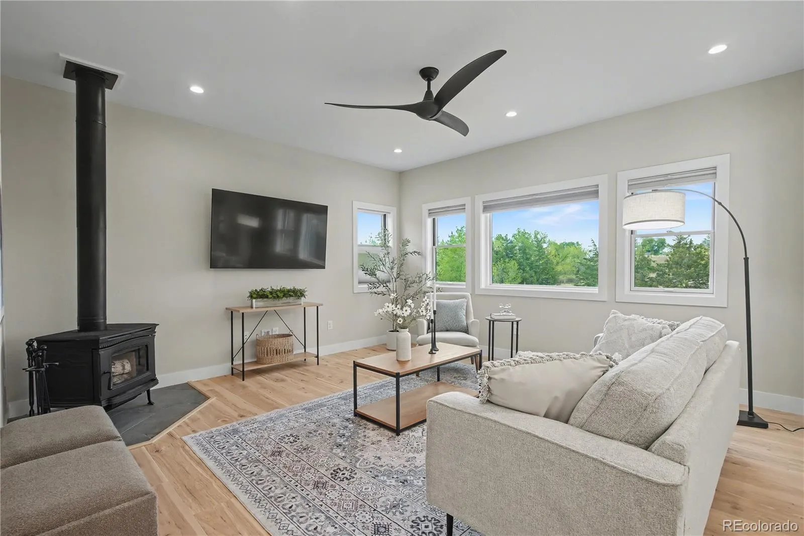A cozy wood-burning stove in the living room creates warmth and ambiance, perfect for cooler evenings. The kitchen includes an island with eat-at seating, high end cabinets, and appliances.