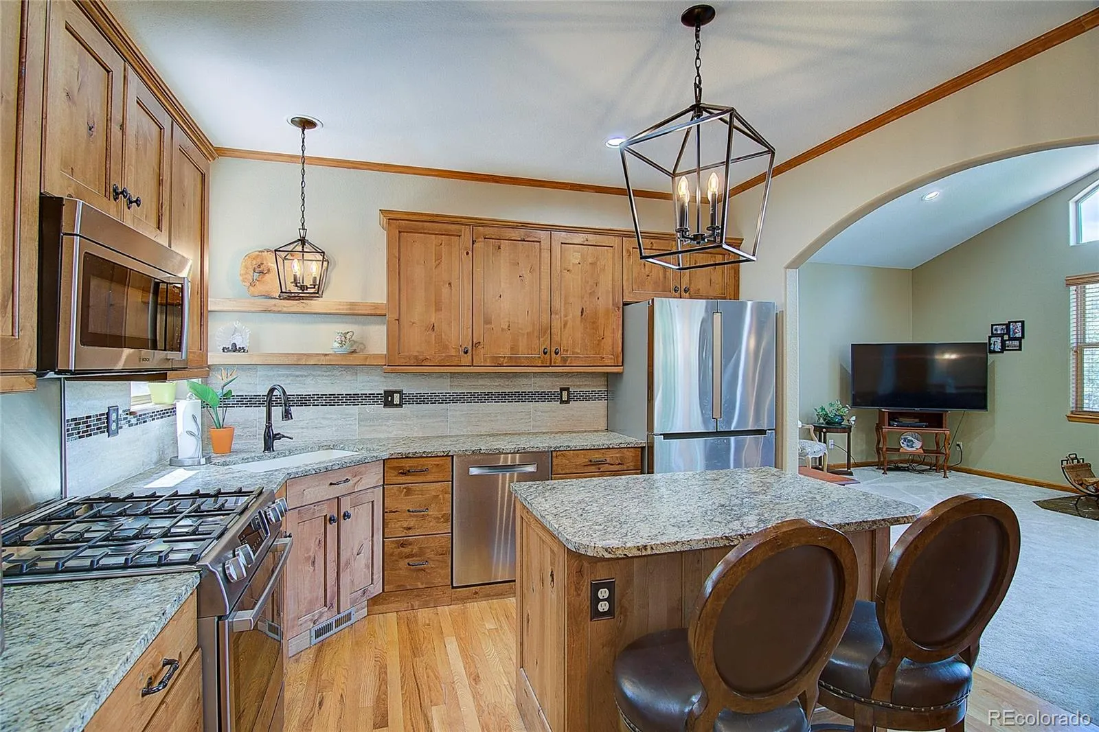 This Raised Ranch Home features 3 bedroom and 3 baths anchored by a spacious, light-filled living room with expansive view windows that frame the landscape and invite the outdoors in. The thoughtfully updated kitchen is both elegant and functional, featuring rich alder cabinetry, leathered granite countertops with a generous serving bar, premium Bosch appliances, and a gas cooktop paired with an electric convection oven—ideal for both everyday living and entertaining. Hardwood flooring and French doors enhances the kitchen and dining area.