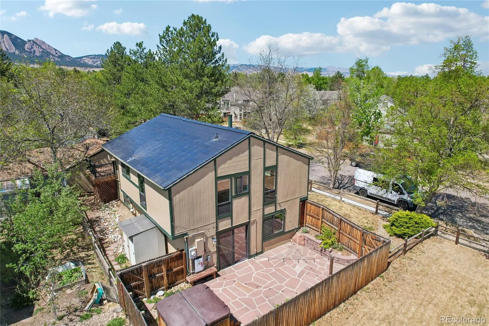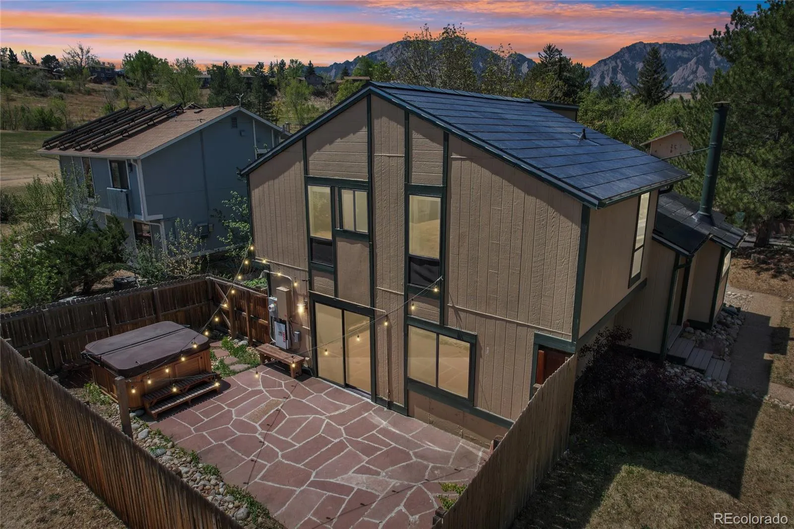Experience the perfect blend of modern sustainability and classic Boulder charm in this stunning home located on a quiet cul-de-sac in the highly sought-after Table Mesa neighborhood. Situated on an expansive corner lot, this home welcomes you into a spacious main floor defined by soaring vaulted ceilings, tongue-and-groove wood details, and massive windows that frame the natural beauty of the surroundings. A cozy wood-burning stove anchors the living area, creating an inviting atmosphere that flows seamlessly upward into the open-concept kitchen and dining space. The kitchen is well-appointed with stainless steel appliances and granite countertops, while the adjacent dining area opens to a large deck, the ultimate setting for effortless indoor-outdoor living. The upper level hosts a private primary bedroom with en-suite access to a full bath, plus an additional bright bedroom. The home’s flexible layout continues to the lower level, which features a spacious family room that leads directly out to a patio, perfect for relaxing or entertaining. Two additional bedrooms, a full bath, and a convenient laundry closet round out the lower level. Step outside to enjoy Colorado’s sunshine in multiple outdoor spaces, including a high-end, low-maintenance saltwater hot tub that offers the perfect way to unwind after a day in the mountains. This home is as smart as it is beautiful, featuring a 2021 solar roof installation complete with a battery backup system. The robust solar generation and efficient design allow the house to essentially run off-grid during the summer months, while the battery provides peace of mind during power outages. With the detached 2-car garage and an unbeatable location, you are surrounded by Boulder’s premier parks and outdoor recreation. Minutes away from Highway 36, you enjoy an easy commute and quick access to some of Boulder’s best dining and shopping, making this the ideal Foothills home.