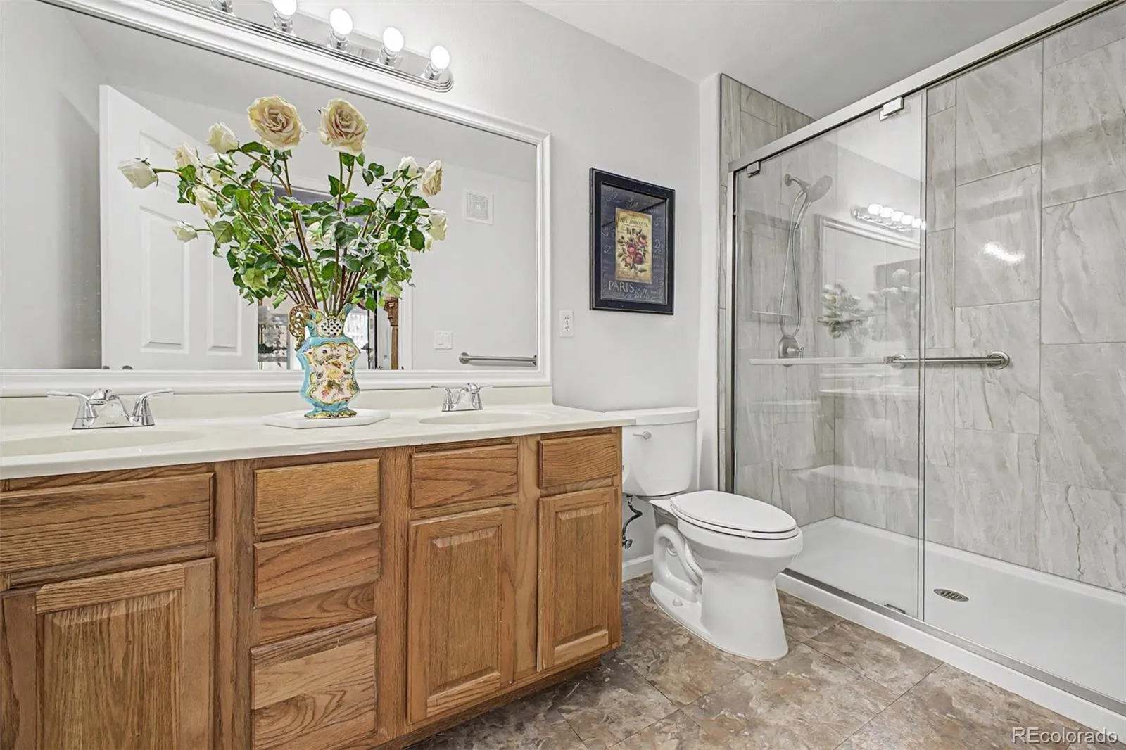 The spacious primary suite offers a beautifully remodeled 3/4 bath with updated shower, glass door, tile finishes, double vanity, new toilet, and a large walk-in closet with built-ins. A second bedroom and full bath provide flexibility for guests, office space, or roommates. Additional upgrades include newer washer and dryer (2021), water heater (2023), updated fixtures, and added storage.