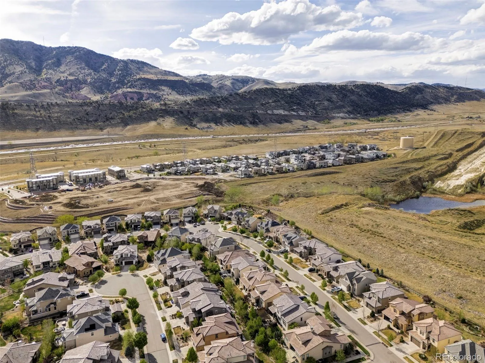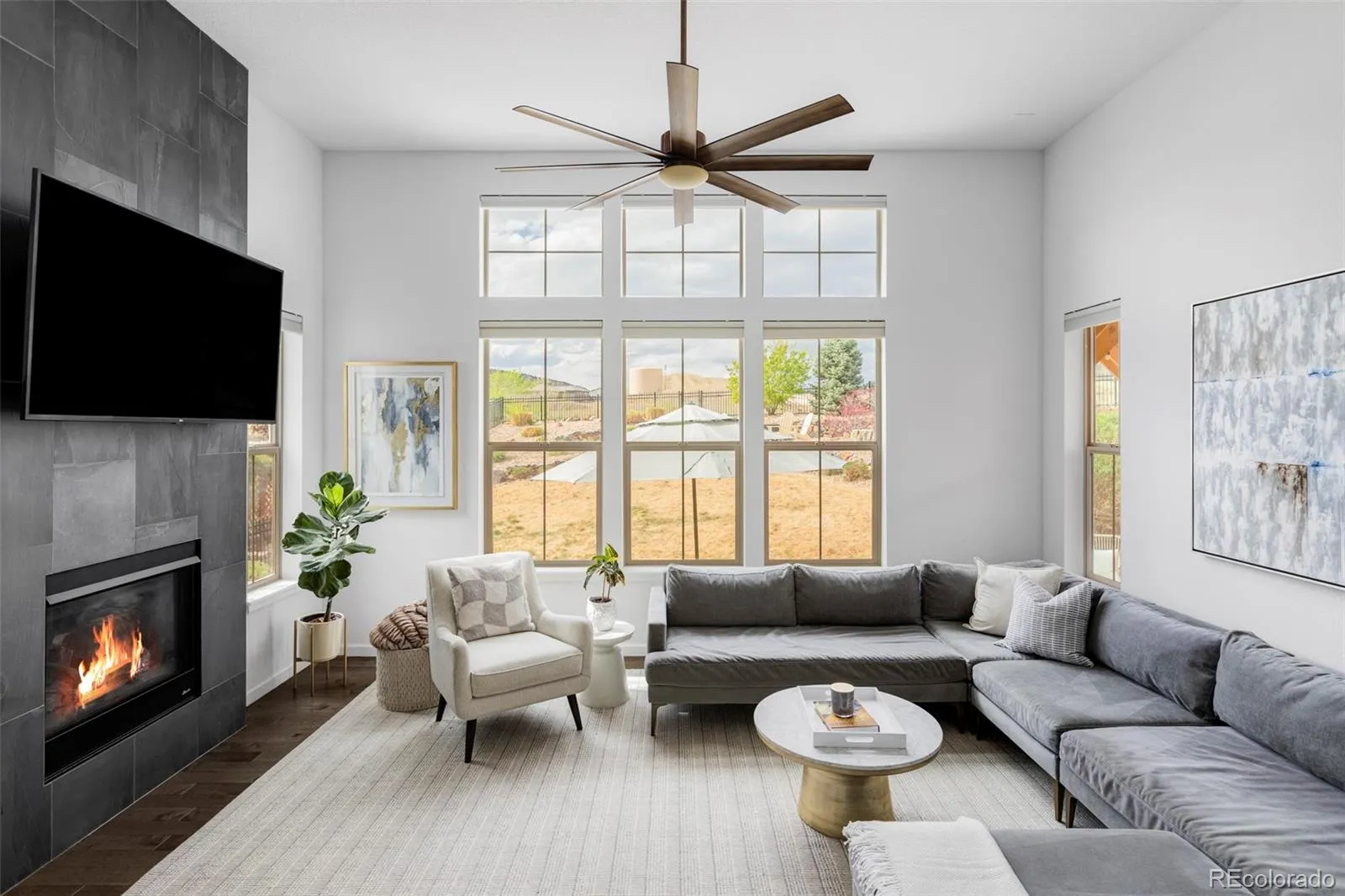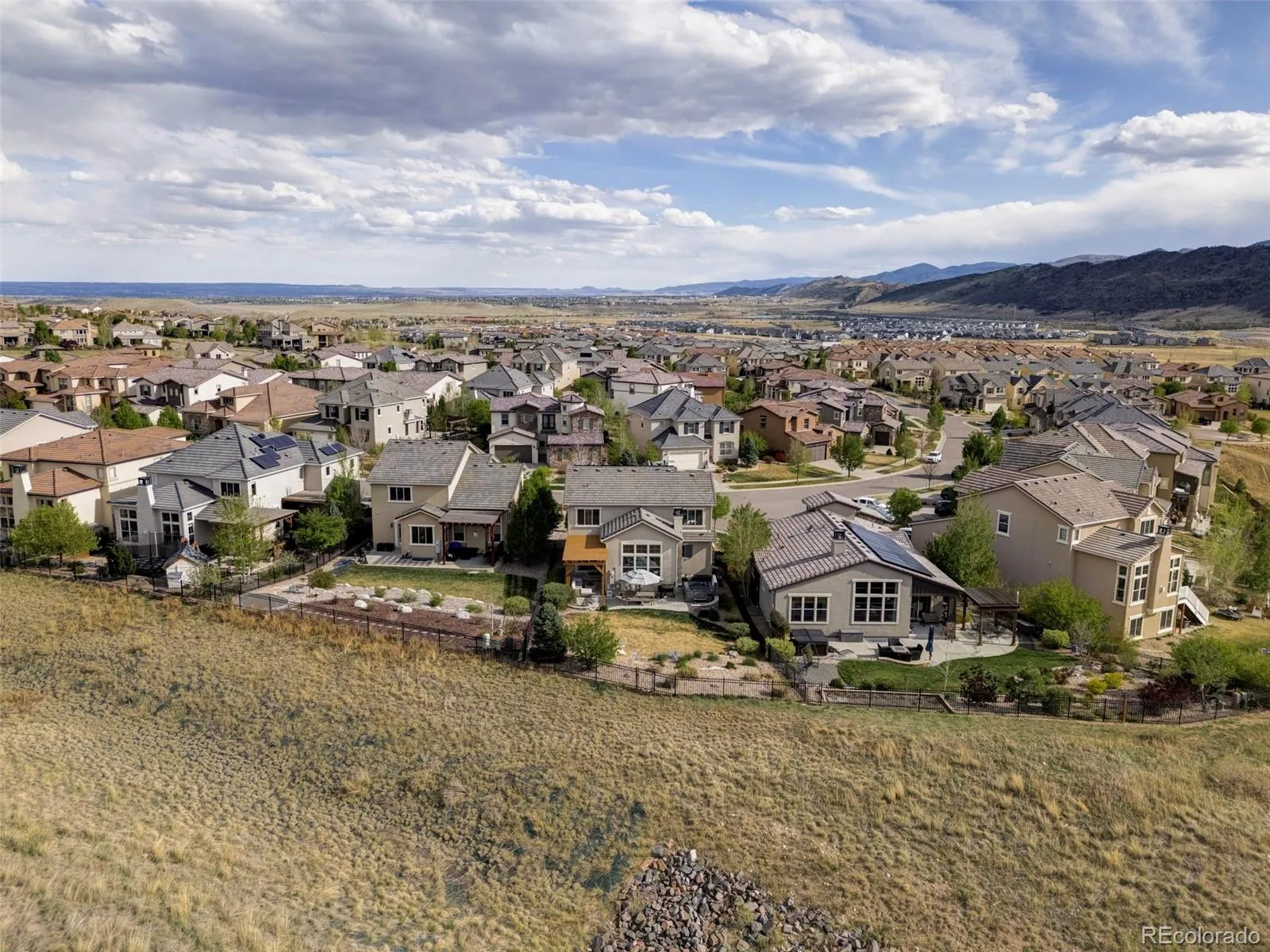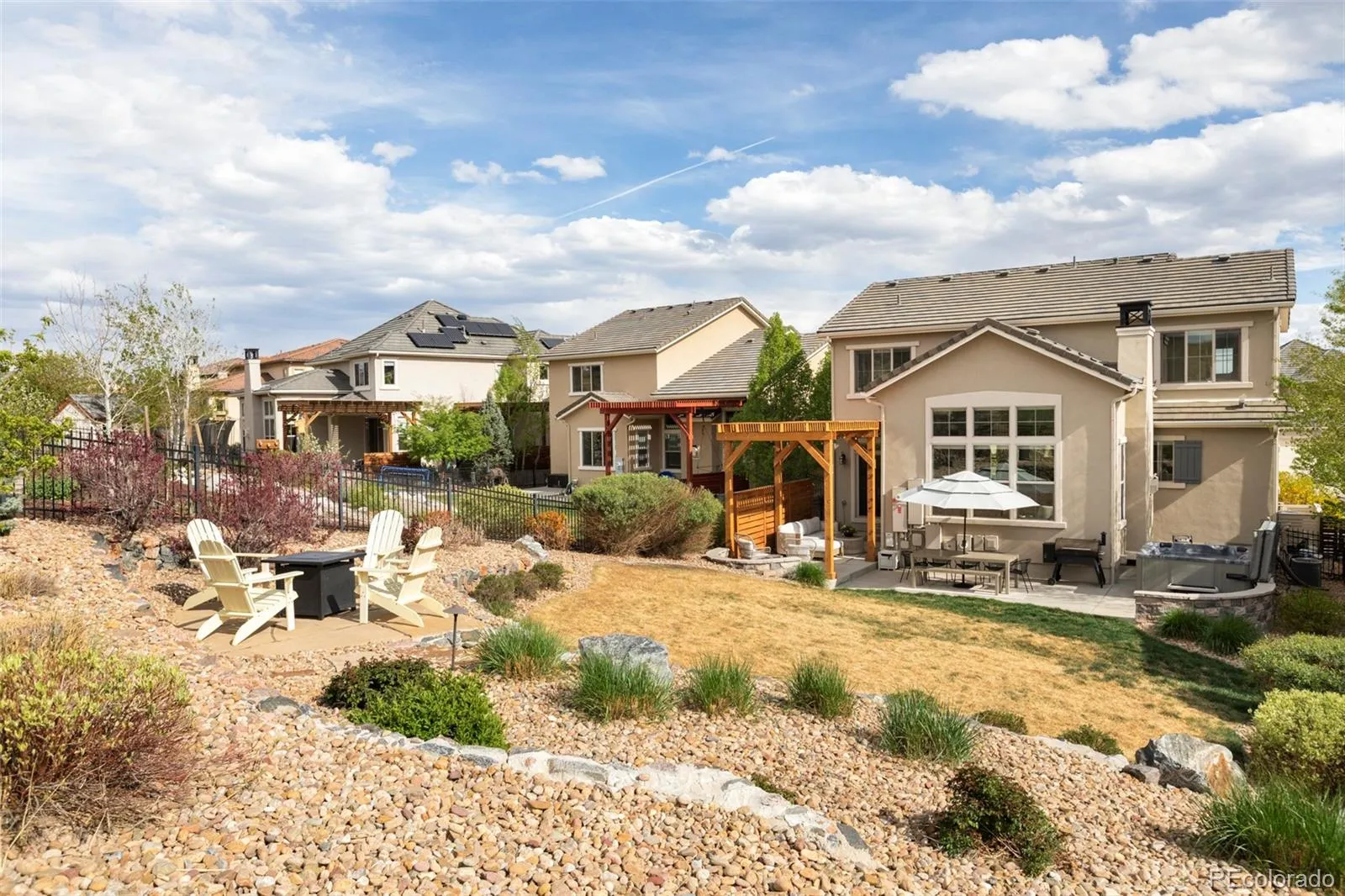 Framed by sweeping mountain vistas, this impeccably maintained Solterra residence offers a refined balance of elegance, efficiency and Colorado-inspired outdoor living. Set on a generous lot with owned solar and a durable tile roof, this home welcomes with an inviting front patio and a bright office behind glass French doors. The open main level is anchored by a dramatic floor-to-ceiling fireplace, while a sunlit dining area flows seamlessly to an expansive patio with pergola and hot tub — perfect for entertaining beneath mountain skies. The kitchen is both stylish and functional with a center island, crisp white cabinetry and stainless steel appliances. Upstairs, the serene primary suite features a five-piece bath designed for relaxation. A finished basement adds versatility with a rec room, guest bedroom and bath. An attached two-car garage adds ample storage. With captivating views, thoughtful design and proximity to trails and amenities, this home delivers elevated living in Lakewood.