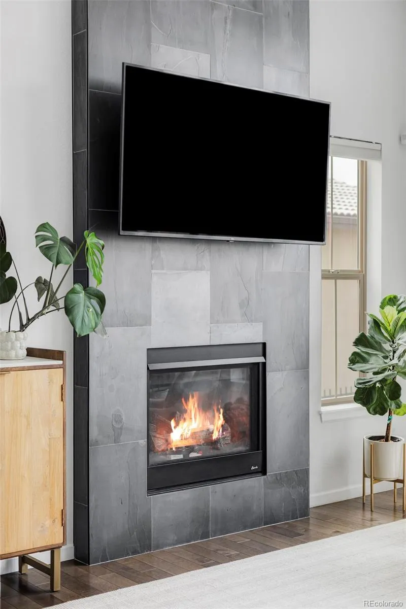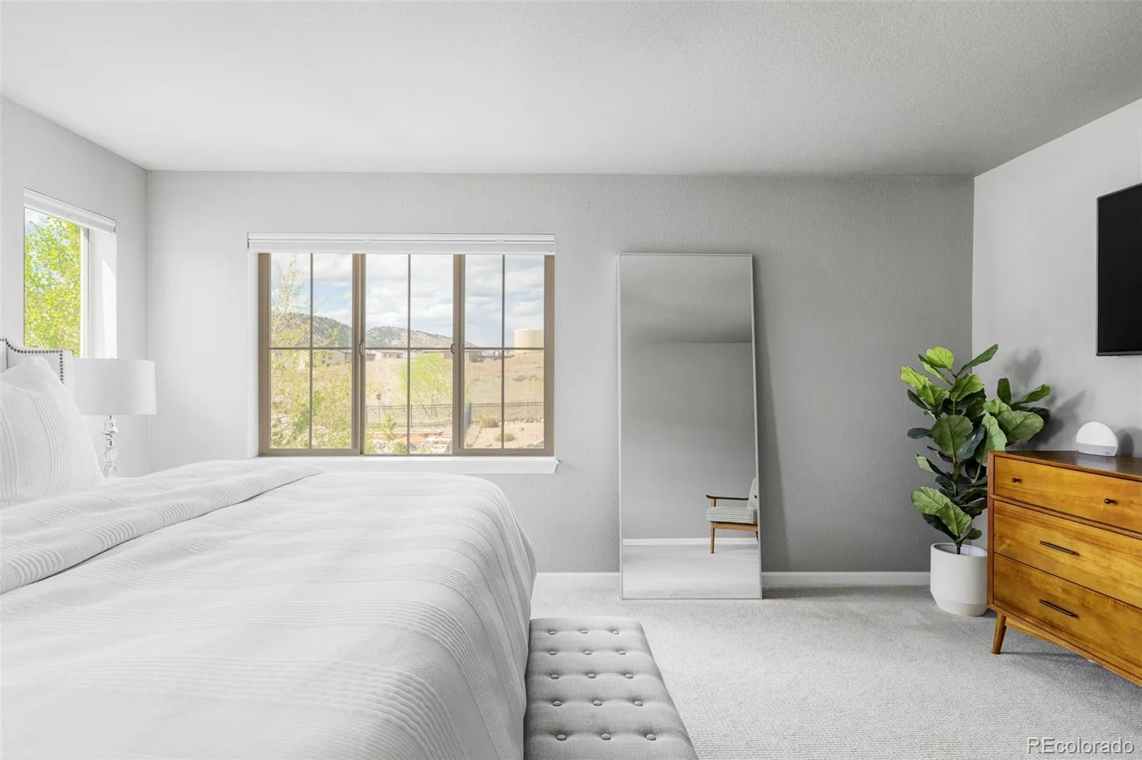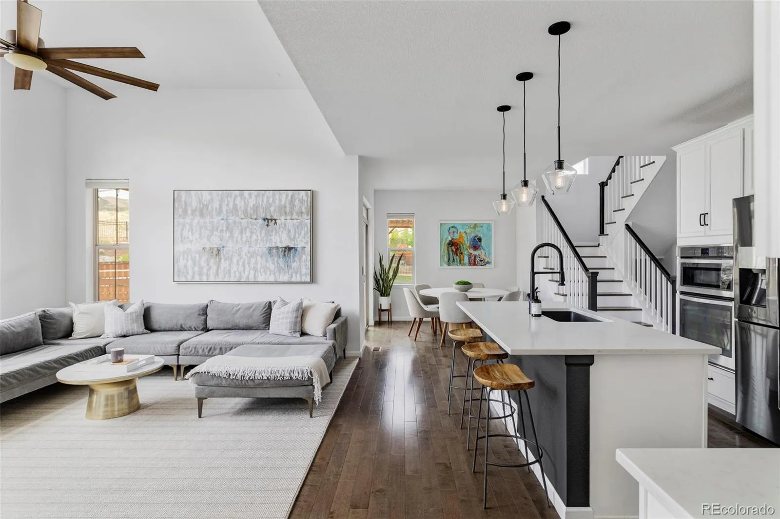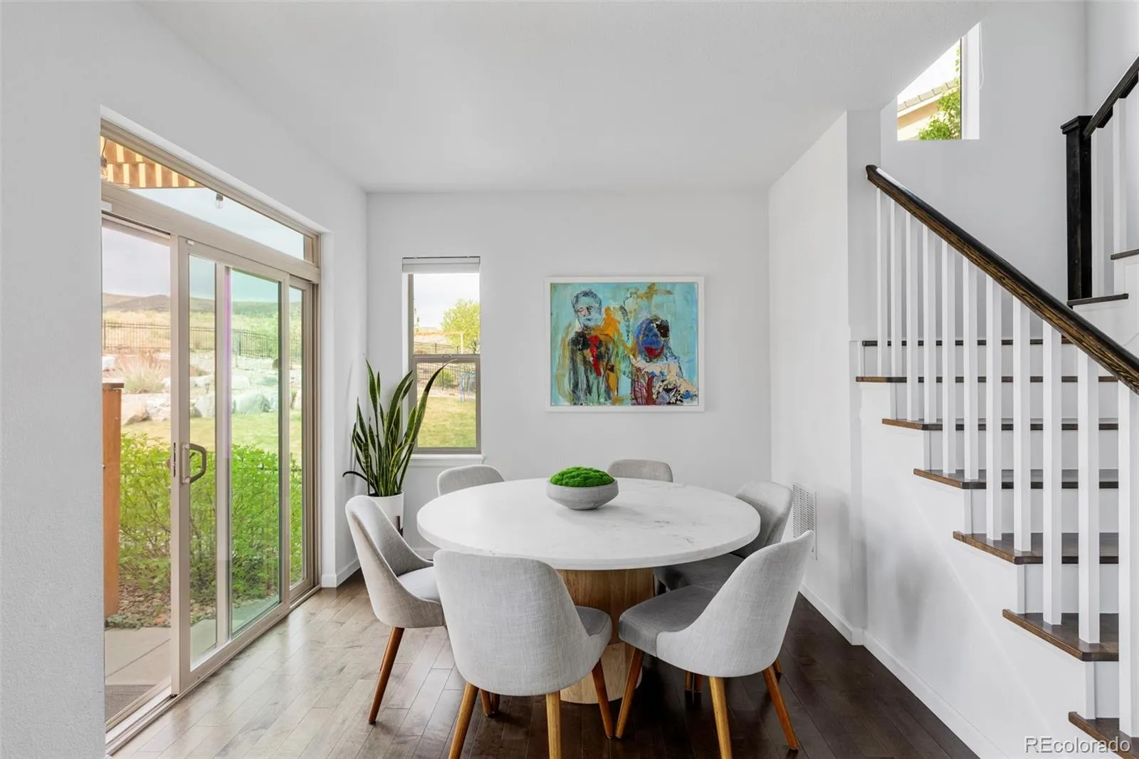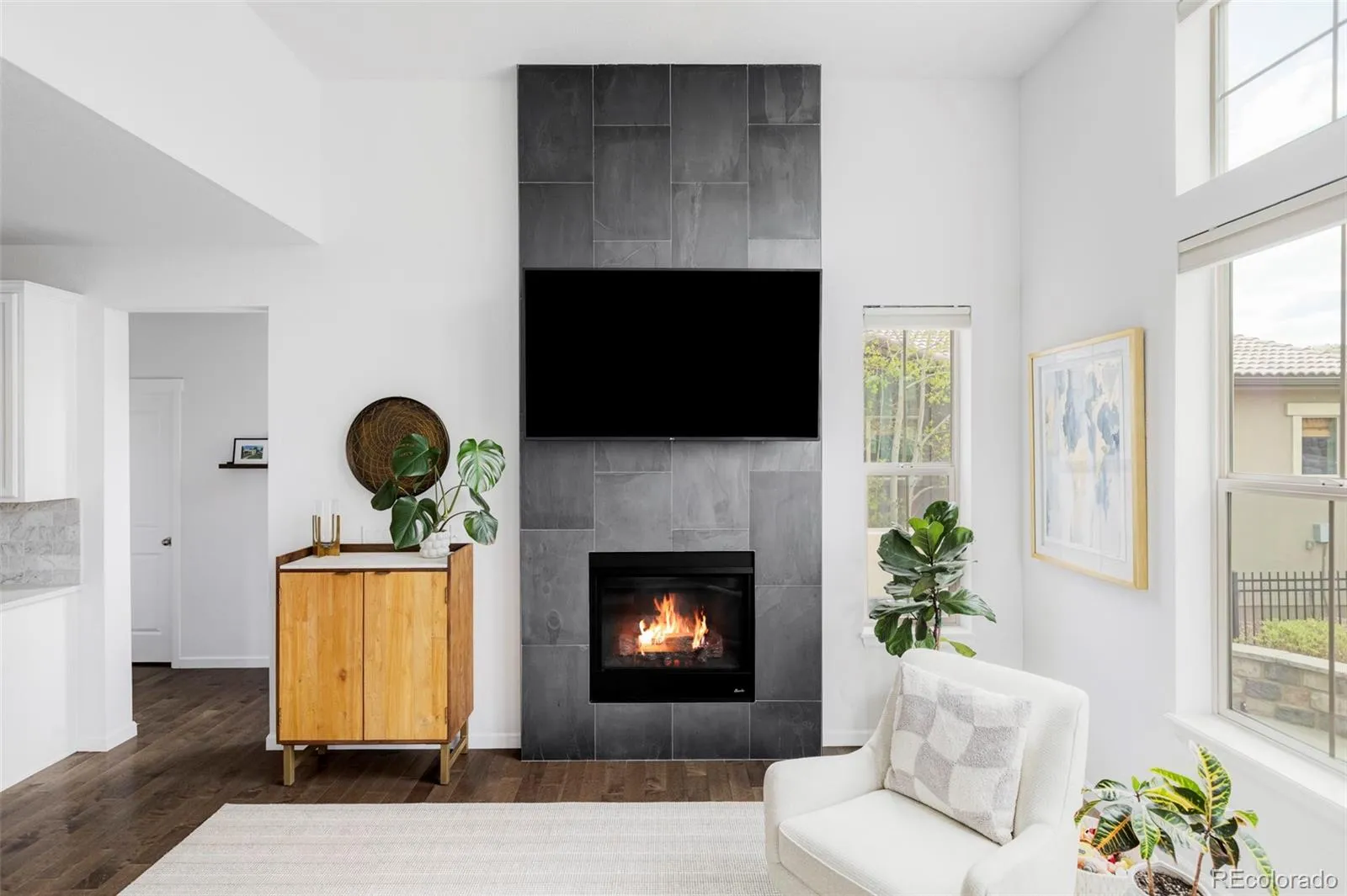 Framed by sweeping mountain vistas, this impeccably maintained Solterra residence offers a refined balance of elegance, efficiency and Colorado-inspired outdoor living. Set on a generous lot with owned solar and a durable tile roof, this home welcomes with an inviting front patio and a bright office behind glass French doors. The open main level is anchored by a dramatic floor-to-ceiling fireplace, while a sunlit dining area flows seamlessly to an expansive patio with pergola and hot tub — perfect for entertaining beneath mountain skies. The kitchen is both stylish and functional with a center island, crisp white cabinetry and stainless steel appliances. Upstairs, the serene primary suite features a five-piece bath designed for relaxation. A finished basement adds versatility with a rec room, guest bedroom and bath. An attached two-car garage adds ample storage. With captivating views, thoughtful design and proximity to trails and amenities, this home delivers elevated living in Lakewood.