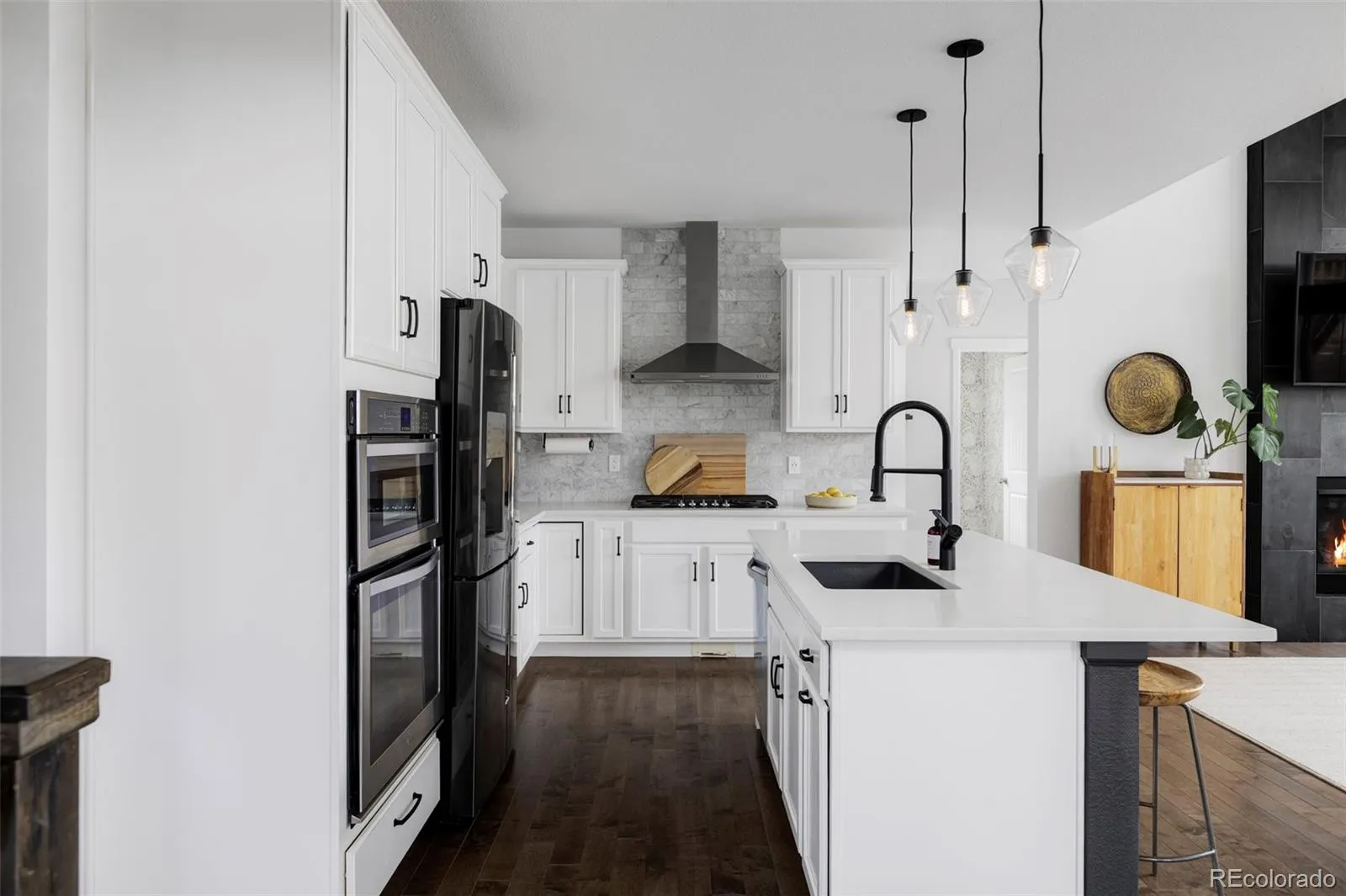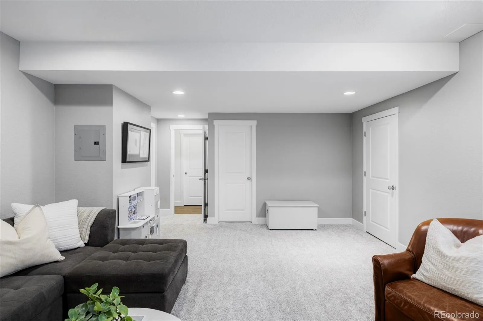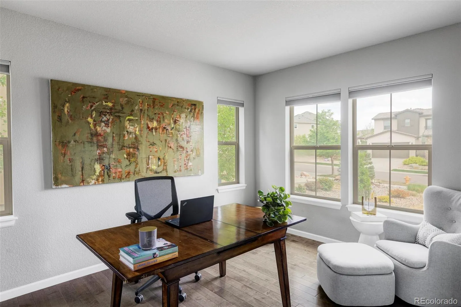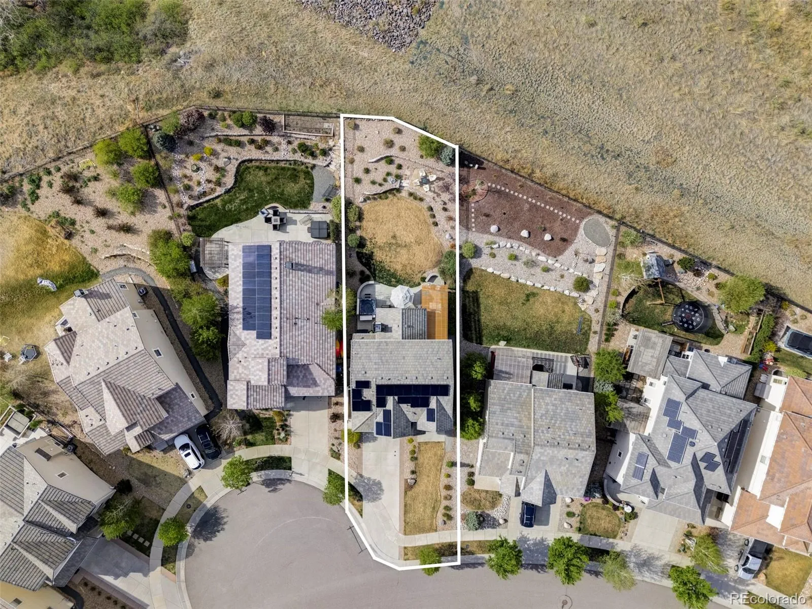 Framed by sweeping mountain vistas, this impeccably maintained Solterra residence offers a refined balance of elegance, efficiency and Colorado-inspired outdoor living. Set on a generous lot with owned solar and a durable tile roof, this home welcomes with an inviting front patio and a bright office behind glass French doors. The open main level is anchored by a dramatic floor-to-ceiling fireplace, while a sunlit dining area flows seamlessly to an expansive patio with pergola and hot tub — perfect for entertaining beneath mountain skies. The kitchen is both stylish and functional with a center island, crisp white cabinetry and stainless steel appliances. Upstairs, the serene primary suite features a five-piece bath designed for relaxation. A finished basement adds versatility with a rec room, guest bedroom and bath. An attached two-car garage adds ample storage. With captivating views, thoughtful design and proximity to trails and amenities, this home delivers elevated living in Lakewood.