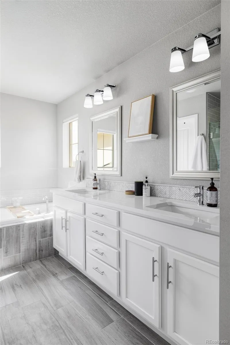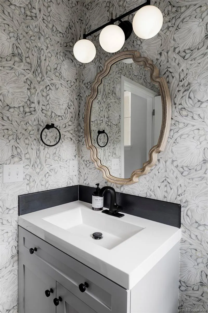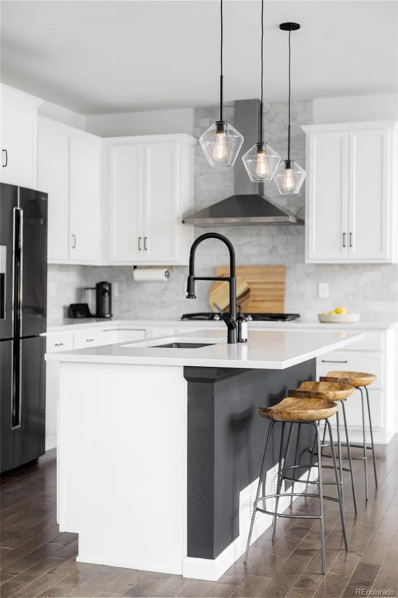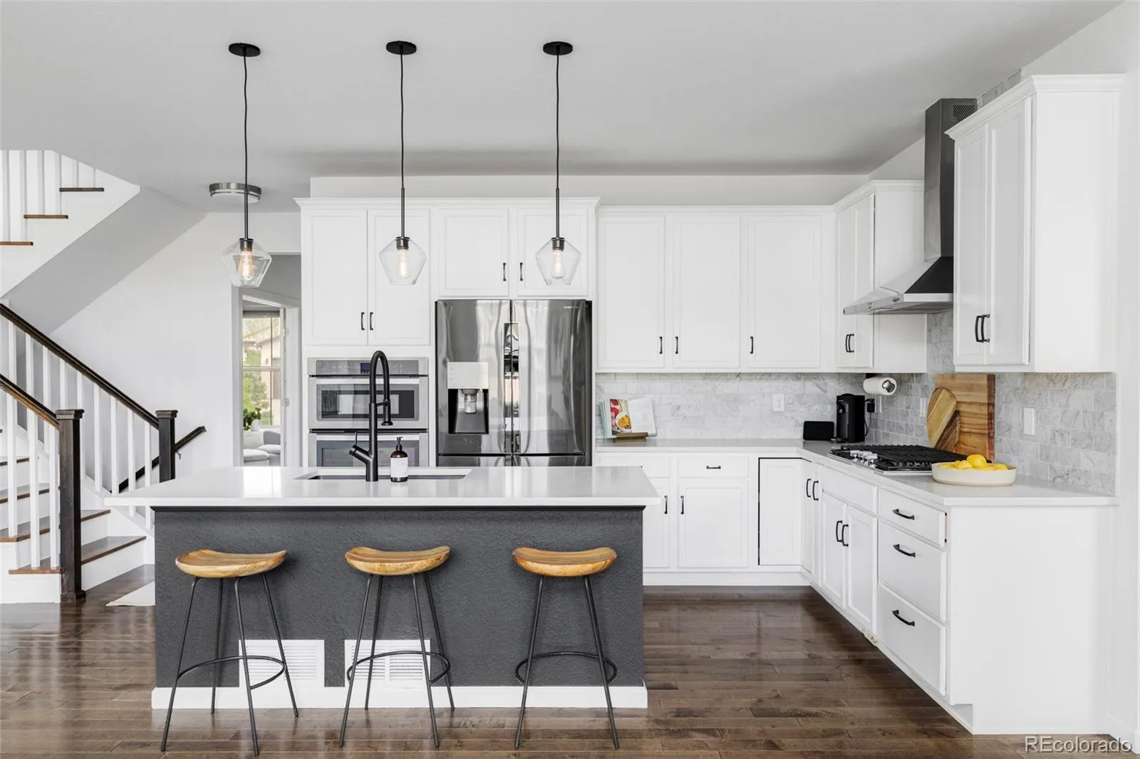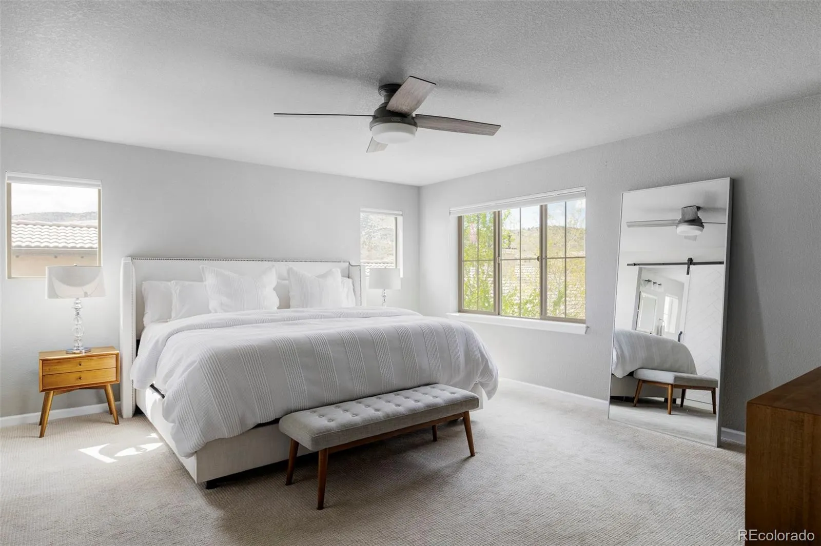 Framed by sweeping mountain vistas, this impeccably maintained Solterra residence offers a refined balance of elegance, efficiency and Colorado-inspired outdoor living. Set on a generous lot with owned solar and a durable tile roof, this home welcomes with an inviting front patio and a bright office behind glass French doors. The open main level is anchored by a dramatic floor-to-ceiling fireplace, while a sunlit dining area flows seamlessly to an expansive patio with pergola and hot tub — perfect for entertaining beneath mountain skies. The kitchen is both stylish and functional with a center island, crisp white cabinetry and stainless steel appliances. Upstairs, the serene primary suite features a five-piece bath designed for relaxation. A finished basement adds versatility with a rec room, guest bedroom and bath. An attached two-car garage adds ample storage. With captivating views, thoughtful design and proximity to trails and amenities, this home delivers elevated living in Lakewood.