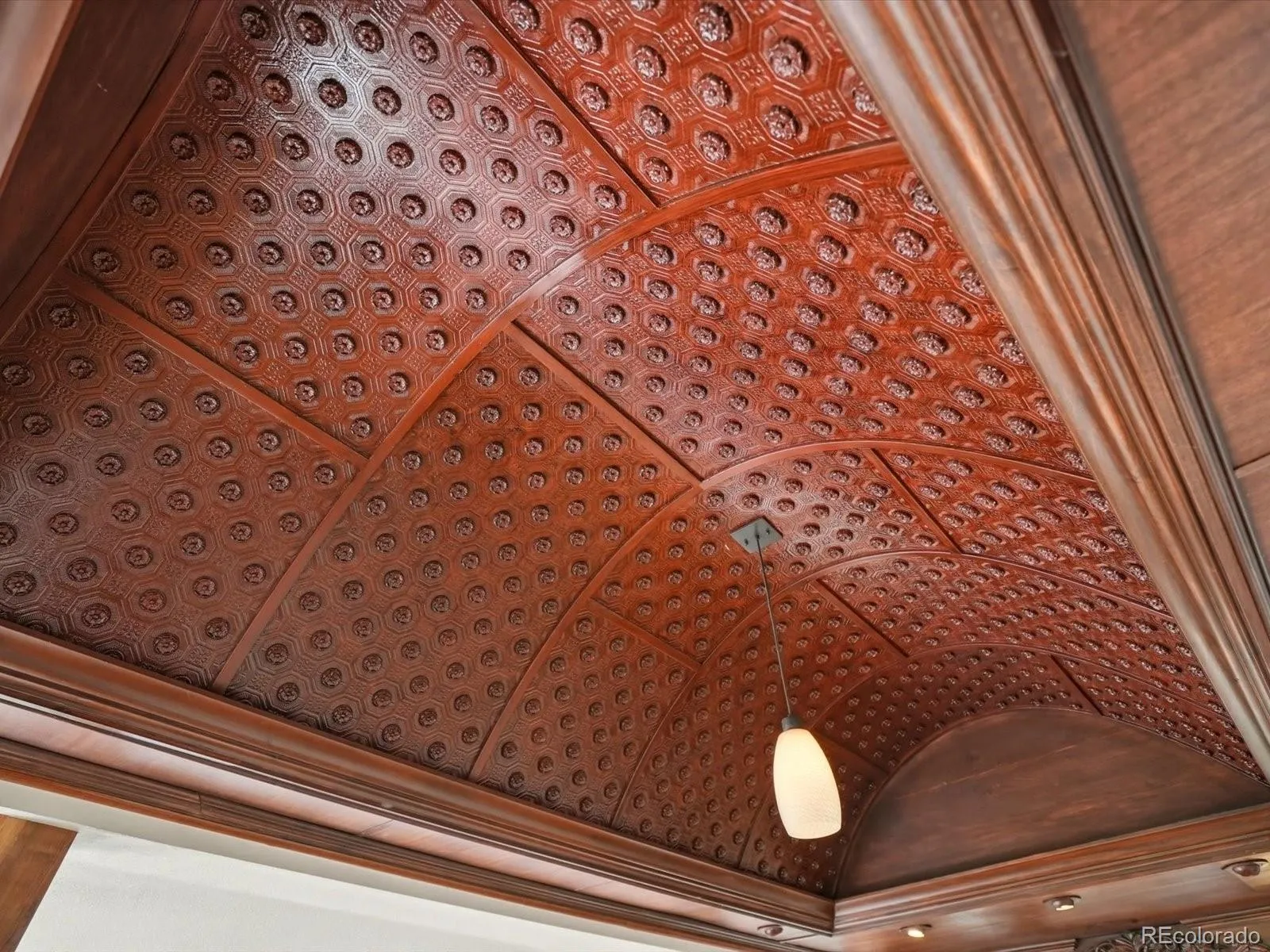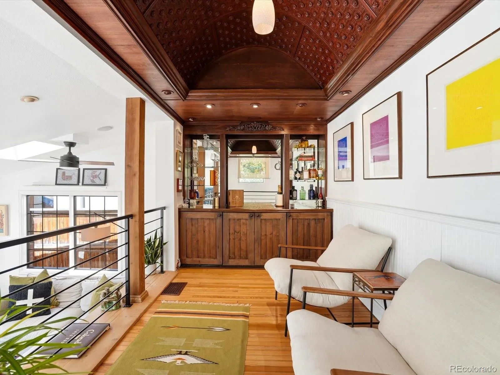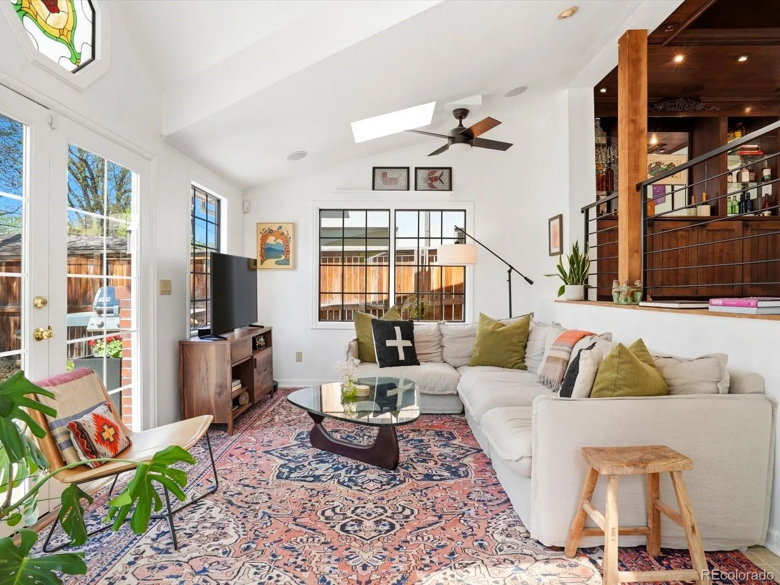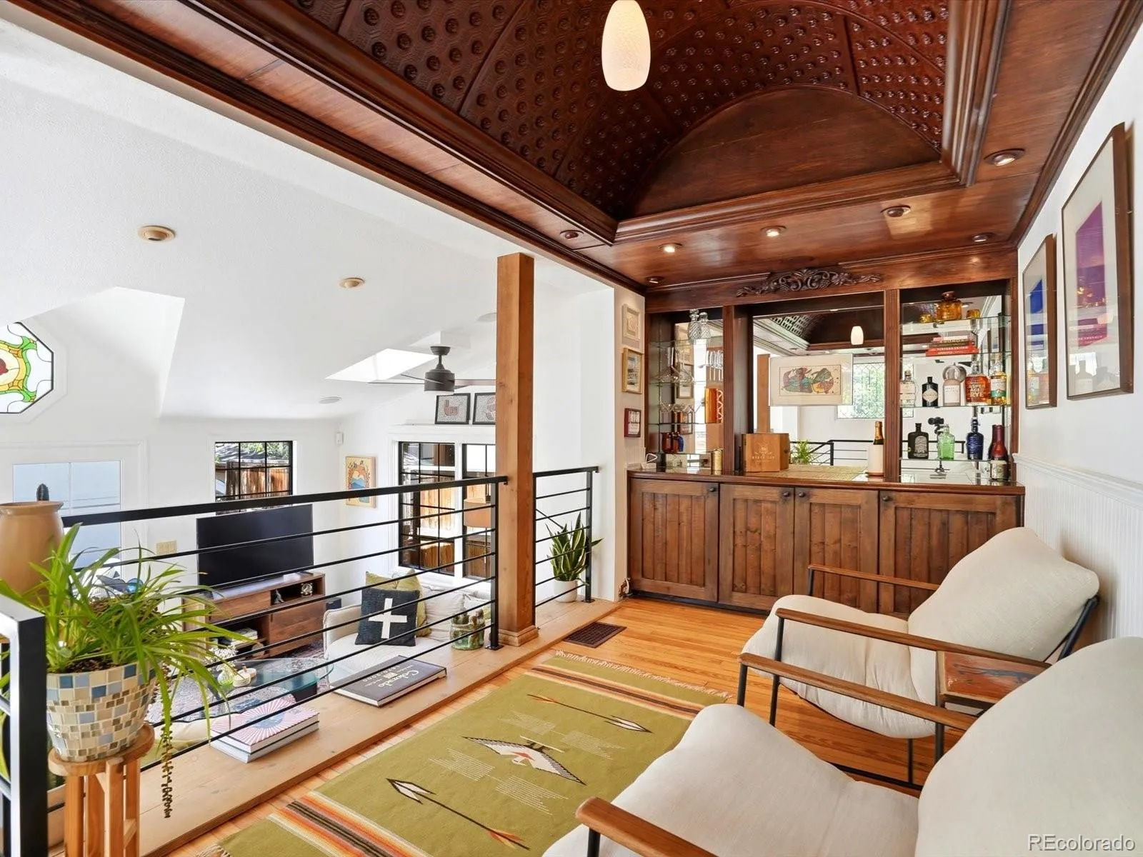 Designed for everyday living and entertaining, the kitchen connects to a secondary family room and western-facing sunroom with skylights and abundant natural light. A unique bar and seating area showcases an antique leather bar, rose stained glass, built-in wine refrigerator, and a whimsical train caboose ceiling detail. The main floor is completed with 2 bedrooms and a fully renovated bathroom with a sleek walk-in shower.
