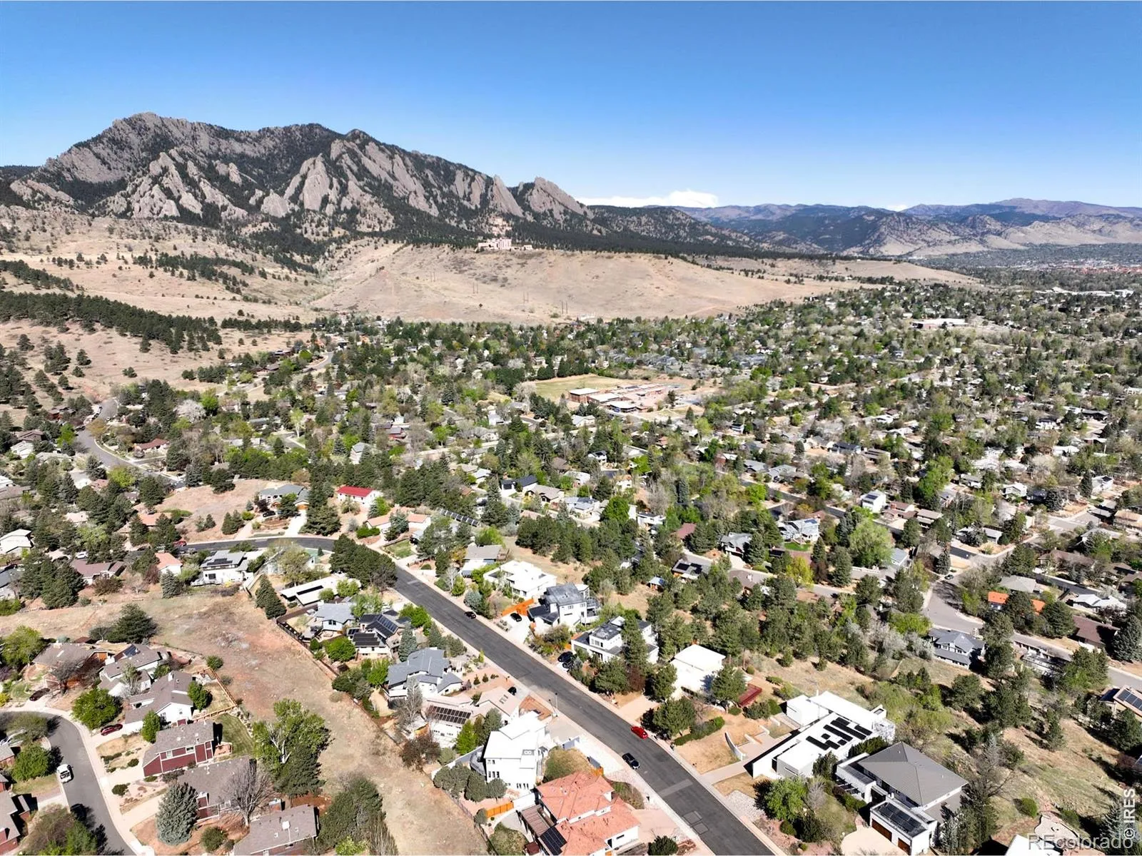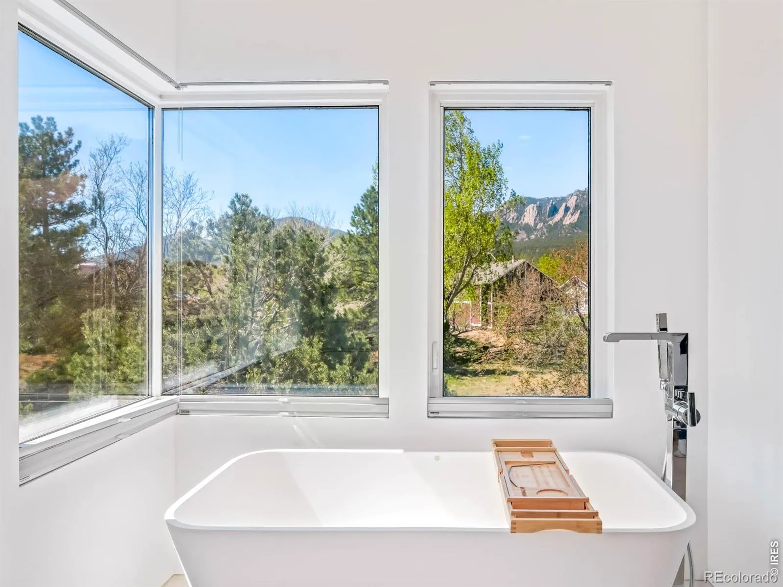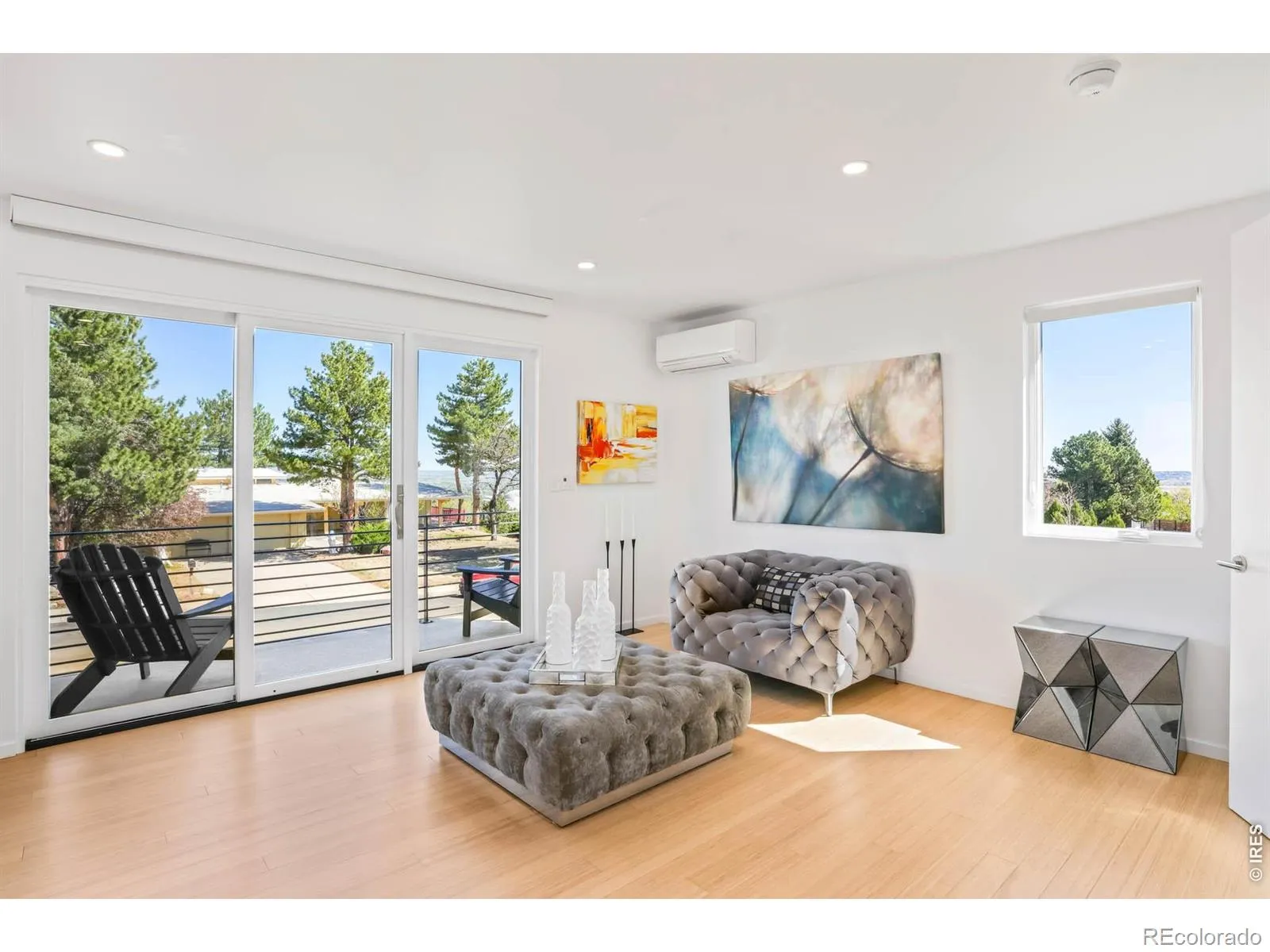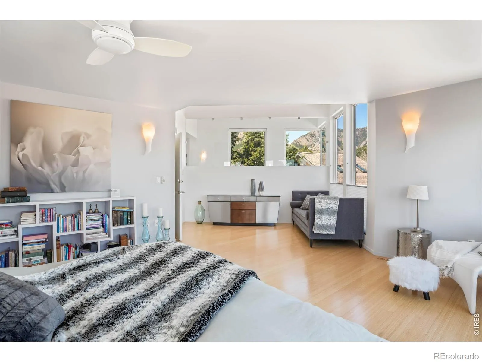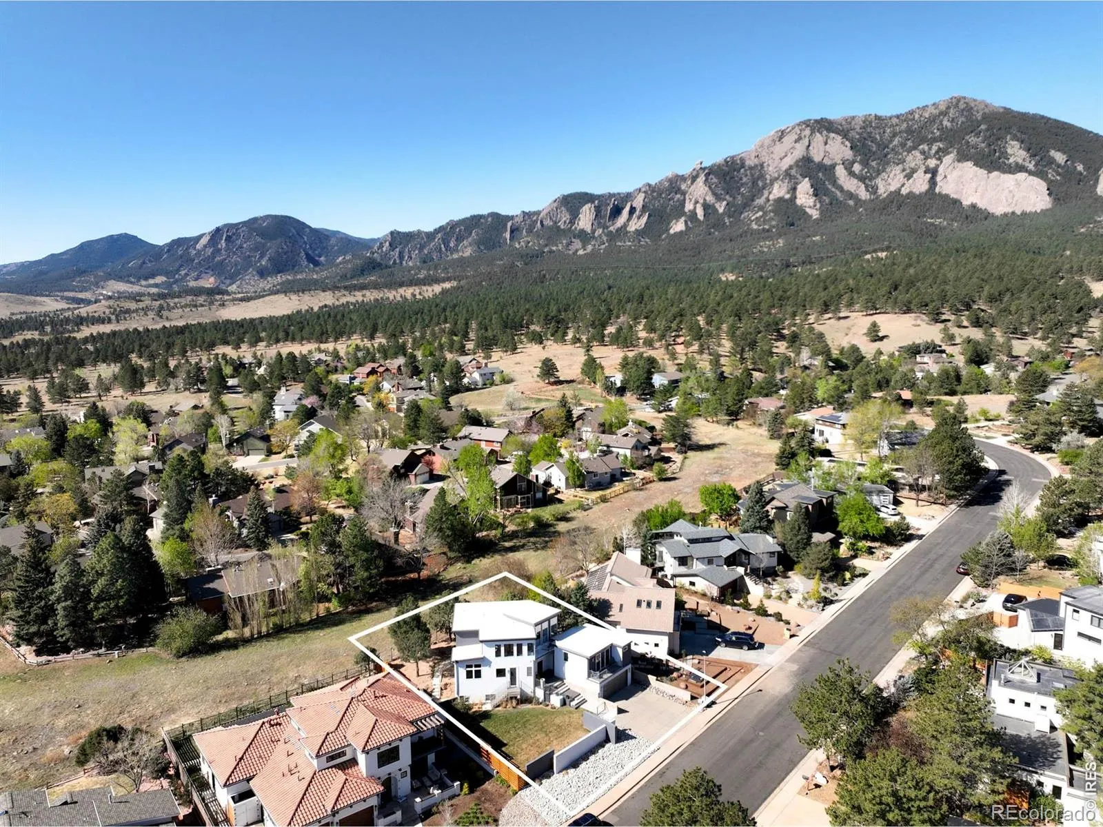 Sweeping city and Flatirons views, this striking contemporary residence in Rolling Hills delivers a refined blend of modern design and effortless indoor-outdoor living. An expansive open floorplan defines the main level, where walls of windows flood the interior with natural light and frame breathtaking mountain vistas. The living area flows seamlessly to a sprawling deck through sliding glass doors, creating an ideal setting for entertaining or quiet relaxation. A sleek Bulthaup kitchen with Bosch appliances anchors the space, complemented by warm bamboo flooring and clean architectural lines. Upstairs, a spacious layout includes a versatile flex area and a serene primary suite featuring a large walk-in closet, soaking tub and dual vanities. Panoramic city and mountain views from walls of tall windows wrapping around the entire upper level. The walk-out lower level offers two additional bedrooms and a generous rec room, providing flexibility for guests or work-from-home needs. Outside, immaculate landscaping and a private sauna complete this exceptional Boulder retreat, just moments from scenic trails.