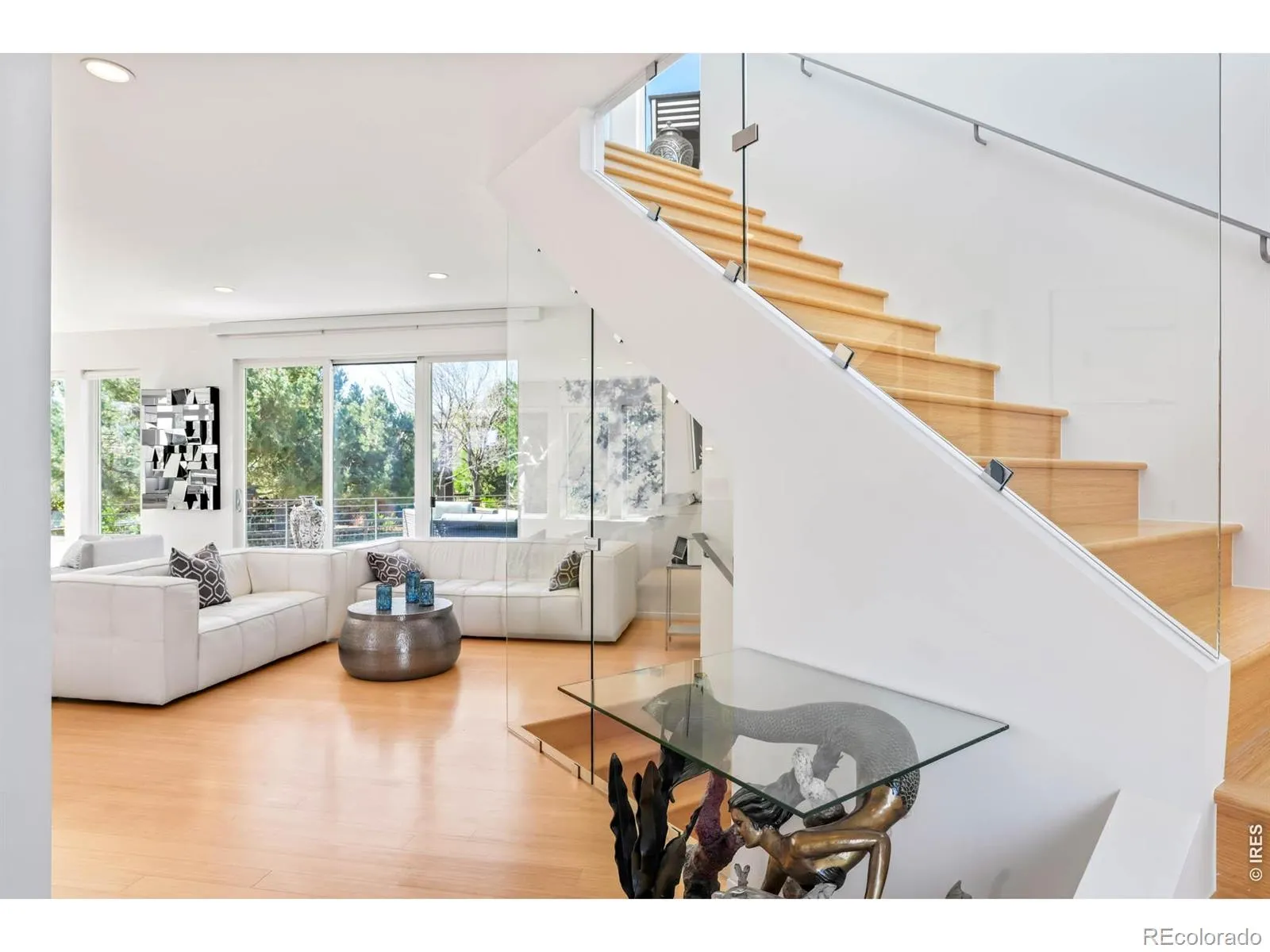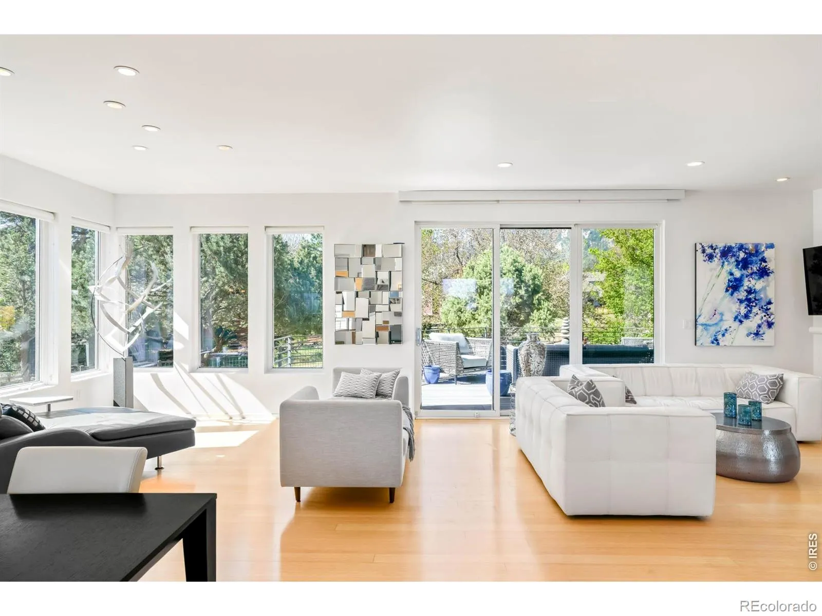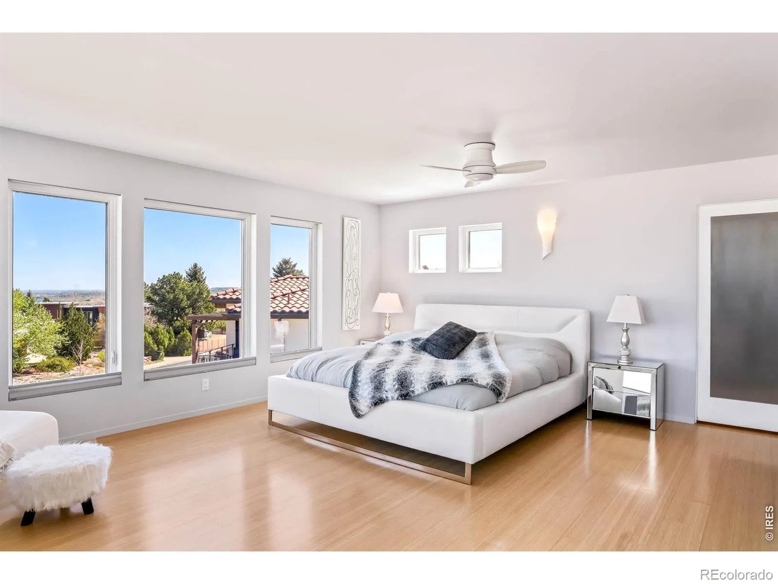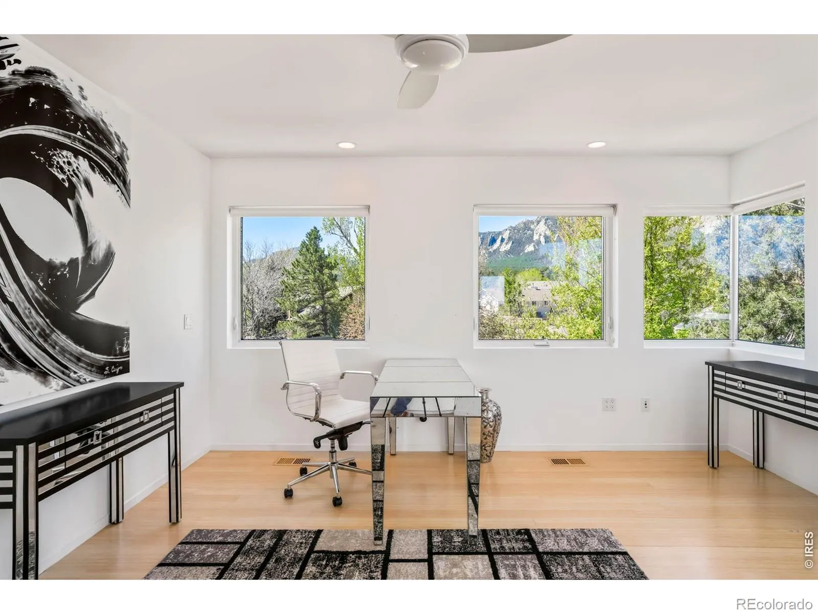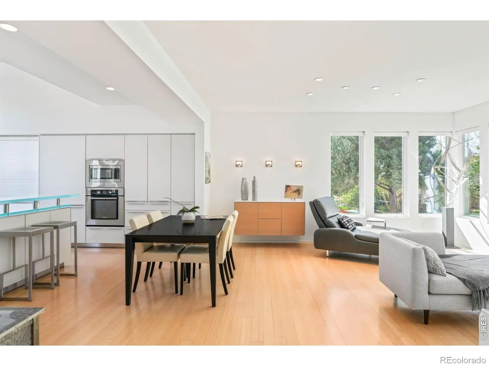 Sweeping city and Flatirons views, this striking contemporary residence in Rolling Hills delivers a refined blend of modern design and effortless indoor-outdoor living. An expansive open floorplan defines the main level, where walls of windows flood the interior with natural light and frame breathtaking mountain vistas. The living area flows seamlessly to a sprawling deck through sliding glass doors, creating an ideal setting for entertaining or quiet relaxation. A sleek Bulthaup kitchen with Bosch appliances anchors the space, complemented by warm bamboo flooring and clean architectural lines. Upstairs, a spacious layout includes a versatile flex area and a serene primary suite featuring a large walk-in closet, soaking tub and dual vanities. Panoramic city and mountain views from walls of tall windows wrapping around the entire upper level. The walk-out lower level offers two additional bedrooms and a generous rec room, providing flexibility for guests or work-from-home needs. Outside, immaculate landscaping and a private sauna complete this exceptional Boulder retreat, just moments from scenic trails.