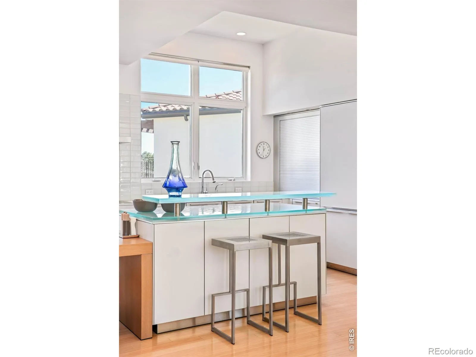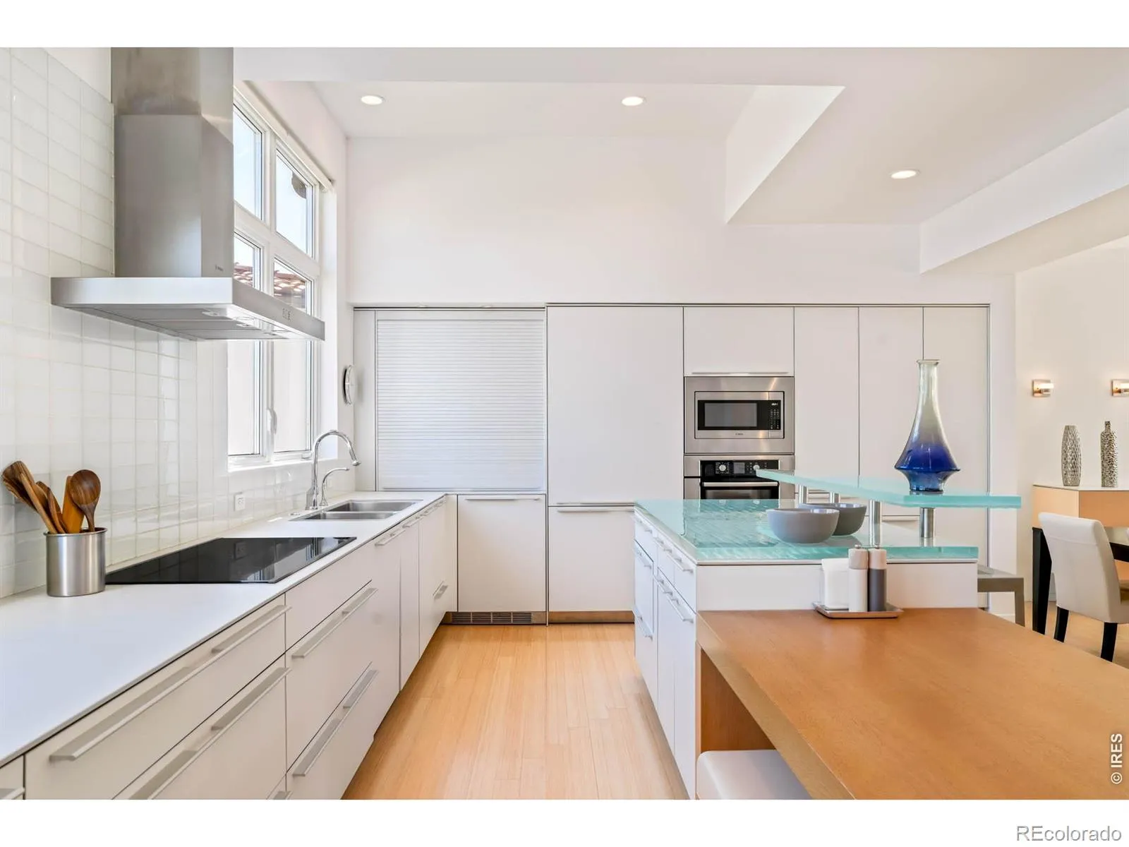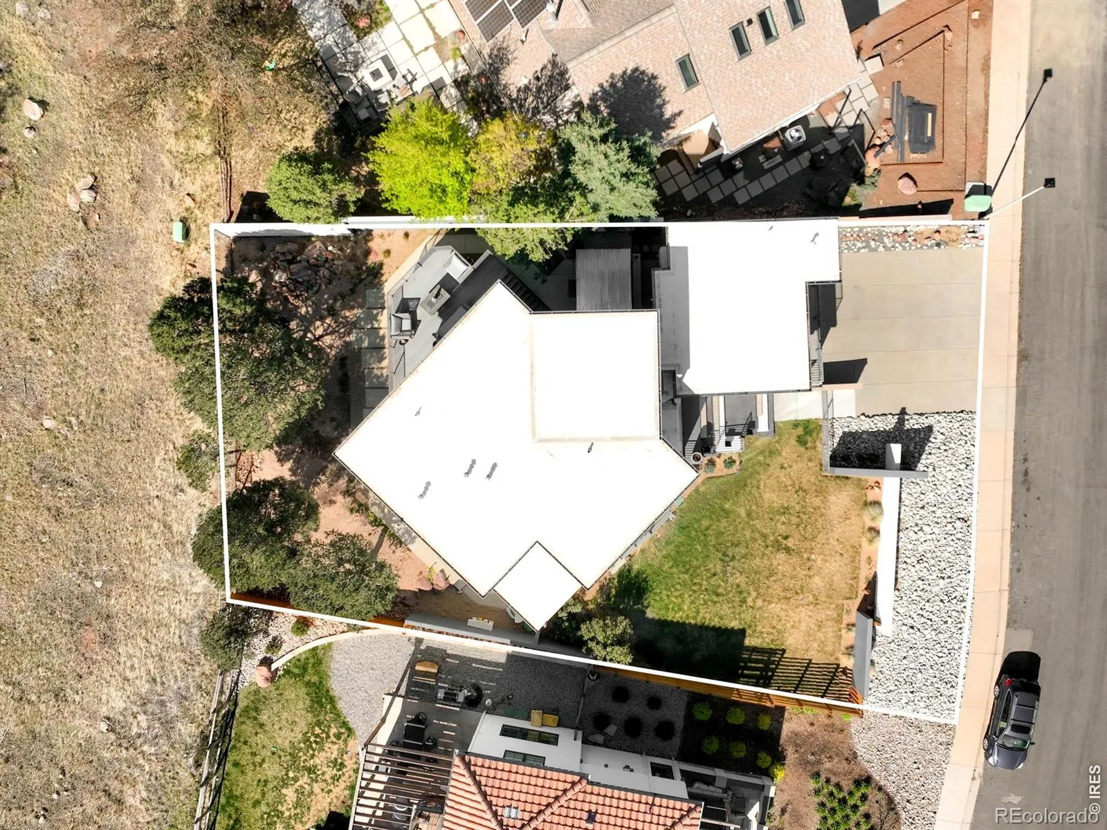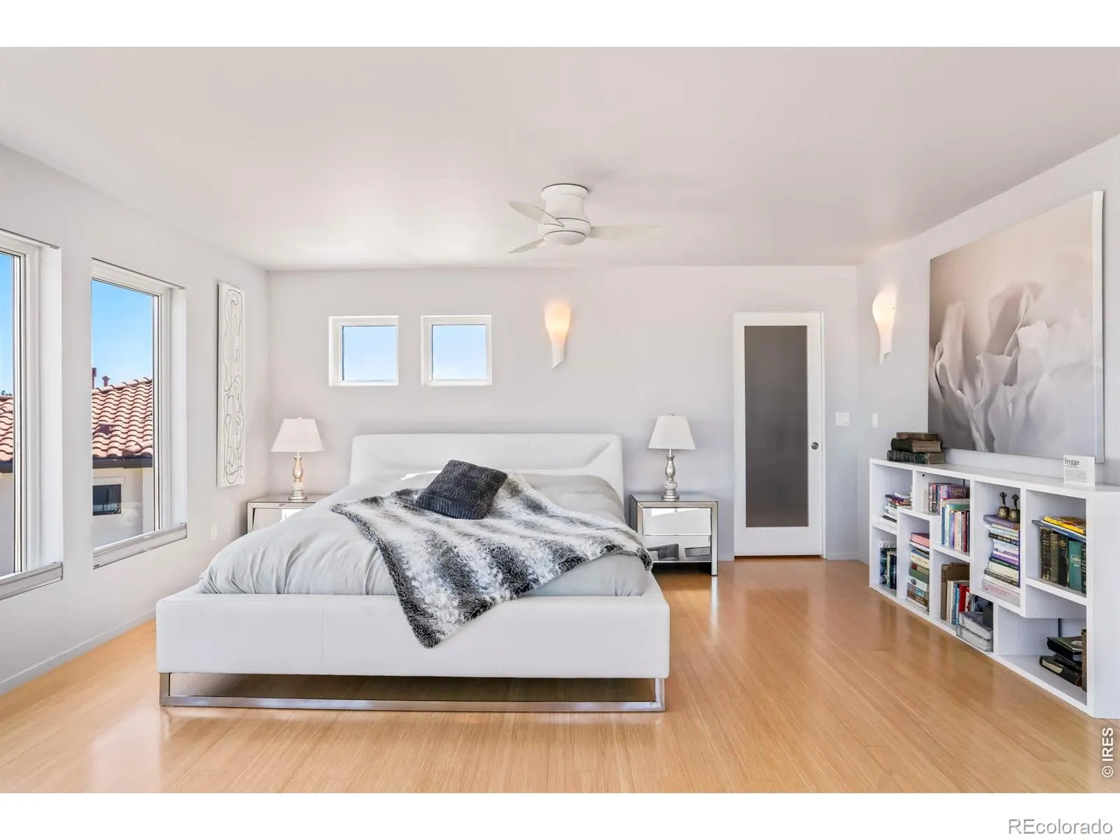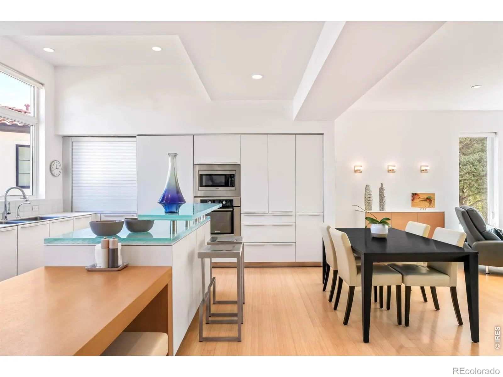 Sweeping city and Flatirons views, this striking contemporary residence in Rolling Hills delivers a refined blend of modern design and effortless indoor-outdoor living. An expansive open floorplan defines the main level, where walls of windows flood the interior with natural light and frame breathtaking mountain vistas. The living area flows seamlessly to a sprawling deck through sliding glass doors, creating an ideal setting for entertaining or quiet relaxation. A sleek Bulthaup kitchen with Bosch appliances anchors the space, complemented by warm bamboo flooring and clean architectural lines. Upstairs, a spacious layout includes a versatile flex area and a serene primary suite featuring a large walk-in closet, soaking tub and dual vanities. Panoramic city and mountain views from walls of tall windows wrapping around the entire upper level. The walk-out lower level offers two additional bedrooms and a generous rec room, providing flexibility for guests or work-from-home needs. Outside, immaculate landscaping and a private sauna complete this exceptional Boulder retreat, just moments from scenic trails.