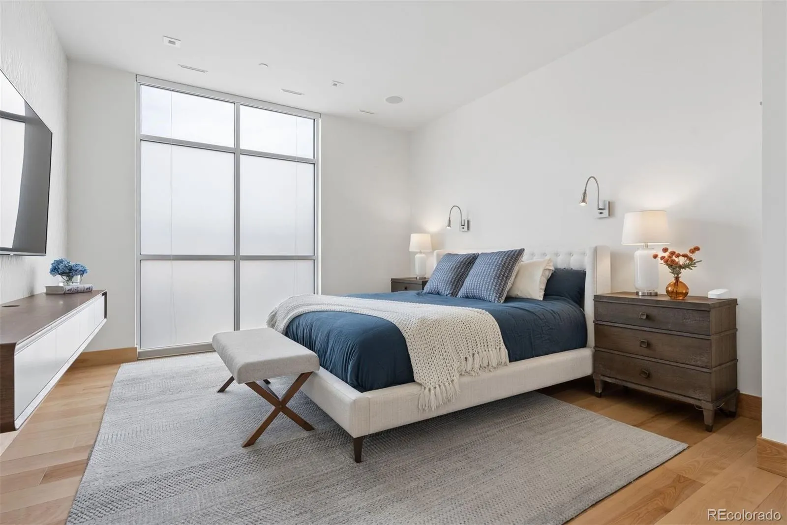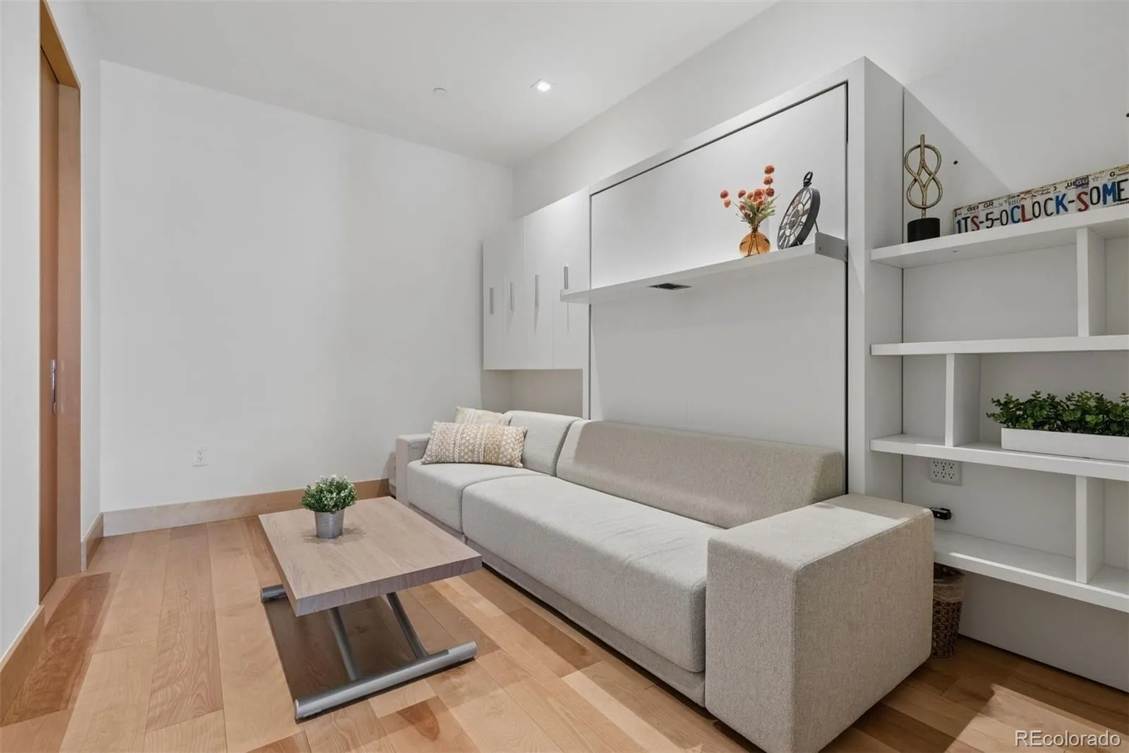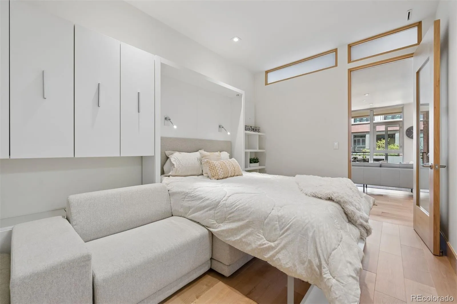 The primary suite sits just off the kitchen with frosted glass windows, a completely remodeled five-piece bath, a large walk-in closet, and in-unit laundry. The second bedroom features a Murphy bed that converts from lounge sofa to guest bed, alongside a fully remodeled hall bath with enclosed shower.