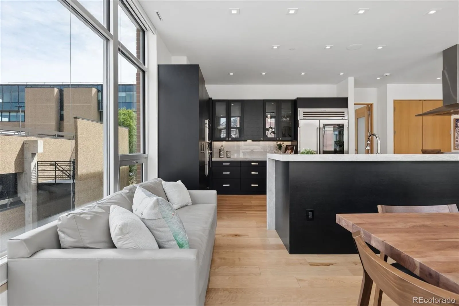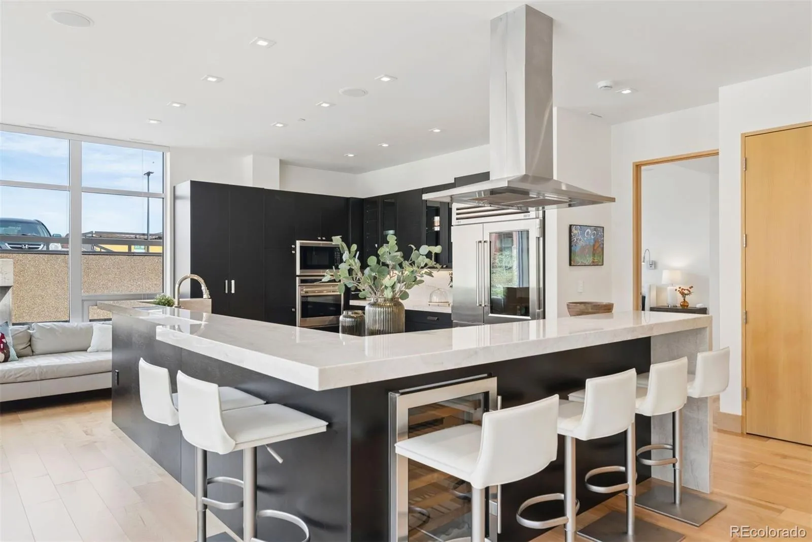 The open-concept layout features smart automated shades, hardwood floors, and fresh paint throughout. The Palencia-style kitchen is appointed with sleek black cabinetry, white and beige quartzite countertops, a large island, and premium appliances including a Wolf range and Sub-Zero refrigerator.