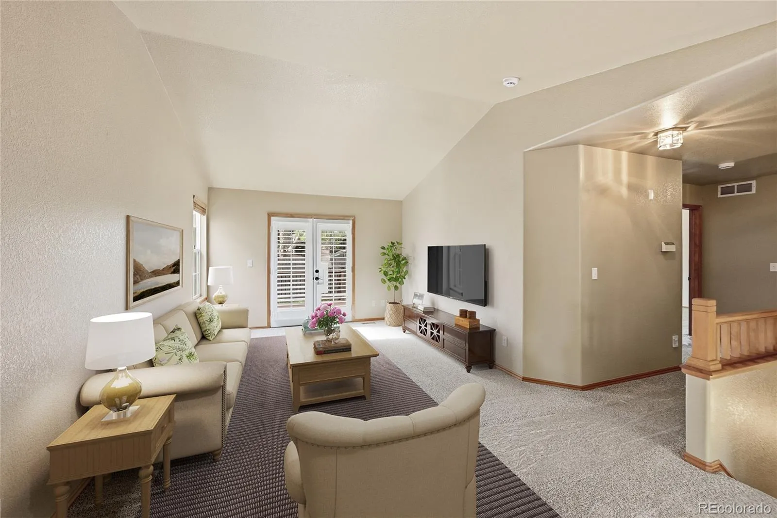 The interior features a thoughtfully designed layout, highlighted by a spacious living room with vaulted ceilings and abundant natural light. The kitchen is equipped with modern black appliances and ample counter space, ideal for culinary enthusiasts. The primary bedroom suite includes a private bathroom, ensuring a tranquil retreat, while the additional bedrooms offer flexibility for family or guests.