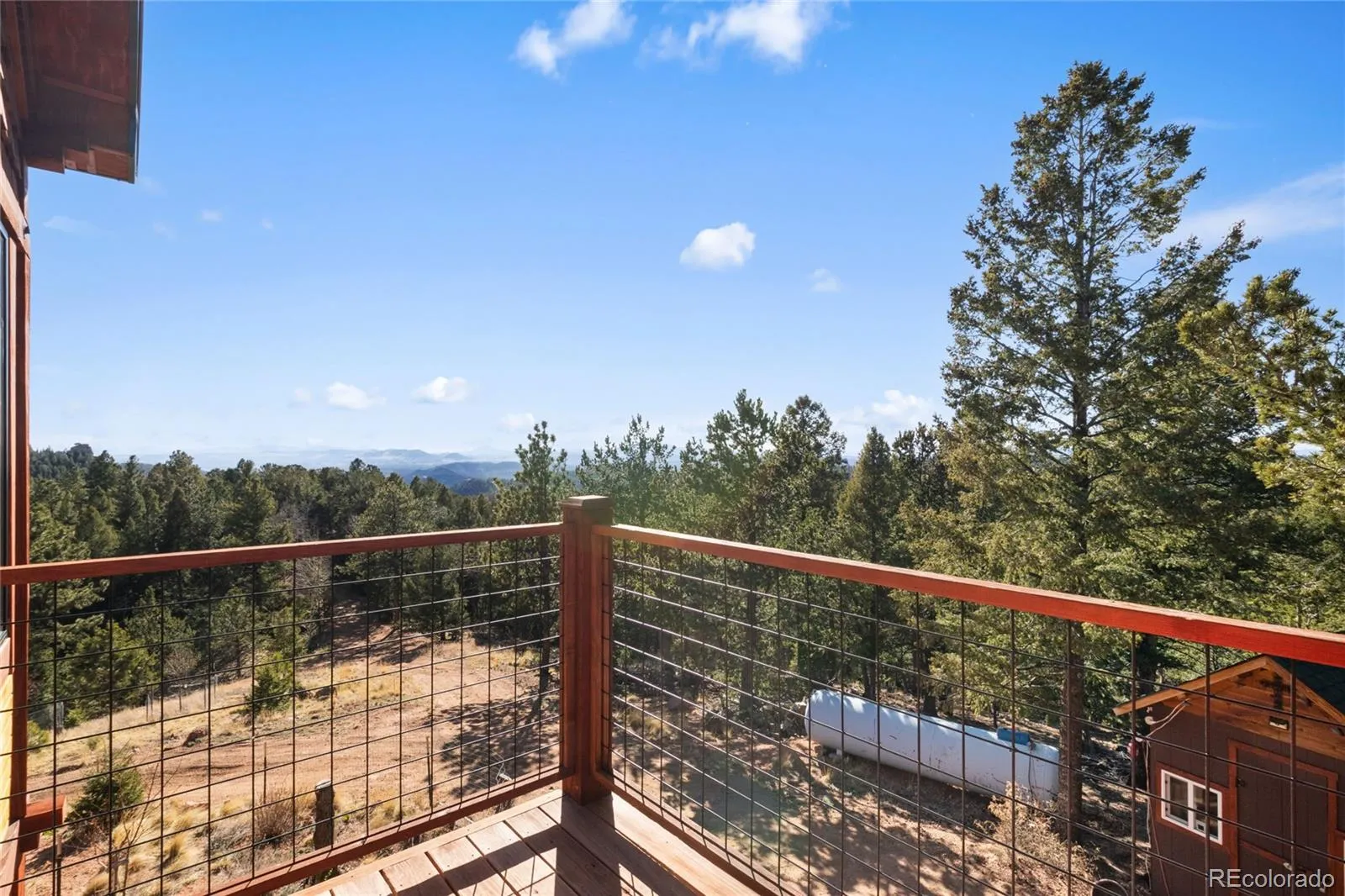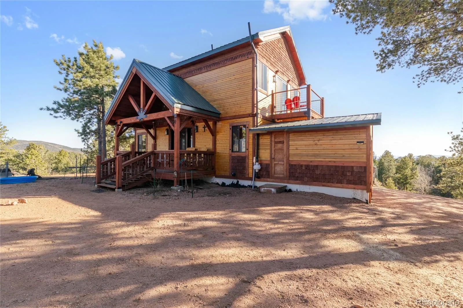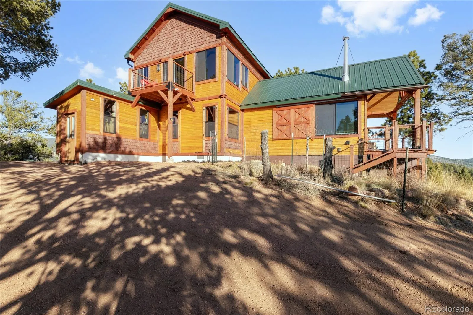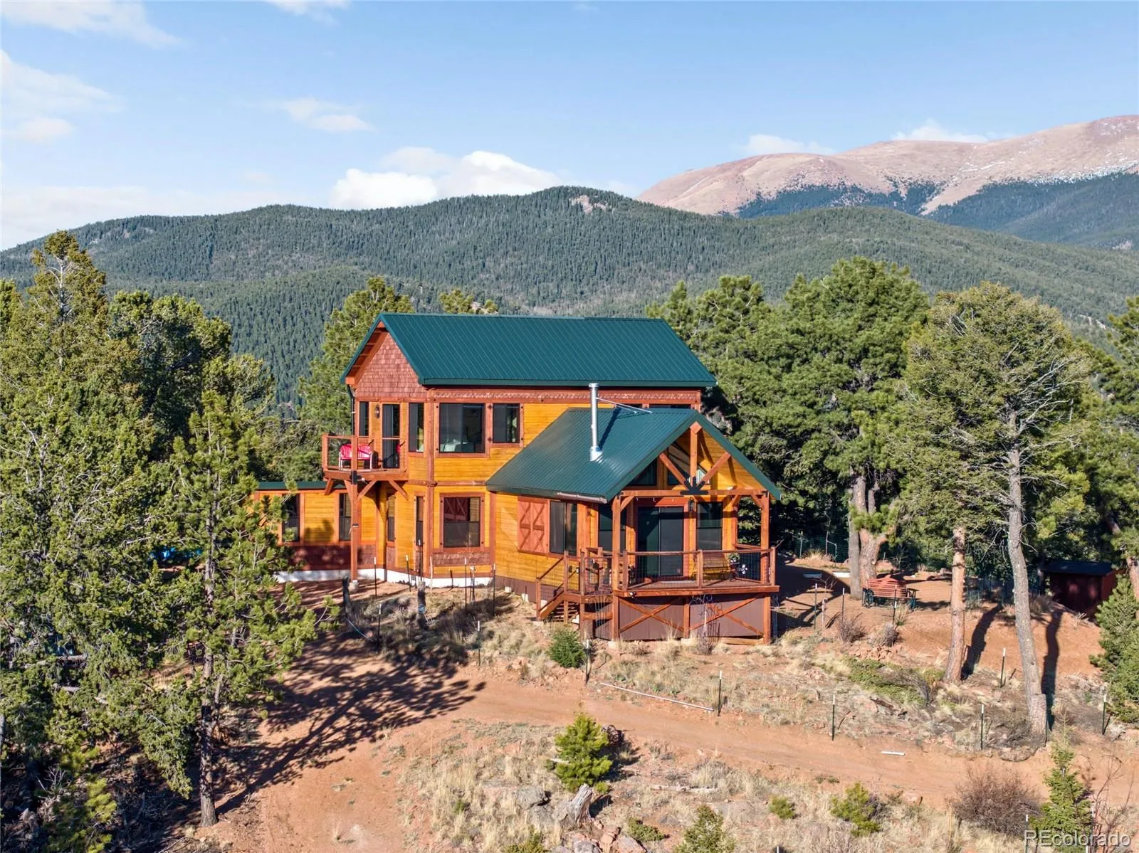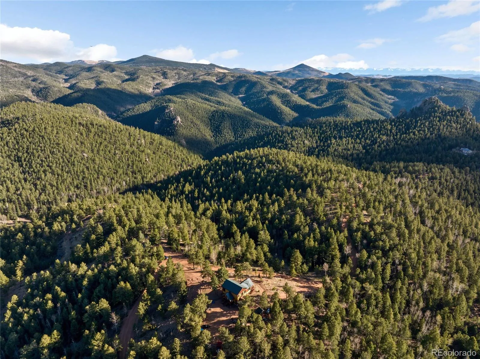If you’ve been searching for a truly one-of-a-kind property with privacy and room to dream, this is it. This custom-built cabin gives you a thoughtfully crafted home, with room to build more, giving you a beautiful place to live now and the flexibility to create your dream property. A spacious front porch welcomes you in, and you may even be greeted by a deer or two. Inside, the living room features vaulted ceilings and floor-to-ceiling windows that open to a large west-facing deck with stunning views of the Sangre de Cristos. The kitchen is a true standout with a massive island, farm sink, KitchenAid dual five-burner range with pot filler, butcher block counters, pantry, coffee station, and beautiful Italian-style tile. This space walks out to another deck overlooking Mount Pisgah. The main level includes a generous dining room and a charming bathroom with a claw-foot tub. Upstairs, the vaulted primary bedroom offers its own private deck, and the second bedroom also features a private deck, both with incredible views. A full bathroom with a walk-in shower completes the upper level. All closets are cedar-lined, and a soapstone wood burner heats up to 2,000 sq. ft. Property features propane forced-air heating along with independently controlled electric floor heaters, providing flexible, room-by-room comfort and an additional layer of heating security. Additional features include a tankless water heater and a fully heated mechanical room in the basement with plenty of storage. The property spans 40 pristine acres with 360-degree views of Pikes Peak and surrounding ranges. The entire southern boundary borders the Dome Wilderness Area, offering abundant wildlife, mature trees, and wildflowers. With no covenants or HOA restrictions, you have the freedom to create exactly what you envision. Endless possibilities, unmatched privacy, and views that stop you in your tracks, this property is ready to become whatever you dream it to be.