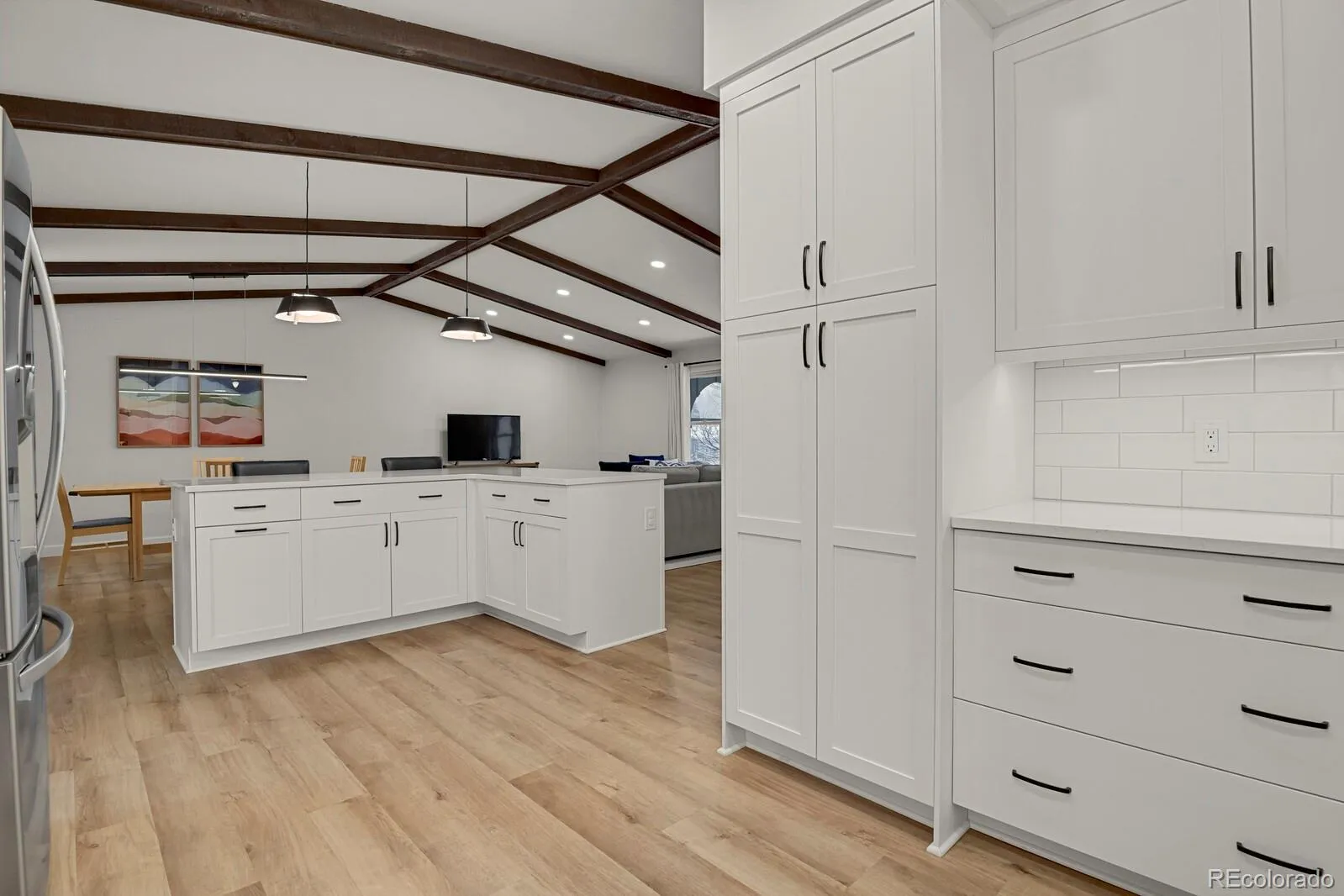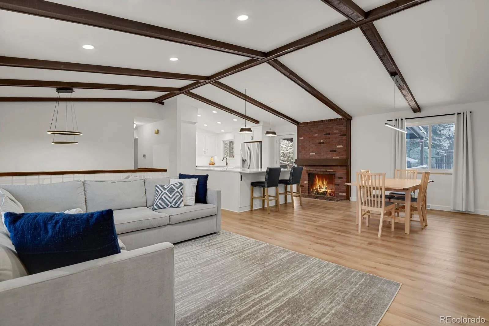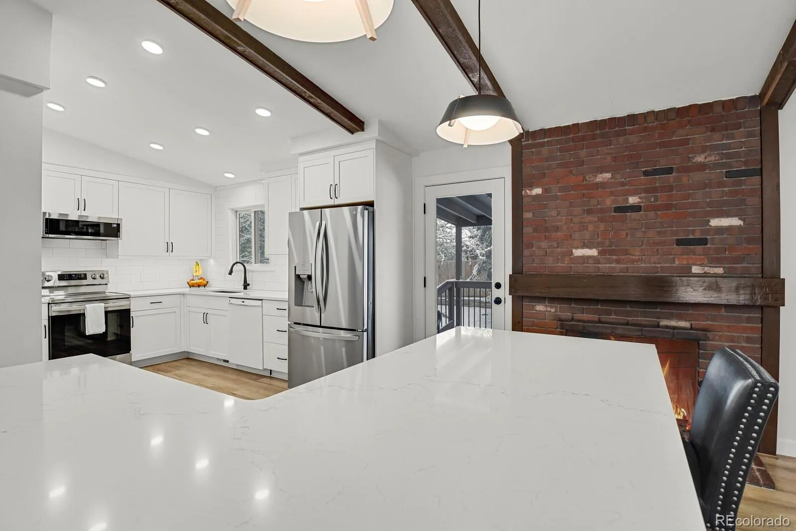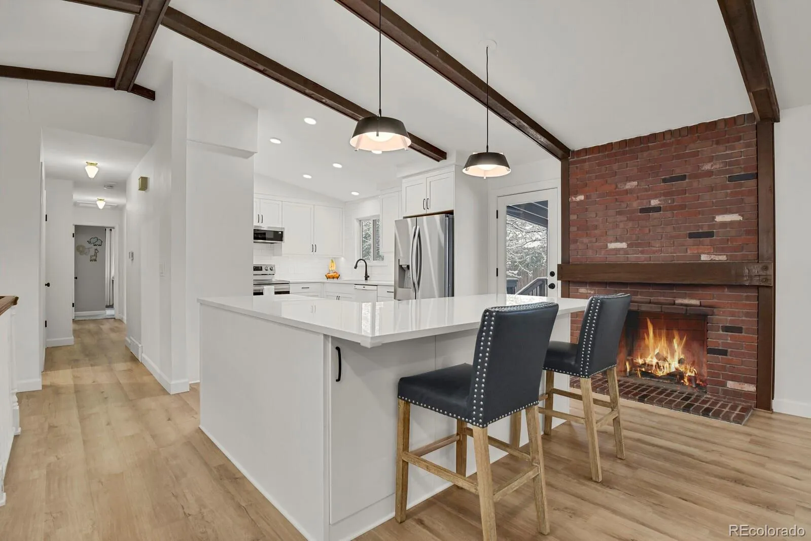 The fully remodeled kitchen and main level (2022) serve as the centerpiece of the home, featuring custom cabinetry, PentalQuartz Misterio countertops, Daltile backsplash, updated lighting, and newer appliances—all complemented by an open layout created through structural improvements. New flooring on the main level and lower hallway, along with newer carpet throughout, provide a clean and cohesive feel.