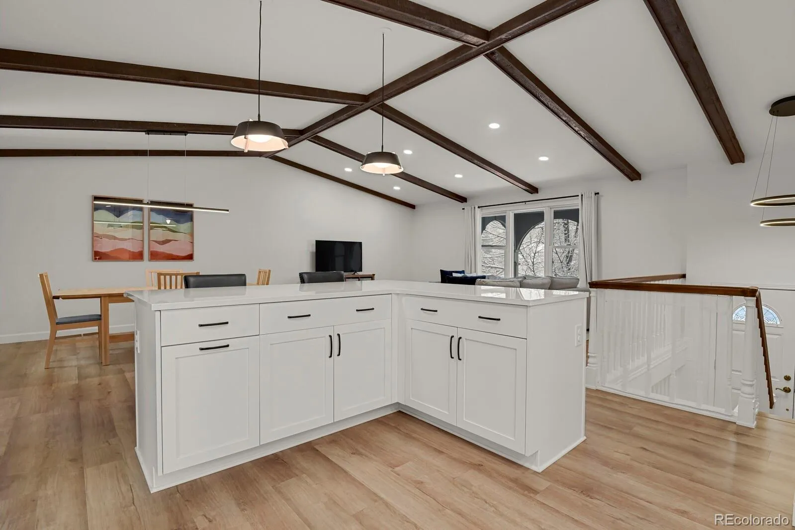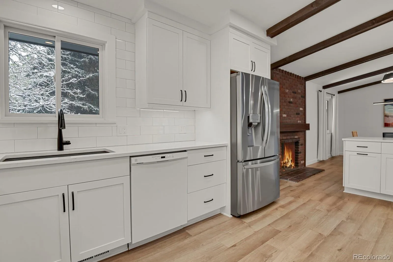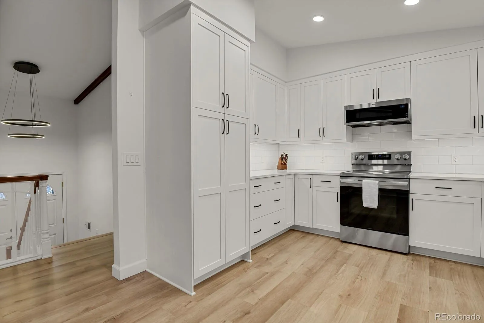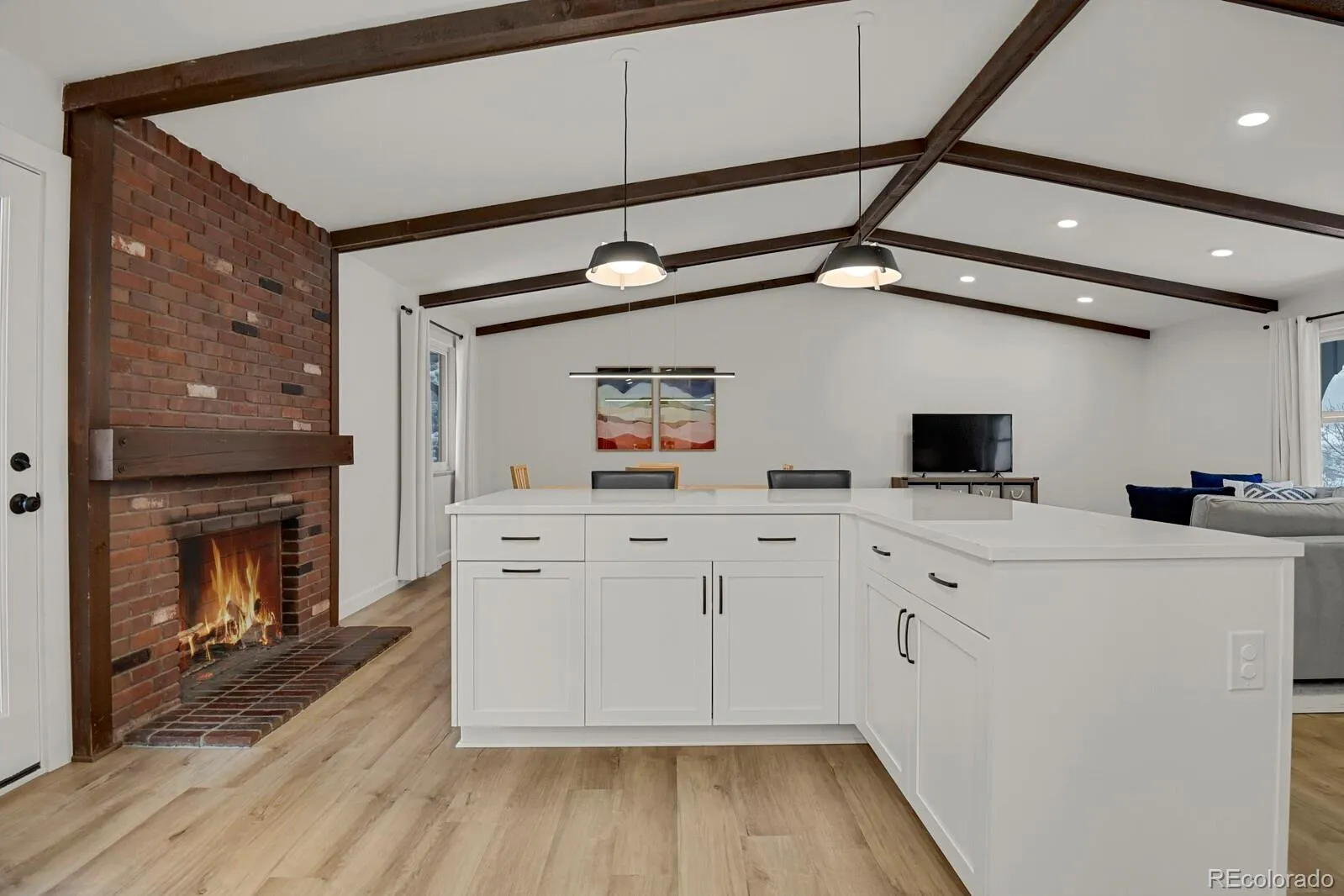 The fully remodeled kitchen and main level (2022) serve as the centerpiece of the home, featuring custom cabinetry, PentalQuartz Misterio countertops, Daltile backsplash, updated lighting, and newer appliances—all complemented by an open layout created through structural improvements. New flooring on the main level and lower hallway, along with newer carpet throughout, provide a clean and cohesive feel.