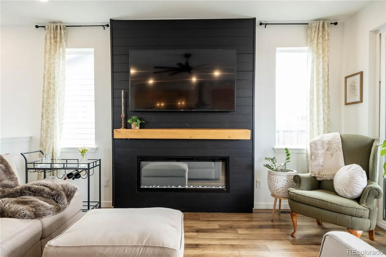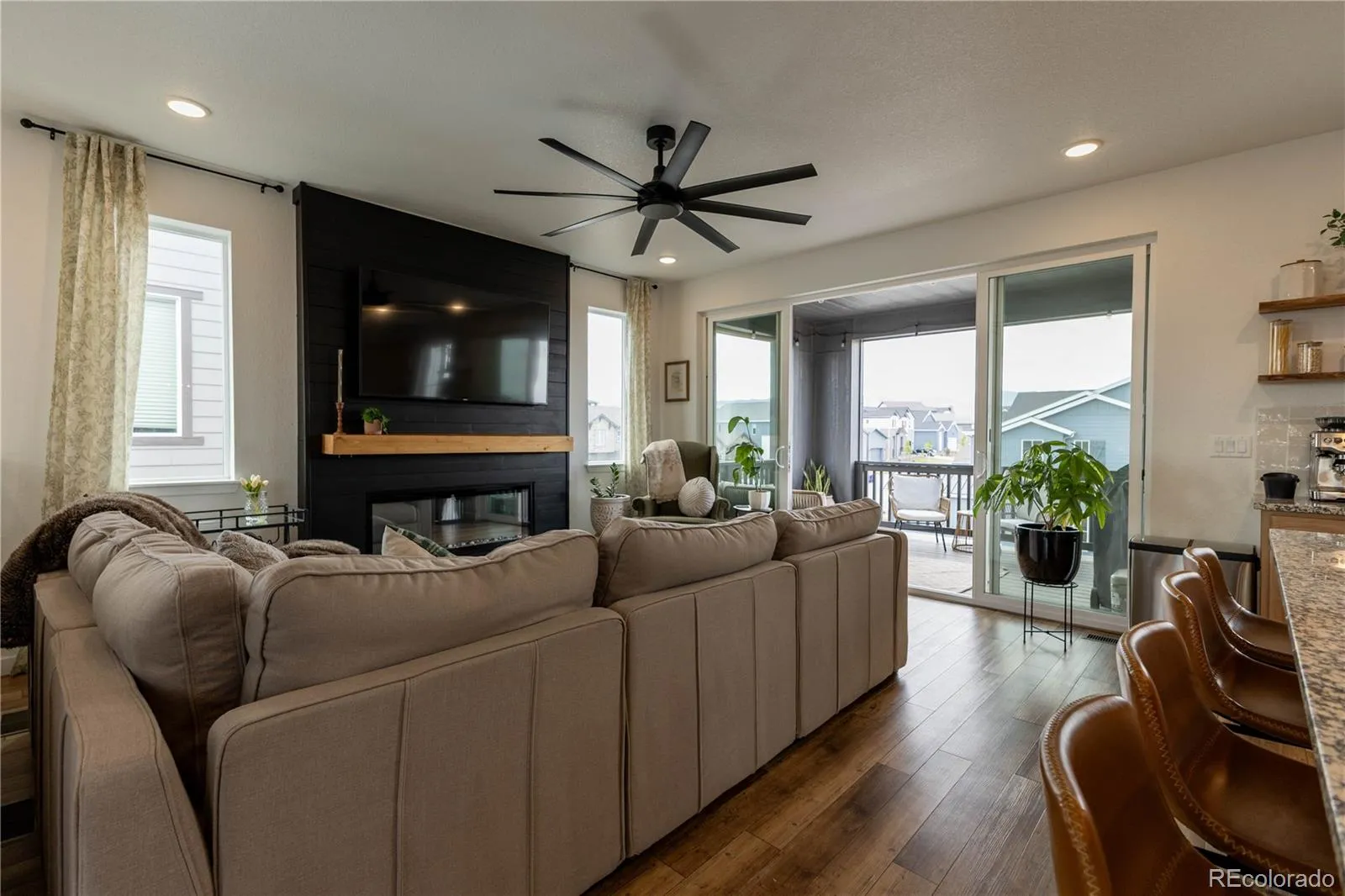 The top level unveils a light-filled, open-concept living space designed for seamless entertaining and everyday luxury. At the heart of the home, a stunning chef’s kitchen showcases extended cabinetry, a designer backsplash, floating shelves, upgraded faucet and hardware, and statement lighting. The adjoining living area is anchored by a striking fireplace accent wall with custom mantle, creating a warm yet refined focal point. Step outside to the covered deck and take in sweeping mountain views—an ideal setting for year-round indoor-outdoor living.