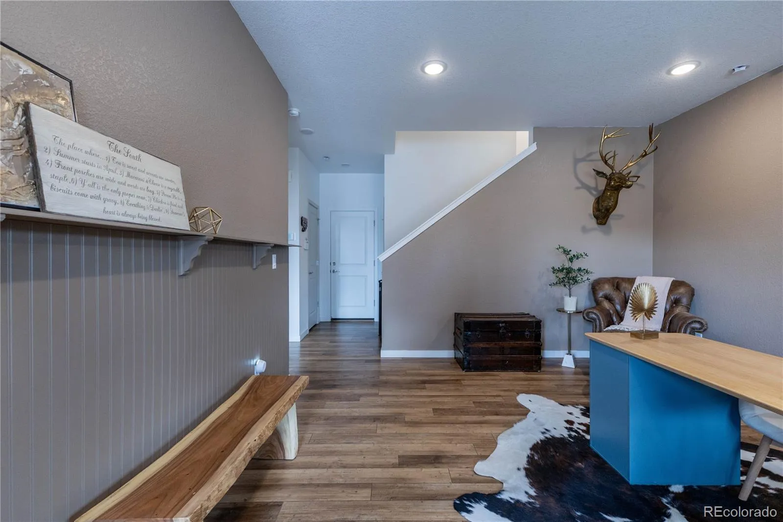 The second level serves as a private sanctuary, highlighted by a serene primary suite featuring a tray ceiling and a spa-inspired en-suite bath with upgraded mirrors, lighting, and designer finishes. A versatile loft with custom built-ins offers the perfect flex space for a home office, playroom, or additional living area. Two secondary bedrooms, a full bath, and a thoughtfully designed laundry room complete this level, featuring a utility sink and included washer and dryer.
