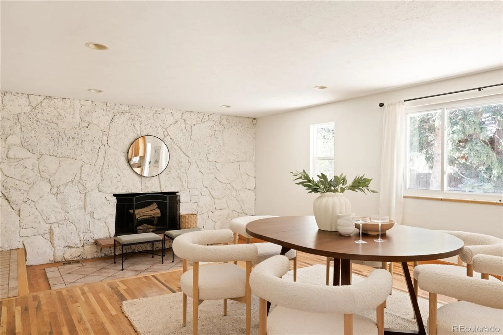 The main floor is designed for versatility, with multiple gathering areas that can be tailored to your lifestyle. An open-concept kitchen with granite countertops and eat-in seating flows into a spacious great room that can serve as a large dining area (as seen in photos) or main living room. Just off this space is a cozy area anchored by a fireplace, ideal as a playroom or lounge nook.