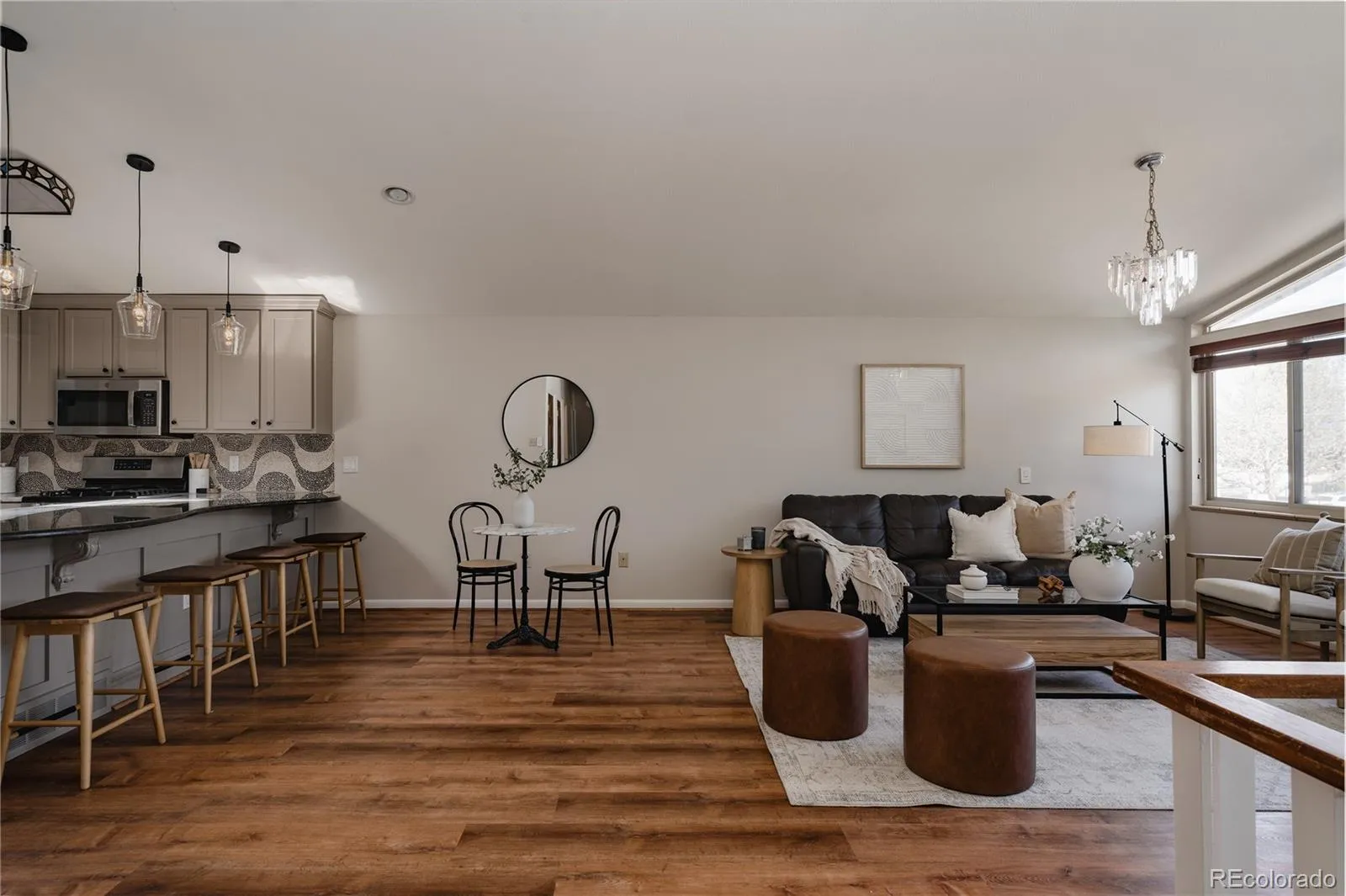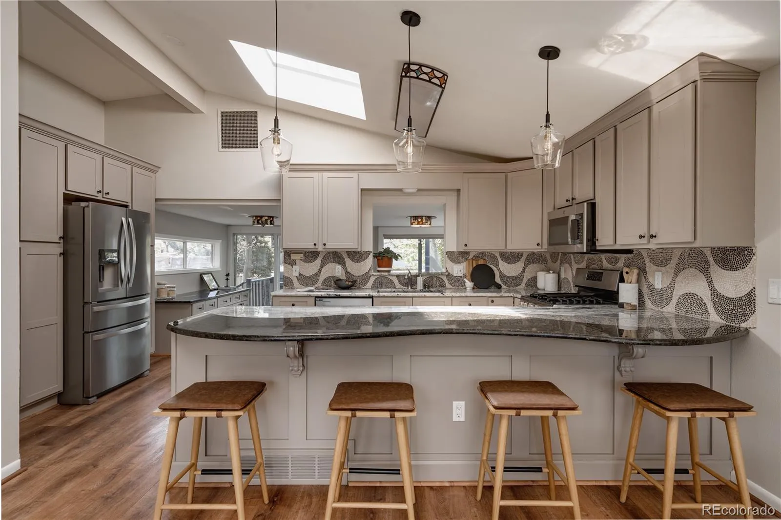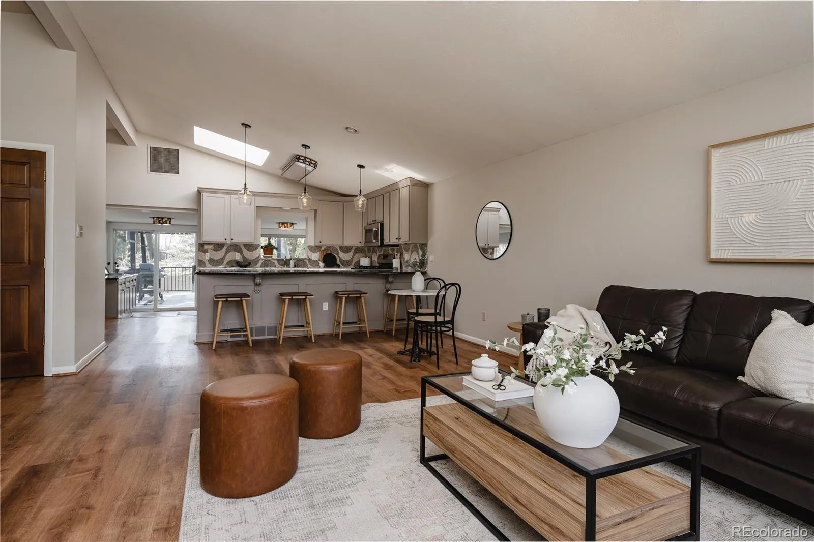 The main level is centered around a light-filled living space where vaulted ceilings and an expansive wall of windows bring in natural light and create an immediate sense of openness. The kitchen has been opened to the living and dining areas, offering a modern floor plan and functional flow that works well for both everyday living and entertaining, while still honoring the home’s original character.
