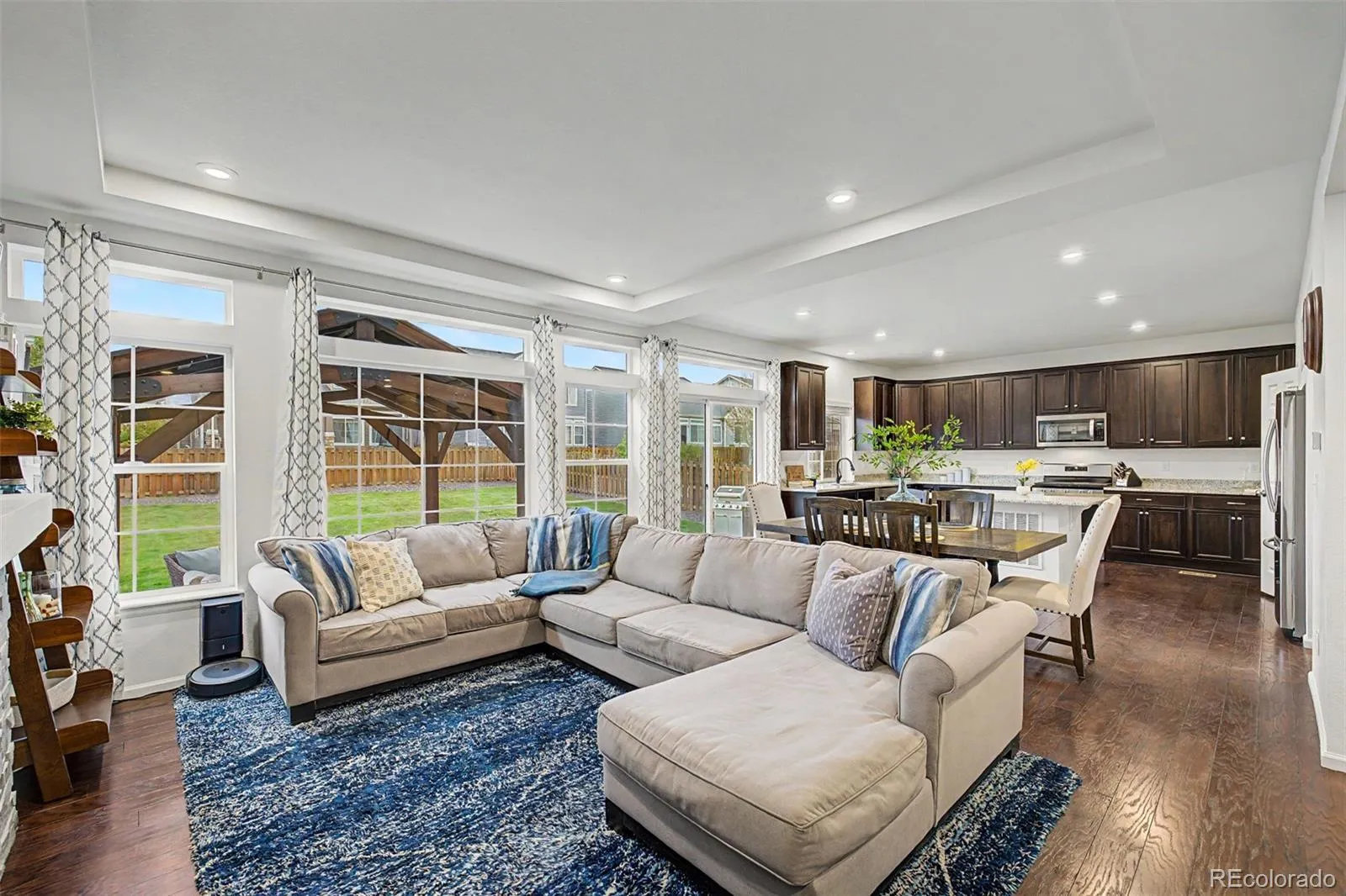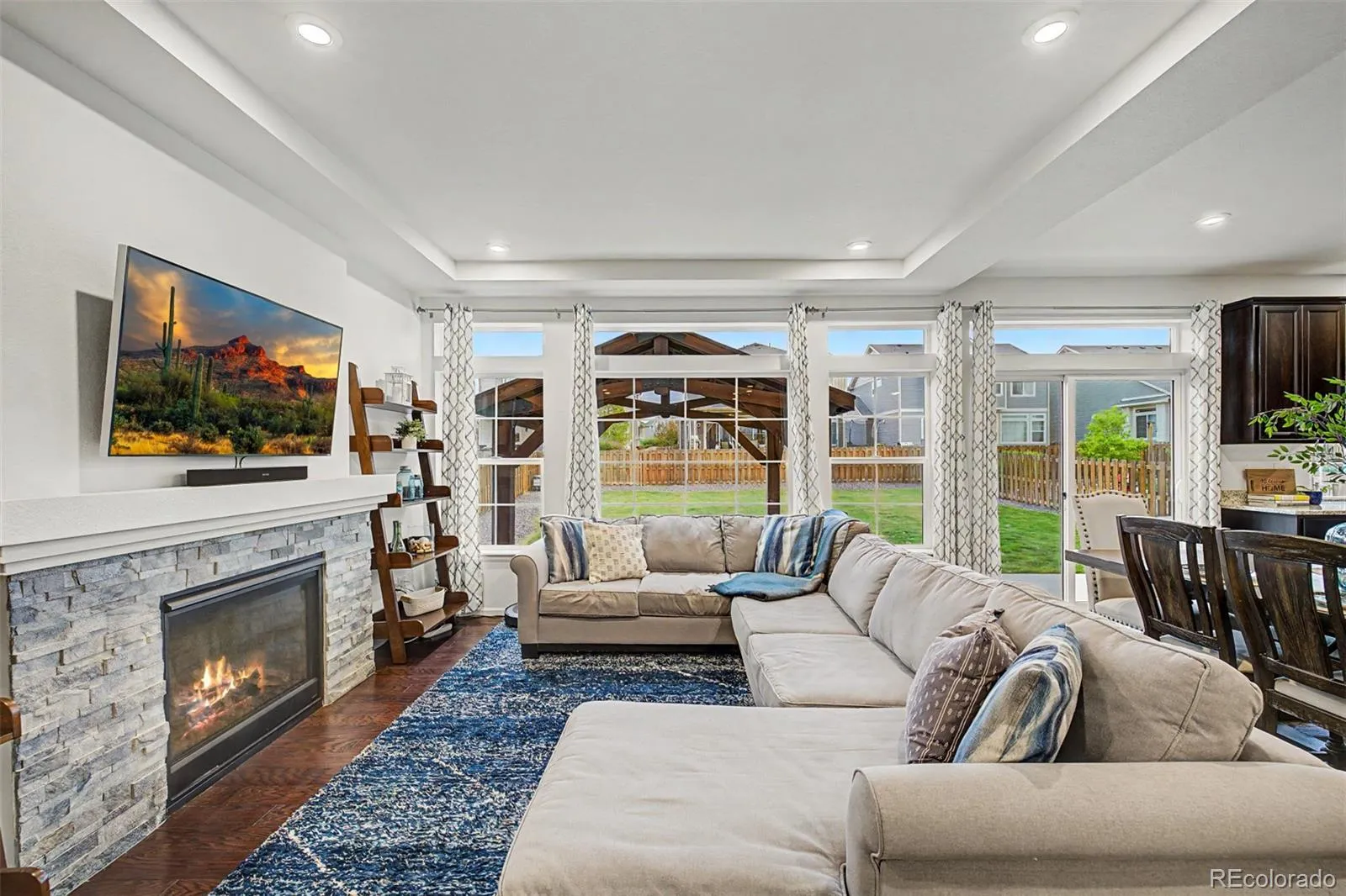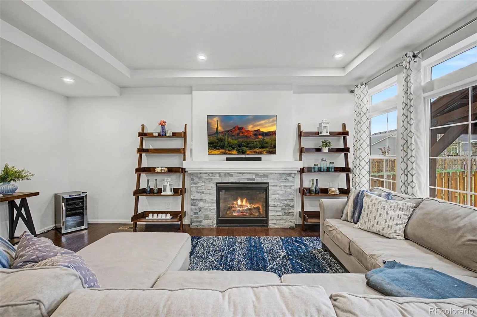 Step into a bright, open-concept layout filled with natural light and expansive windows (as highlighted throughout the home ), complemented by rich flooring, neutral tones, and elegant tray ceilings. The inviting living room features a cozy fireplace with built-in blower, designed to efficiently heat the space while creating a warm atmosphere.