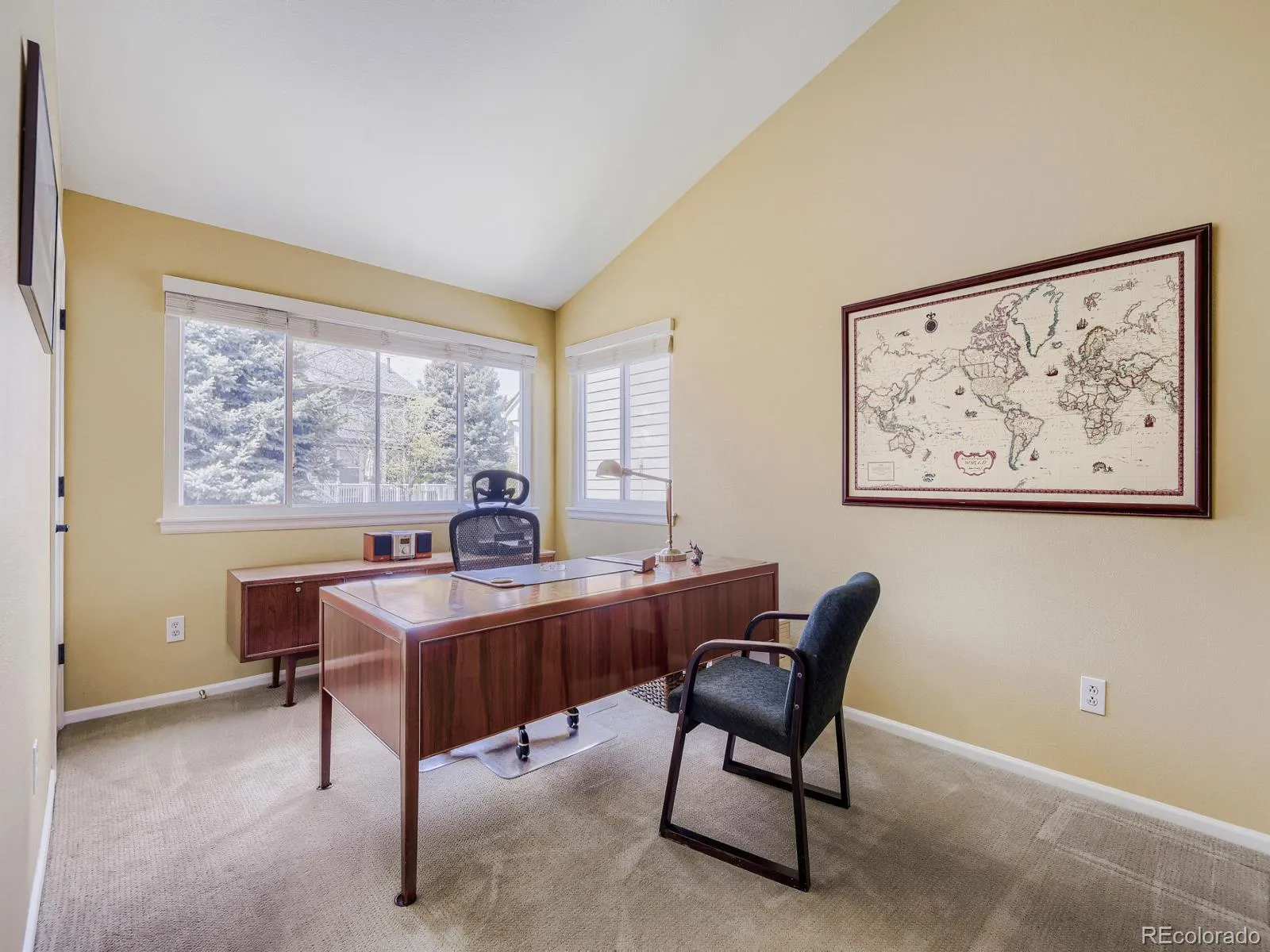 Bathed in natural light, the open main level features elegant crown molding and a soothing neutral palette. A private study with French doors sits just off the entry, while the gourmet kitchen with granite counters, stainless steel appliances, and large center island flows effortlessly into the oversized family room. Dramatic vaulted ceilings, a stunning floor-to-ceiling rock fireplace with custom shelving, and expansive windows overlooking the lush backyard complete the space.