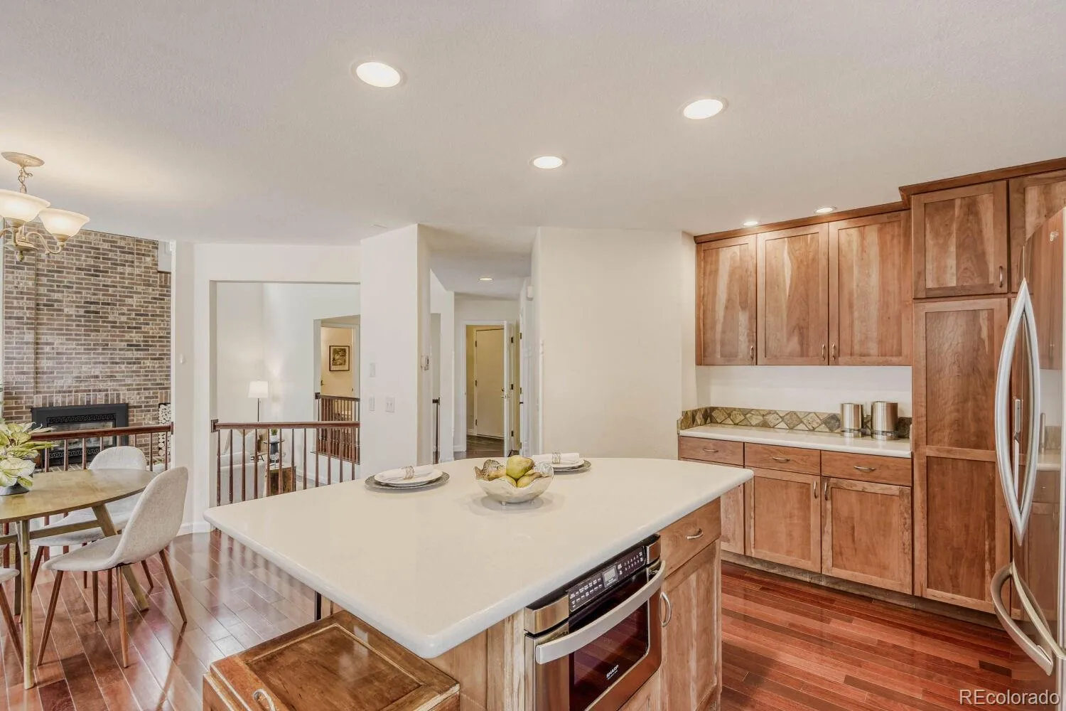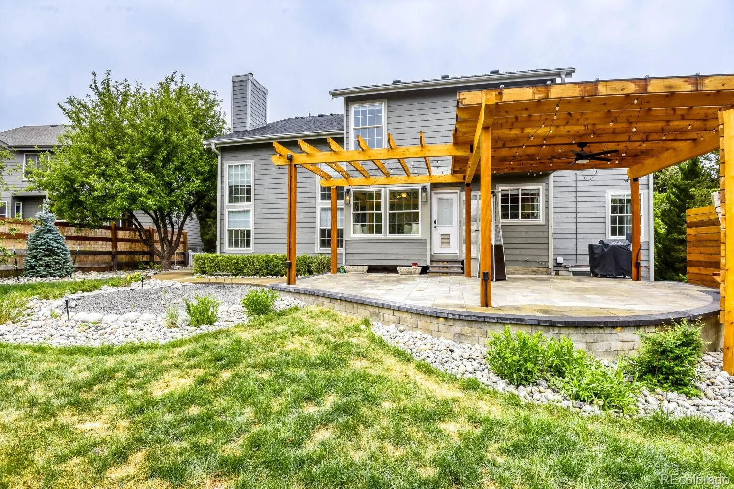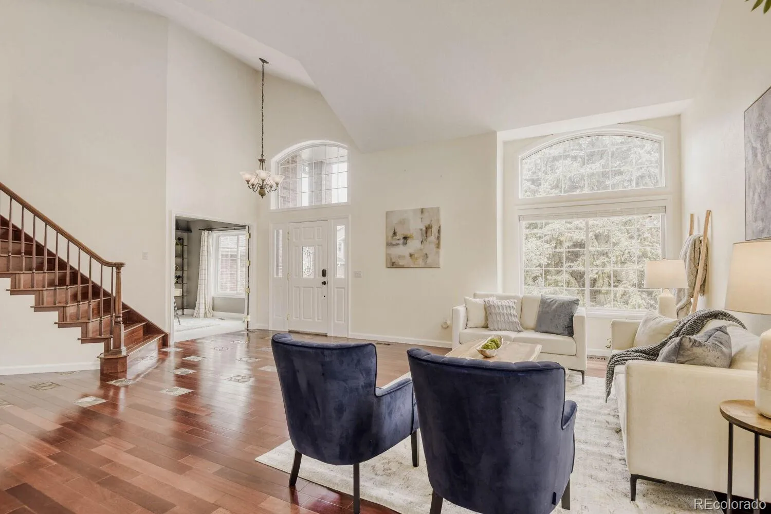 Welcome to this beautifully updated two-story home nestled at the end of a quiet cul-de-sac in the highly desirable Northridge community of Highlands Ranch. This spacious 4-bedroom residence offers a perfect blend of elegance, comfort, and thoughtful upgrades throughout. Step inside to soaring vaulted ceilings in both the family room and living room, creating an open and inviting atmosphere filled with natural light. The main level showcases rich Brazilian Cherry hardwood floors, adding warmth and sophistication. A formal dining room provides the perfect setting for gatherings, while the stunning floor-to-ceiling brick fireplace serves as a striking focal point in the living space. The kitchen has been meticulously designed with hand-crafted cherry cabinets featuring soft-close drawers and convenient pullouts, complemented by sleek stainless steel appliances. An eat-in kitchen area with a charming bay window overlooks the backyard, offering a bright and cozy space for everyday meals. Upstairs, the expansive primary suite is a true retreat, complete with a luxurious five-piece bath. Three additional generously sized bedrooms and a well-appointed 3/4 bathroom provide ample space for family or guests. The finished basement adds over 700 square feet of versatile living space, ideal for a media room, home gym, or recreation area. Car enthusiasts and those needing extra storage will appreciate the oversized 3-car garage. Outdoor living is equally impressive, featuring a beautifully crafted pergola and stamped concrete patio, perfect for entertaining or relaxing. The professionally landscaped yard includes 11 newly planted trees and over $100,000 invested in exterior improvements, creating a private and serene setting. This exceptional home combines premium upgrades, functional living spaces, and a prime location—offering a rare opportunity in one of Highlands Ranch’s most sought-after neighborhoods.