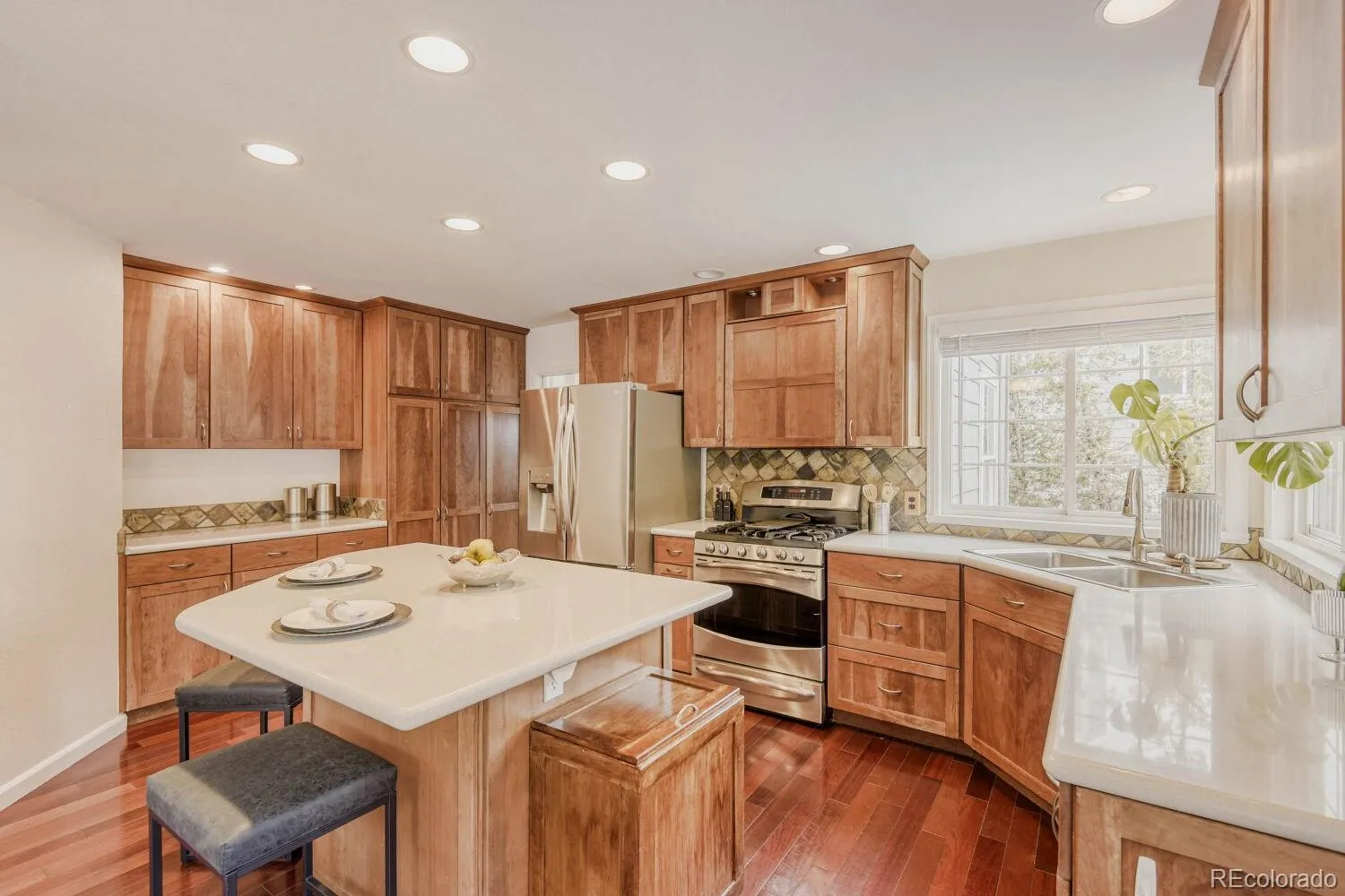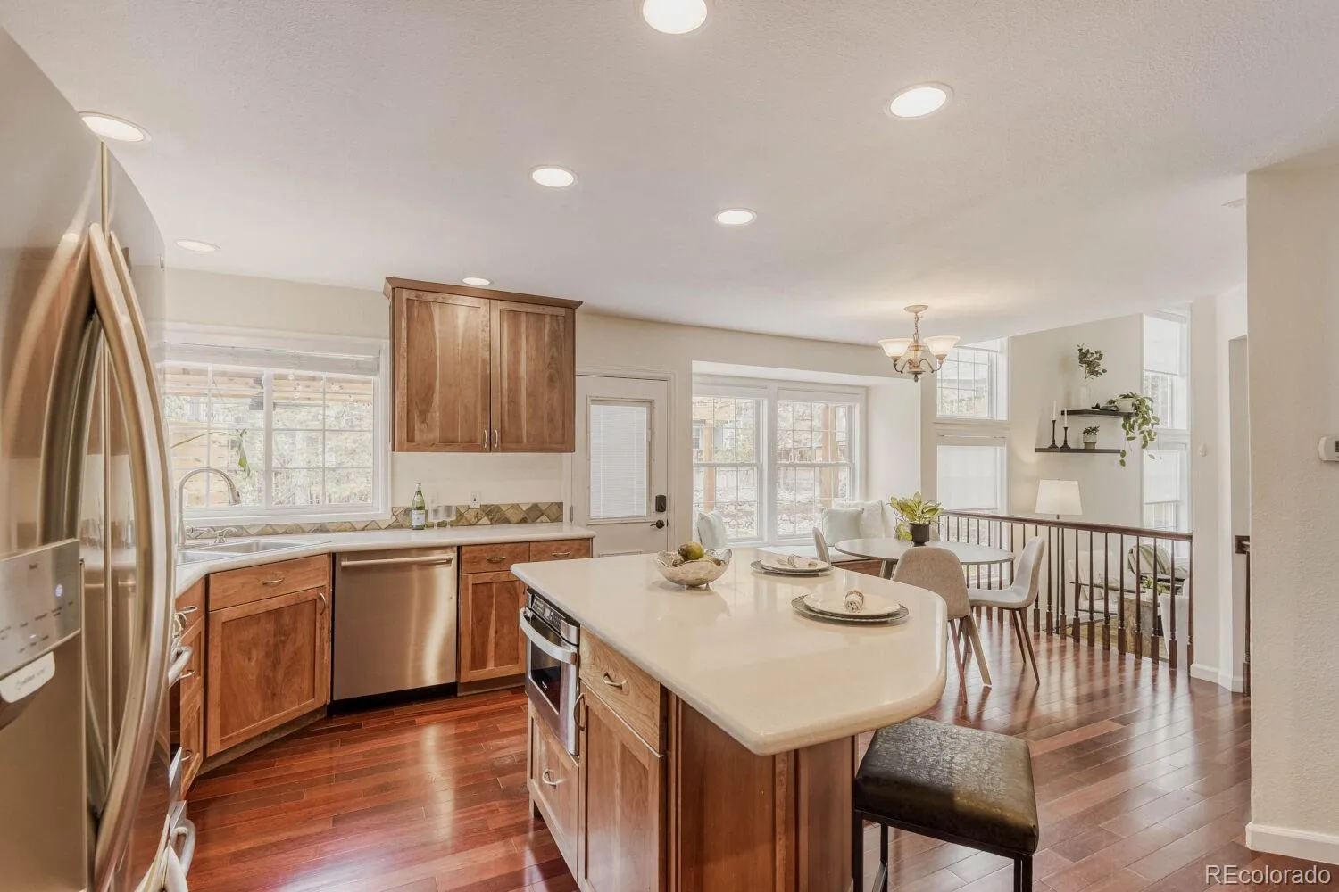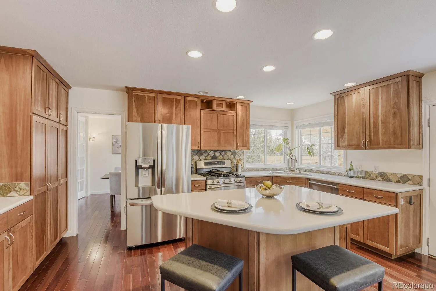 Welcome to this beautifully updated two-story home nestled at the end of a quiet cul-de-sac in the highly desirable Northridge community of Highlands Ranch. This spacious 4-bedroom residence offers a perfect blend of elegance, comfort, and thoughtful upgrades throughout. Step inside to soaring vaulted ceilings in both the family room and living room, creating an open and inviting atmosphere filled with natural light. The main level showcases rich Brazilian Cherry hardwood floors, adding warmth and sophistication. A formal dining room provides the perfect setting for gatherings, while the stunning floor-to-ceiling brick fireplace serves as a striking focal point in the living space. The kitchen has been meticulously designed with hand-crafted cherry cabinets featuring soft-close drawers and convenient pullouts, complemented by sleek stainless steel appliances. An eat-in kitchen area with a charming bay window overlooks the backyard, offering a bright and cozy space for everyday meals. Upstairs, the expansive primary suite is a true retreat, complete with a luxurious five-piece bath. Three additional generously sized bedrooms and a well-appointed 3/4 bathroom provide ample space for family or guests. The finished basement adds over 700 square feet of versatile living space, ideal for a media room, home gym, or recreation area. Car enthusiasts and those needing extra storage will appreciate the oversized 3-car garage. Outdoor living is equally impressive, featuring a beautifully crafted pergola and stamped concrete patio, perfect for entertaining or relaxing. The professionally landscaped yard includes 11 newly planted trees and over $100,000 invested in exterior improvements, creating a private and serene setting. This exceptional home combines premium upgrades, functional living spaces, and a prime location—offering a rare opportunity in one of Highlands Ranch’s most sought-after neighborhoods.