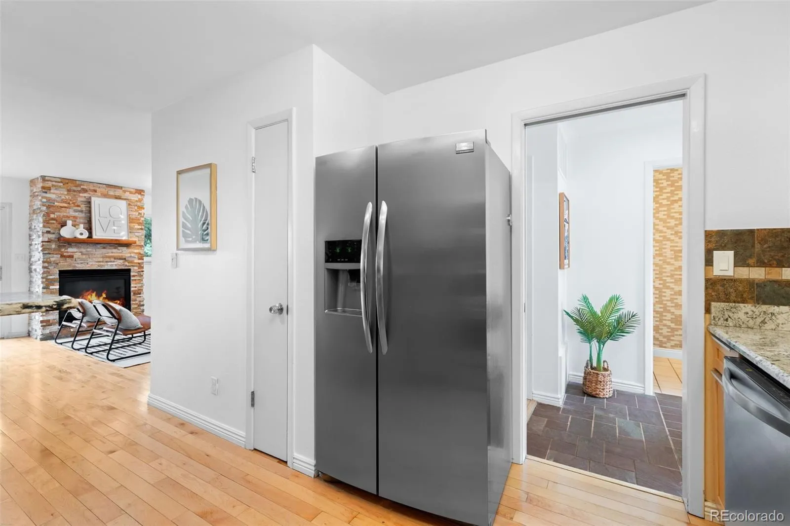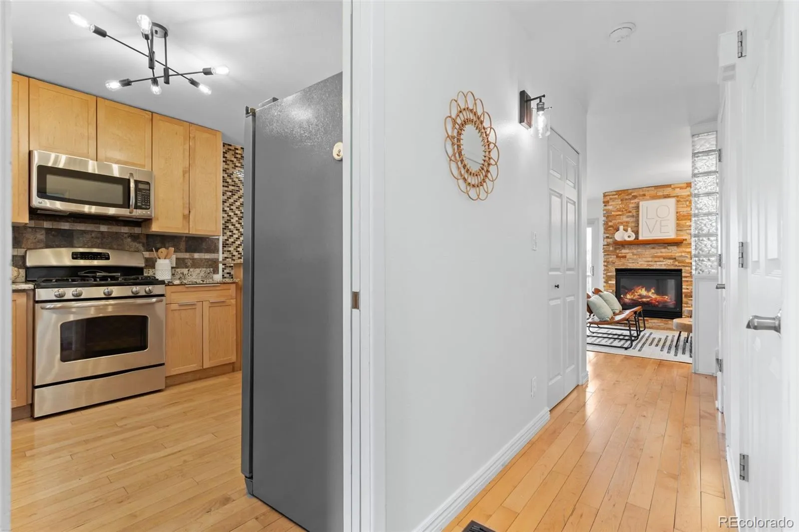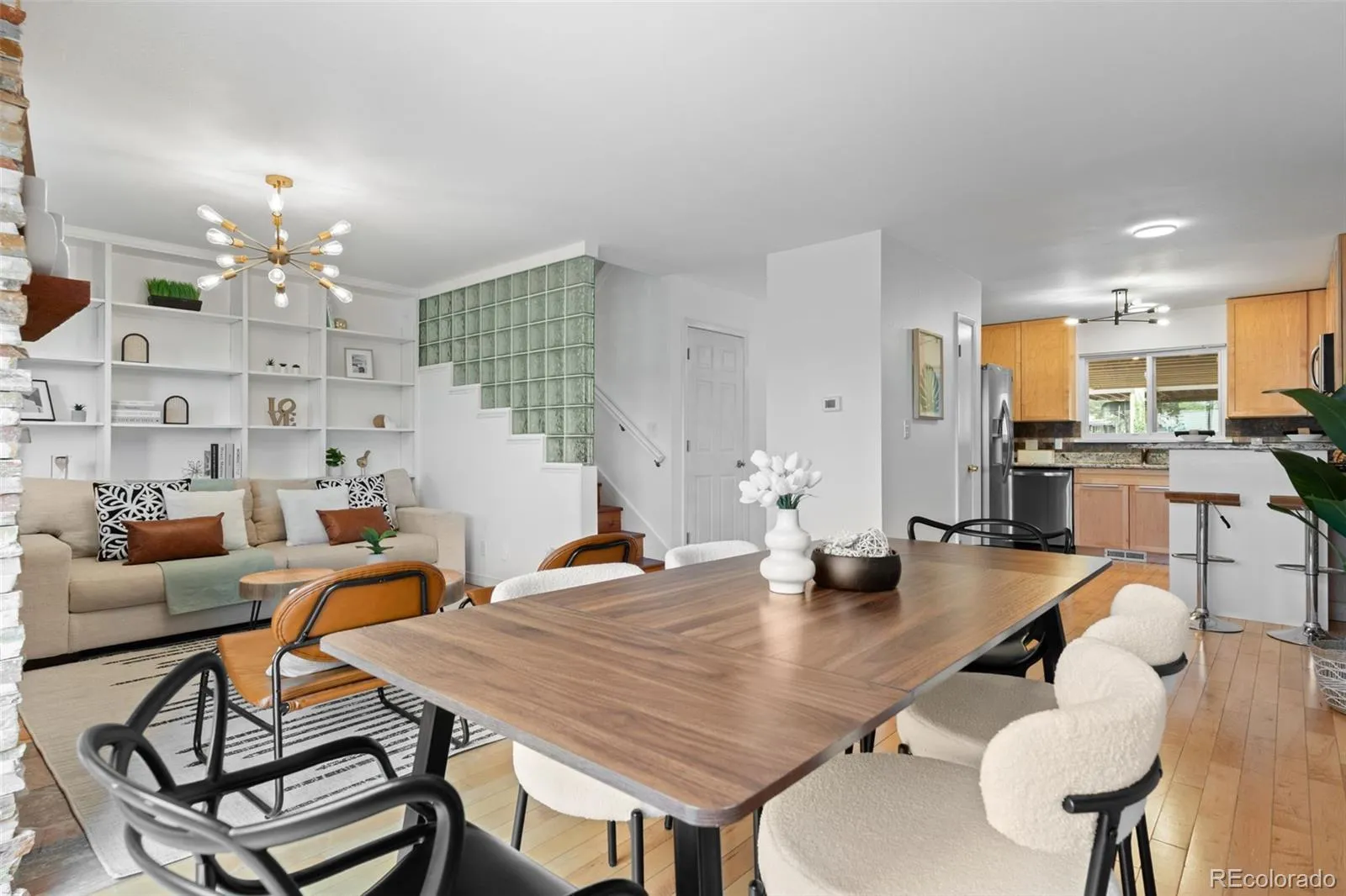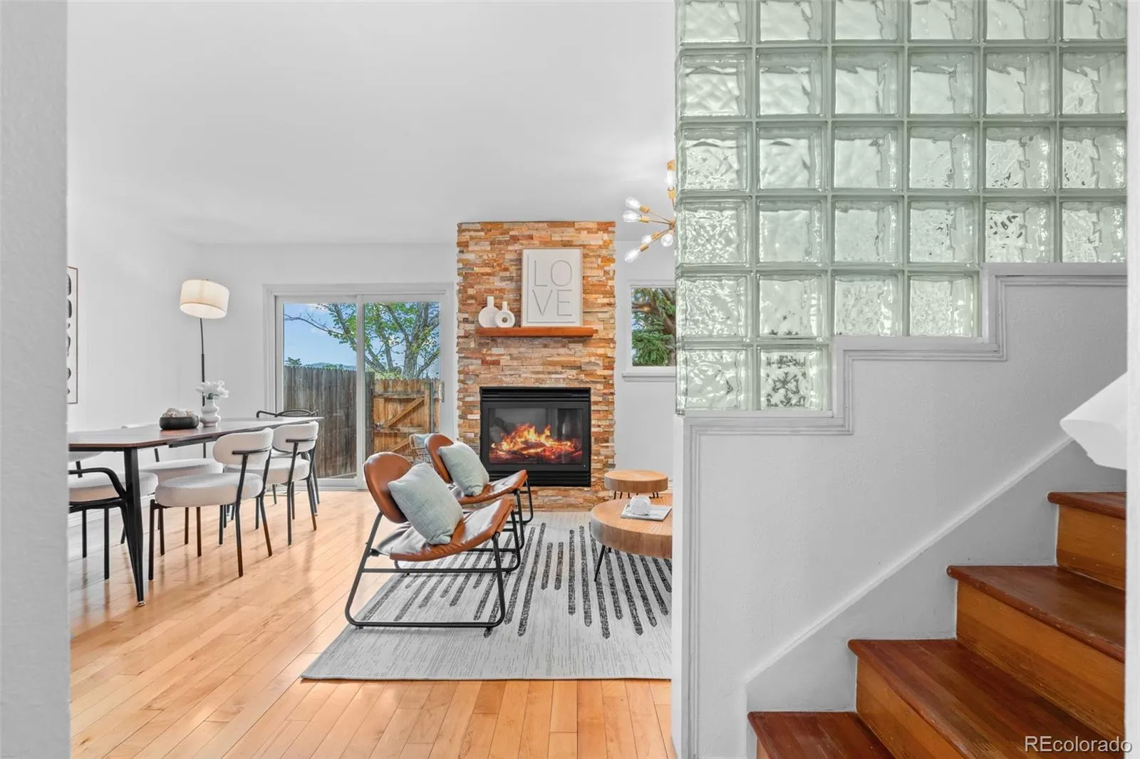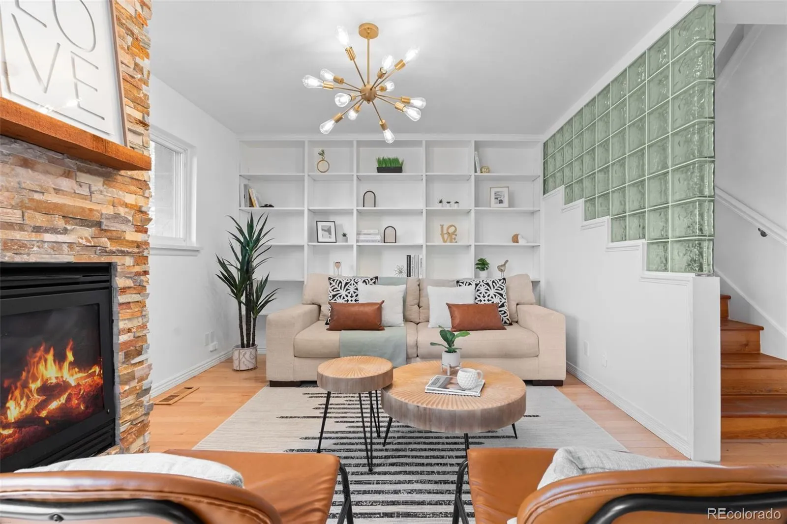 Enjoy mountain views from every room as sunlight fills this thoughtfully designed Mountain Shadows townhome, where hardwood floors span the main and upper levels, creating a warm feel throughout. The inviting living room is anchored by a fireplace with native Colorado stone and a built-in bookcase—an ideal space for both relaxed evenings and everyday living.