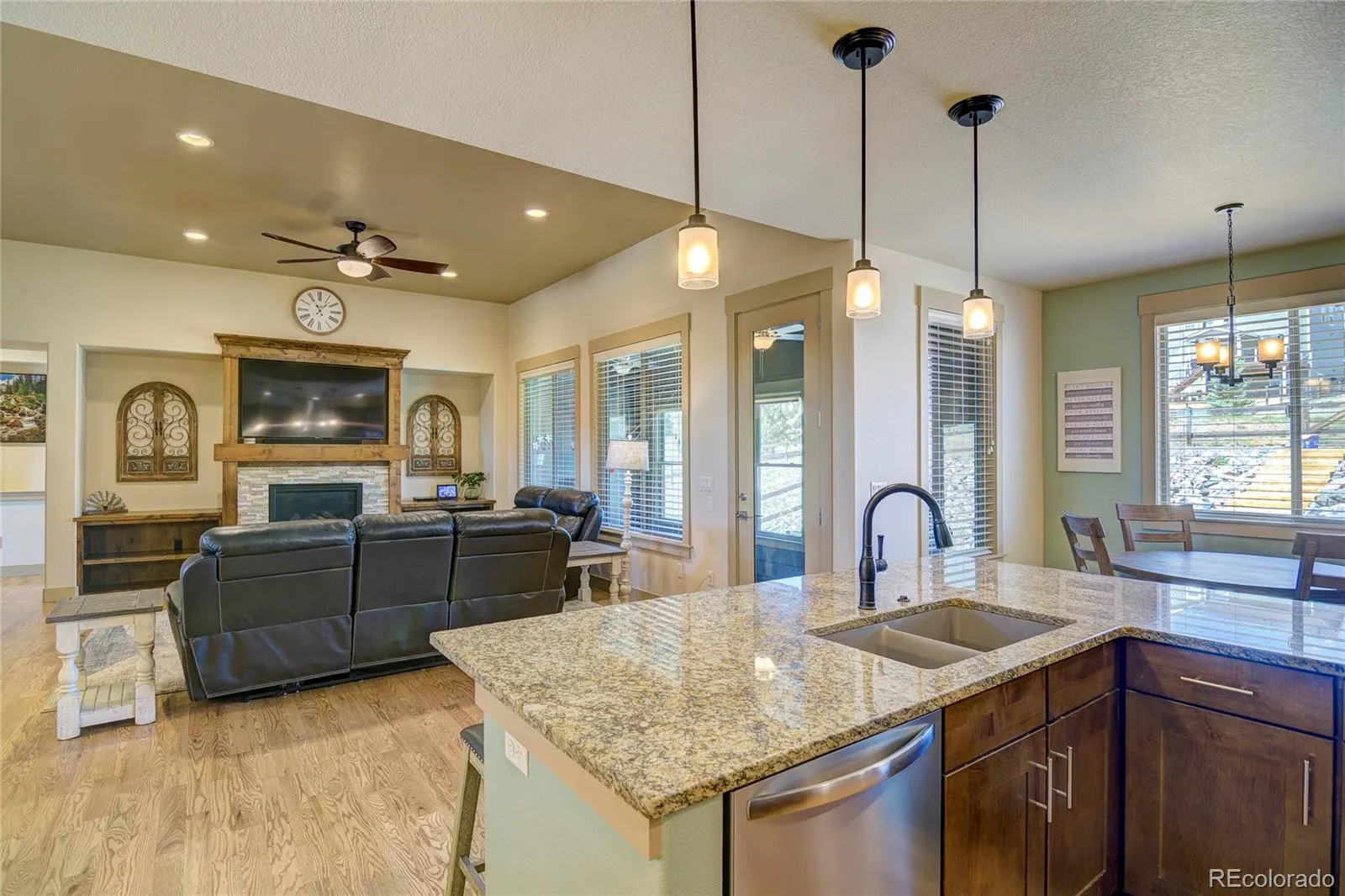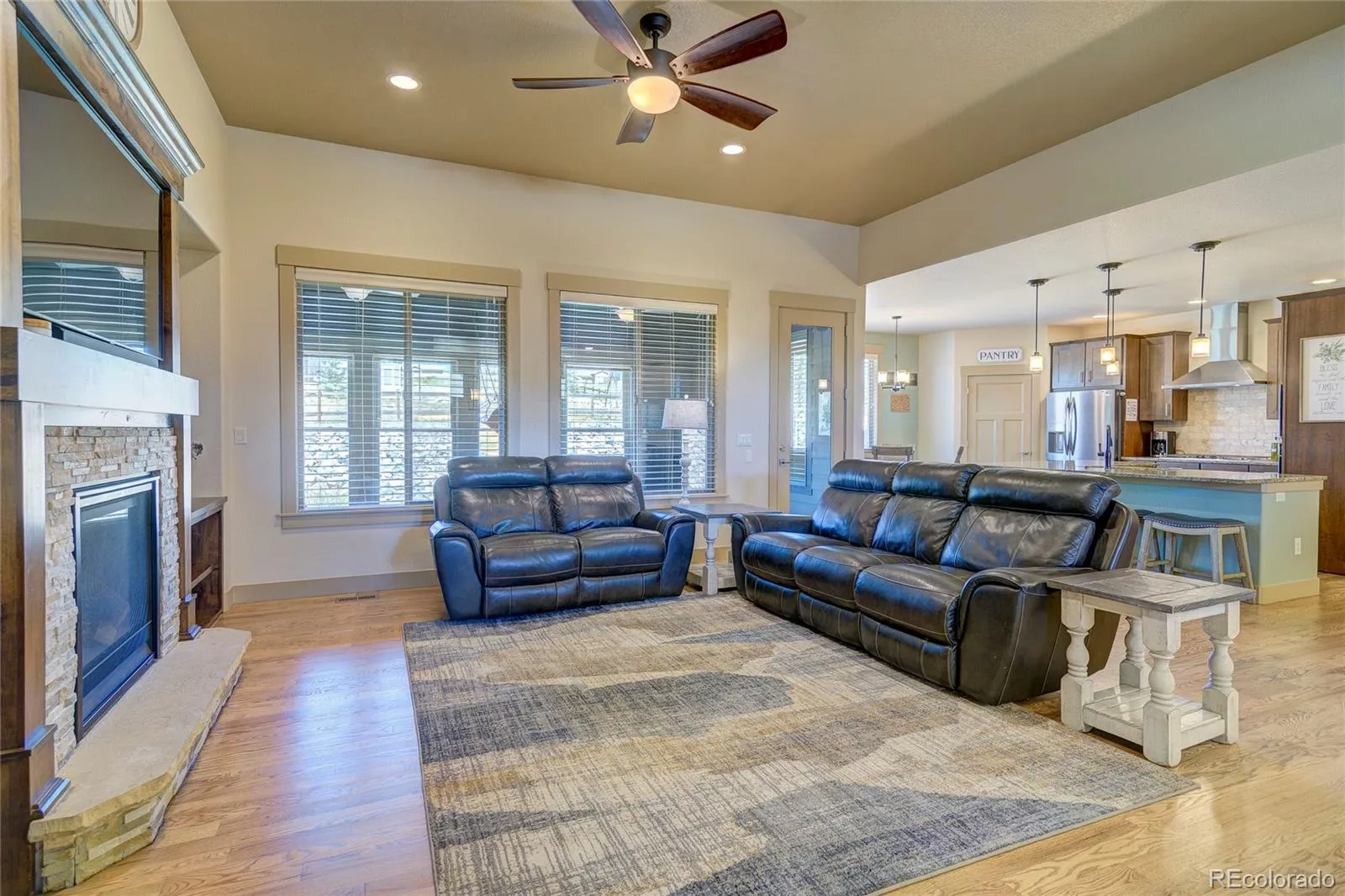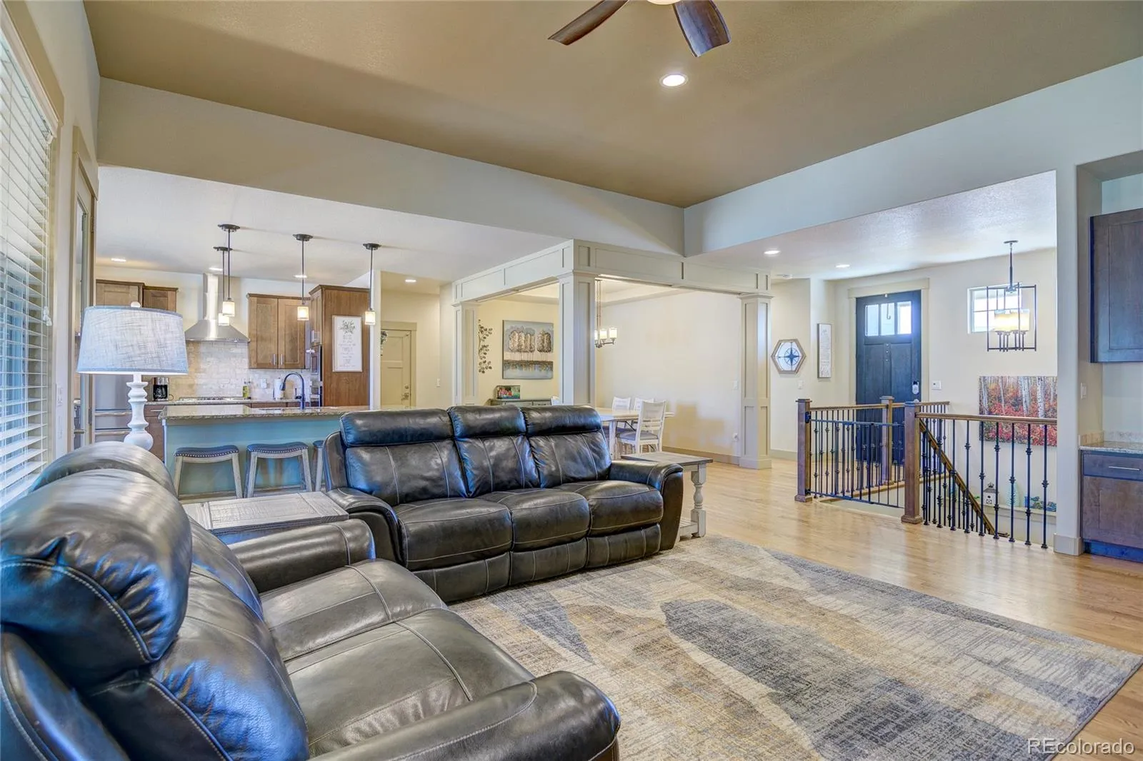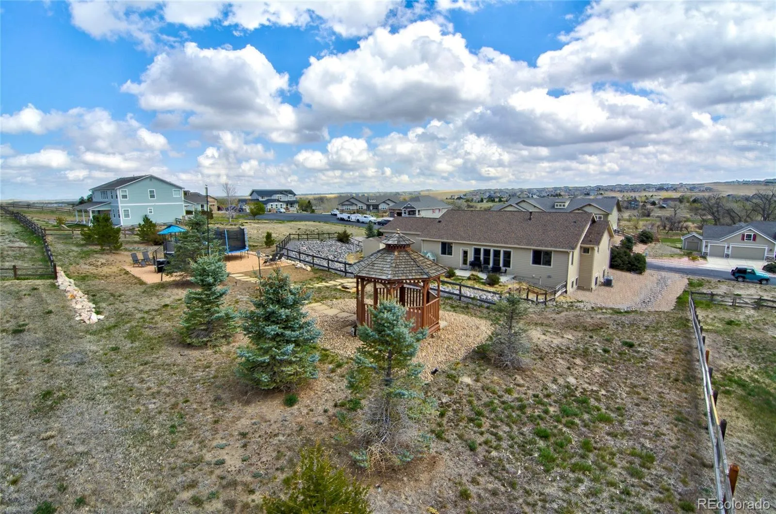 Escape city living and enjoy space, privacy, and refined Colorado comfort—just 20 minutes to Parker. Situated on a beautifully landscaped 0.82-acre lot at the end of a quiet cul-de-sac, this exceptional 7-bedroom ranch is one of the original Tom Hall/Renaissance Homes in desirable Spring Valley Ranch. The open-concept great room features soaring 12’ ceilings, refinished hardwood floors (2025), and a cozy fireplace with built-ins. The gourmet kitchen offers slab granite countertops, stainless steel appliances, a walk-in pantry, formal dining, and a bright breakfast nook. Eight-foot doors throughout the main level enhance the spacious feel. The main floor includes a luxurious primary suite with coffered ceilings, five-piece bath, Roman tub, and large walk-in closet. Two bedrooms share a Jack-and-Jill bath, plus a private guest suite with its own ¾ bath—ideal for visitors or multigenerational living. Enjoy year-round relaxation in the enclosed sunroom or step outside to the gazebo, large patio, and new playground area with playset and trampoline. The finished garden-level basement adds 3 bedrooms, a full bath, second laundry room, wet bar, workout/flex space, and ample storage. Additional highlights include a deep 3-car garage with 8’ doors and high-speed fiber optic internet. Major updates include a Class 4 impact-resistant roof, new gutters, and exterior paint (2024), plus new carpet and refinished hardwood floors (2025). Located in a golf course community with clubhouse and grill, this move-in ready home offers the perfect blend of luxury, function, and convenience.