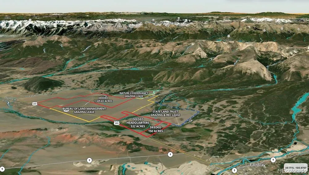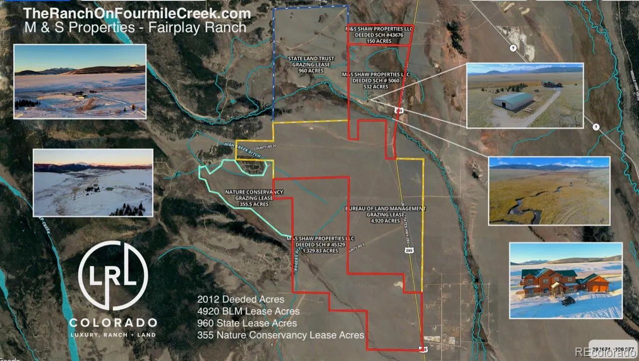 Lying just outside the quaint mountain town of Fairplay Colorado, The Ranch On Fourmile Creek is an expansive high park grassland providing spacious grazing in conjunction with excellent sporting opportunities for the outdoor enthusiasts including fishing, hunting, hiking, ATVing. Roughly 1.5m of Foumile Creek meanders through the lowland for excellent fly-fishing opportunities for anglers of all skill levels to enjoy in a stunning landscape. Sizable acreage provides the ownership access to the Landowner Preference Program for big game hunting tags (13 for 2023) on private and public lands. This exceptional ranch is just 30 minutes from world class skiing to the north in Breckenridge and similarly to Buena Vista and the Arkansas River Headwaters Recreation Area (white water rafting, golf) to the south. Enjoys commanding views of snowcapped peaks in every direction near and far including Mosquito Range, Silverheels, Buffalo Peaks Wilderness, Sangre De Christo Mountains and Pikes Peak! At the heart of the ranch lies a stellar 3754 sq ft home with four ensuite bedroom retreats, open floor plan with 2 story high stunning picture windows with an expansive view of Buffalo Peak. The home has been thoughtfully positioned to take advantage of the panoramic views out of every window in every direction. The improvements are further complimented with an expansive 8,000 sq ft heated steel barn with fenced paddock. All the improvements are powered with sustainable off-grid power systems with a primary solar array (owned) which has been recently upgraded with modern battery storage technology and a new propane backup generator for high demand times. Add’l assets include adjacent BLM (1720 ac), State (960ac) and Nature Conservancy (355ac) grazing leases that may be assignable and transferrable to a buyer subject to approvals from the respective agencies. Info re Hart I&II and South Park conservation easements contained within website TheRanchOnFourmileCreek