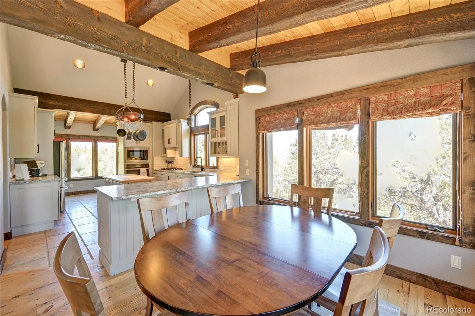 Notable features include hand-hewn structural beams, custom walnut cabinetry, and exposed cedar tongue-and-groove ceilings in the living room. Both the kitchen and primary bathroom have been tastefully remodeled. The kitchen’s hanging pot rack, the light fixture above the main sink, and much of the hardware throughout the home are custom wrought-iron pieces crafted specifically for this property. The hardwood floors were reclaimed from a San Francisco pier, bringing a rich sense of history into the space.