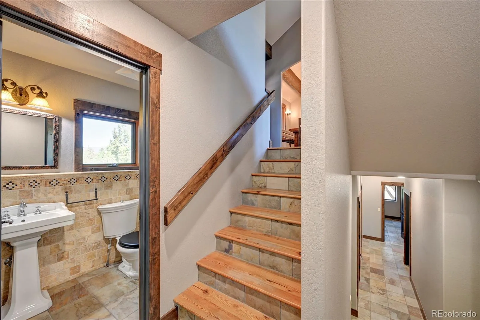 The main living room centers around a wood-burning, all-masonry Rumford fireplace—an 18th-century design by Sir Benjamin Thompson, Count Rumford, known for its superior heat projection. Exterior details include copper-pipe and spruce-beam railings, as well as recently repainted stucco. The kitchen and entry feature Italian travertine flooring, while the lower level is finished with slate of the highest quality. The study is accented with antique doors.