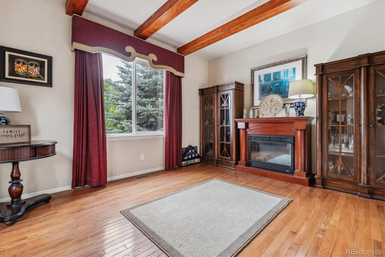 On the main level: a formal dining room and formal living room with custom beamed ceiling, a ¾ guest bath, a quiet office leading to the builder-upgrade private entry into the single-car side of the garage.