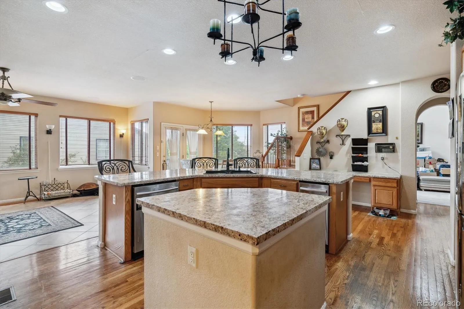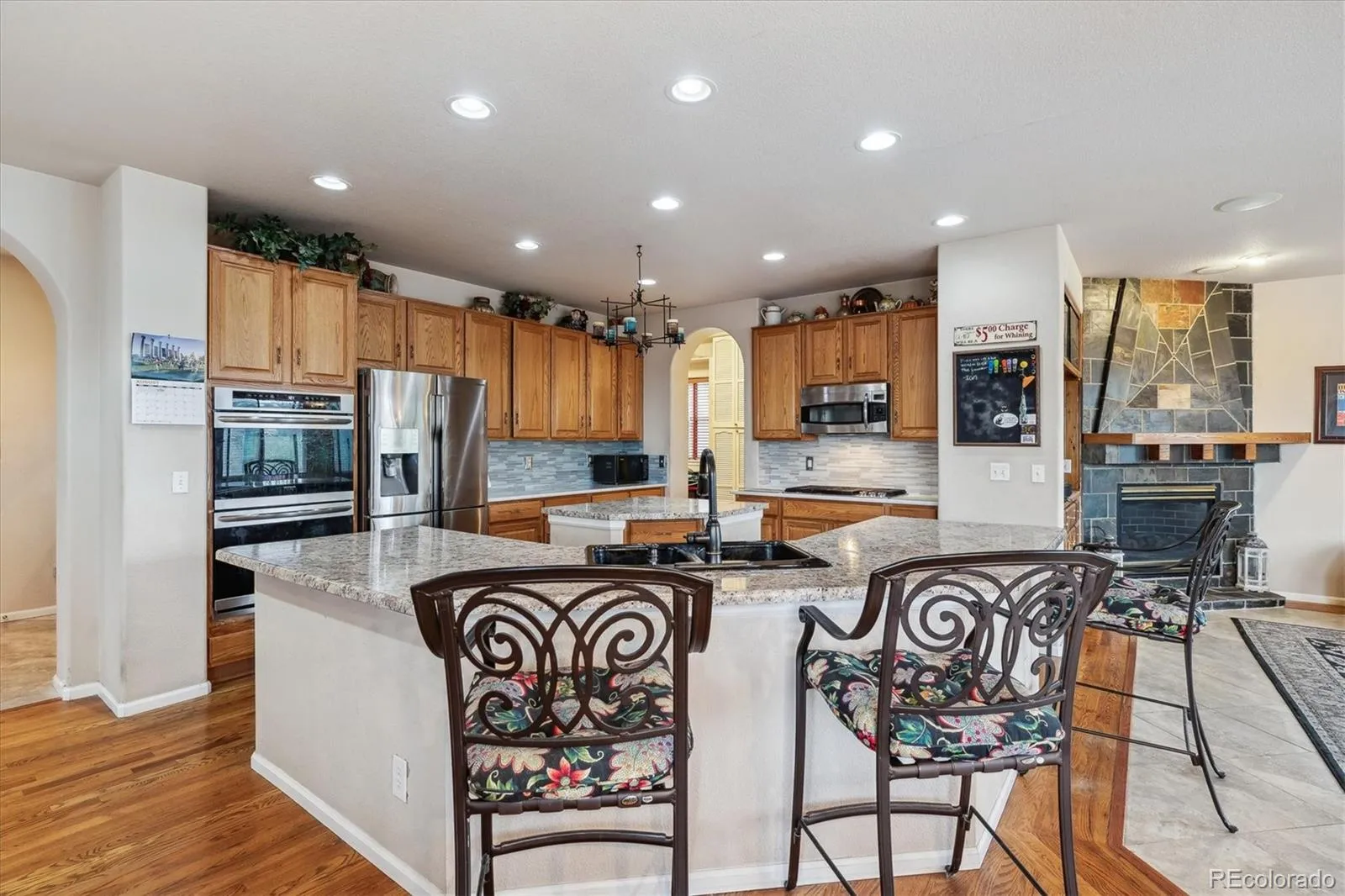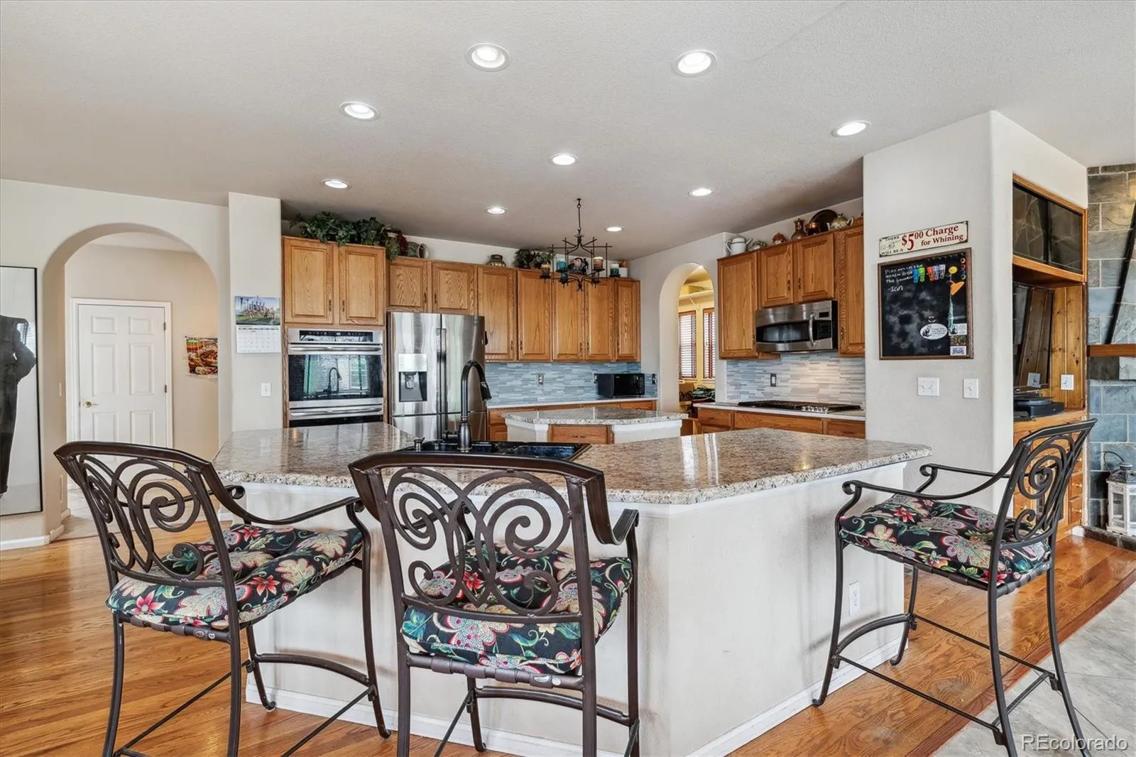 You’ll be greeted by a grand two-story entry with vaulted ceilings, tile and hardwood flooring, graceful arches, and stunning stained glass that bathes the foyer in warm, inviting light. The kitchen, heart of the home, flows into the family room with a gas fireplace, and also connects via the back staircase leading upstairs. Dual islands, a built-in desk, breakfast nook, bar seating, plus access to a walk-in pantry and super spacious mudroom give you plenty of function and style.