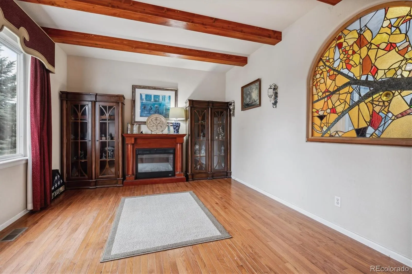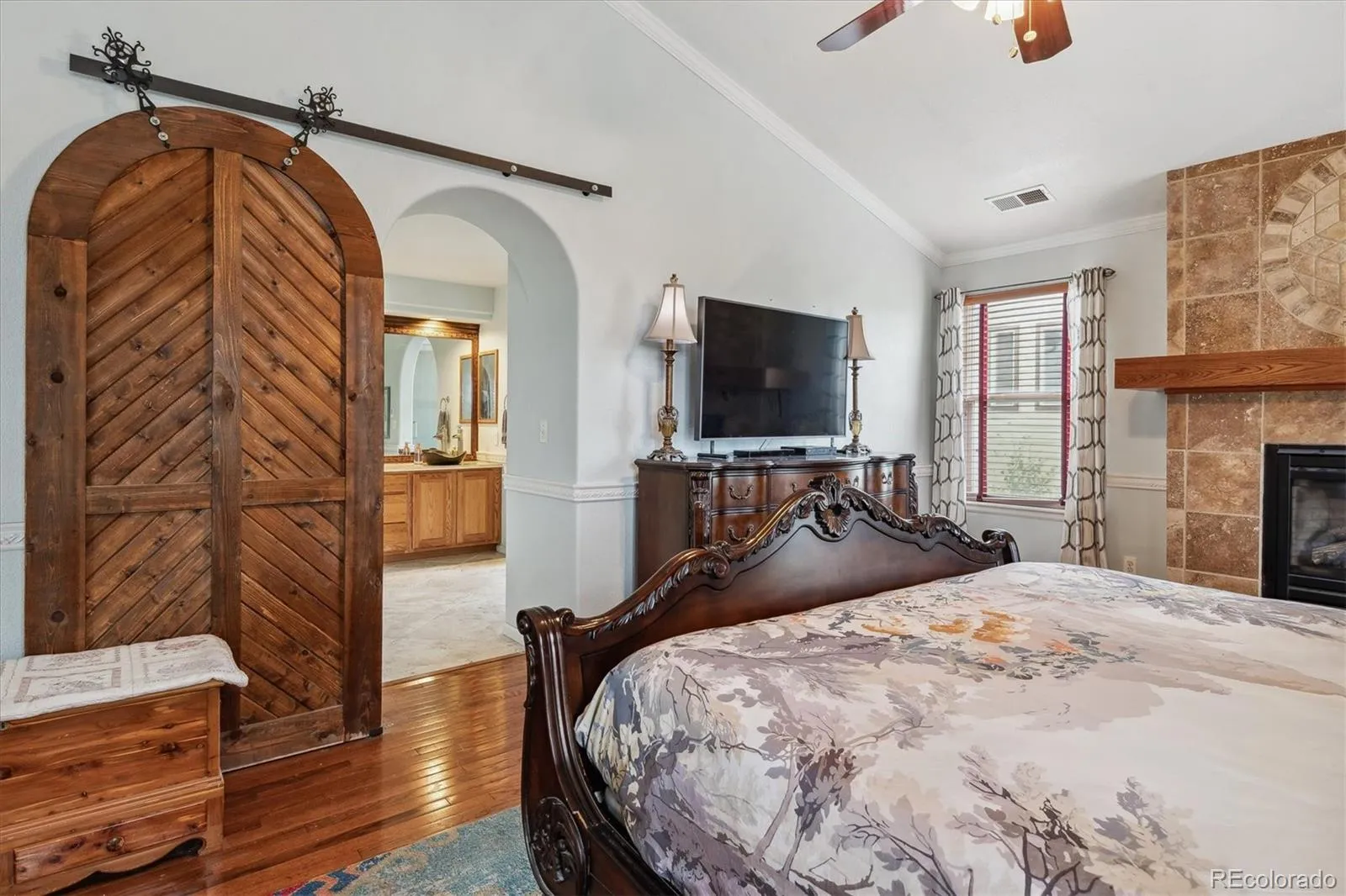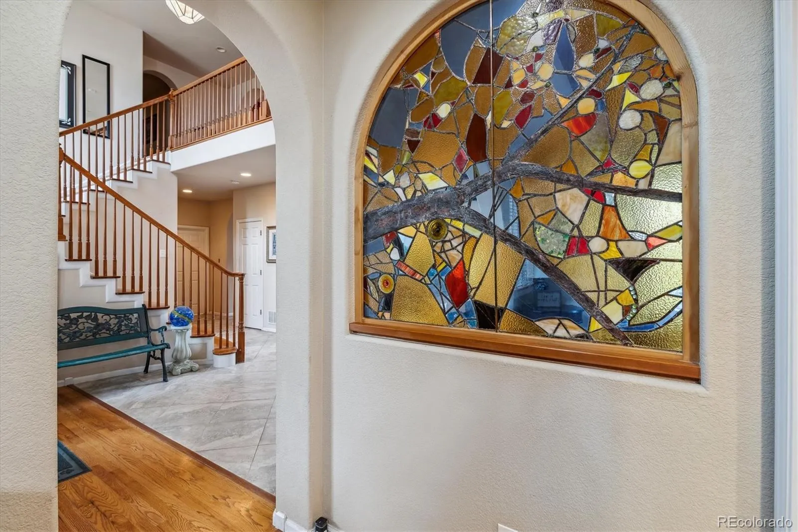 You’ll be greeted by a grand two-story entry with vaulted ceilings, tile and hardwood flooring, graceful arches, and stunning stained glass that bathes the foyer in warm, inviting light. The kitchen, heart of the home, flows into the family room with a gas fireplace, and also connects via the back staircase leading upstairs. Dual islands, a built-in desk, breakfast nook, bar seating, plus access to a walk-in pantry and super spacious mudroom give you plenty of function and style.