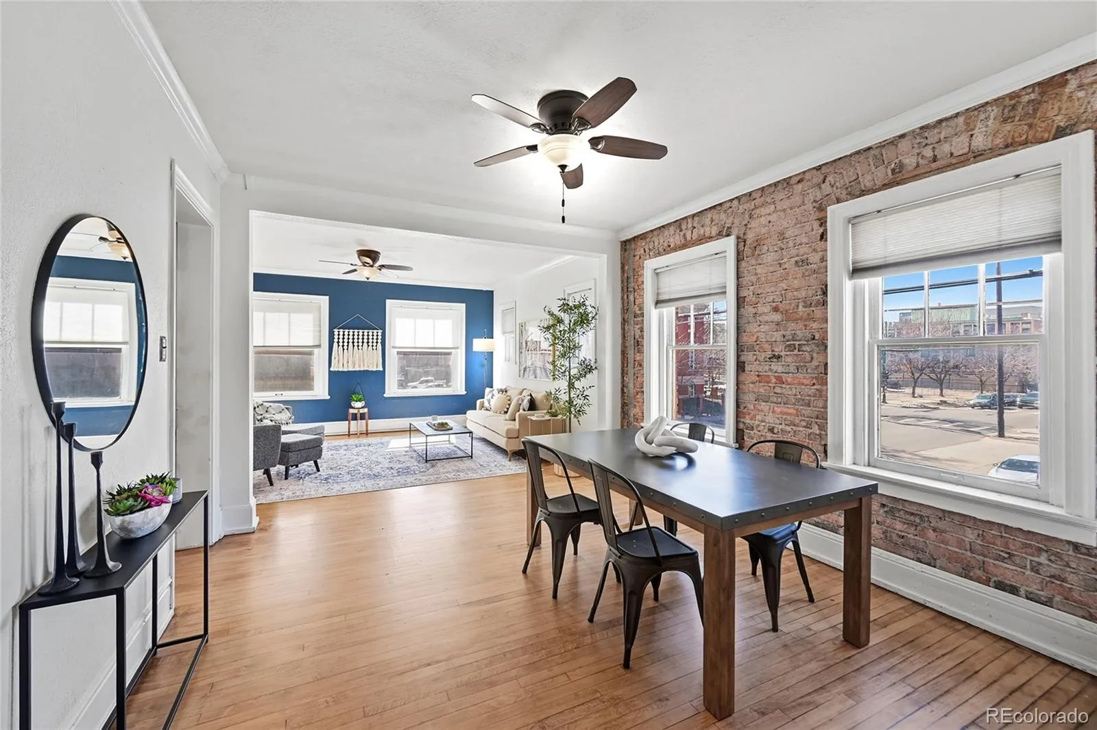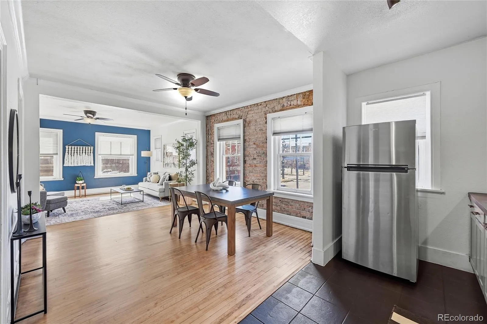 The spacious living area flows seamlessly into a bright dining room, where exposed brick adds warmth and character. In the kitchen, a newer countertop pairs beautifully with a freshly tiled backsplash and stainless steel appliances, while under-cabinet lighting creates both ambiance and everyday functionality.