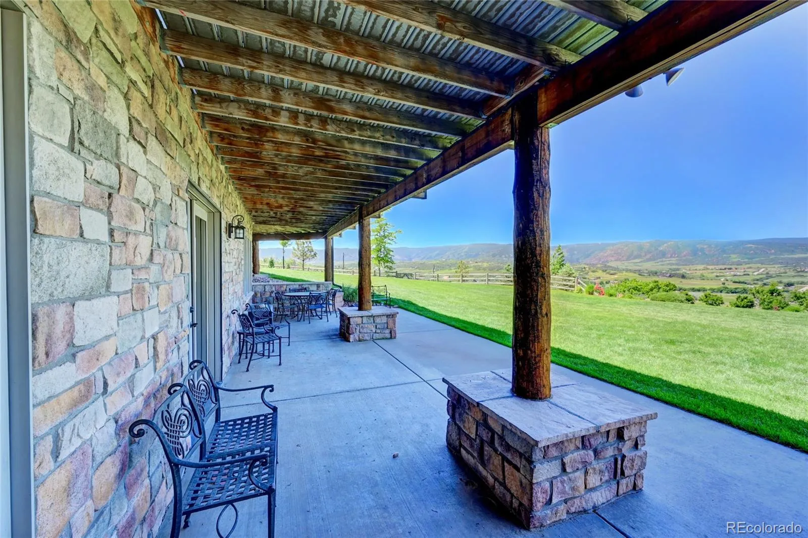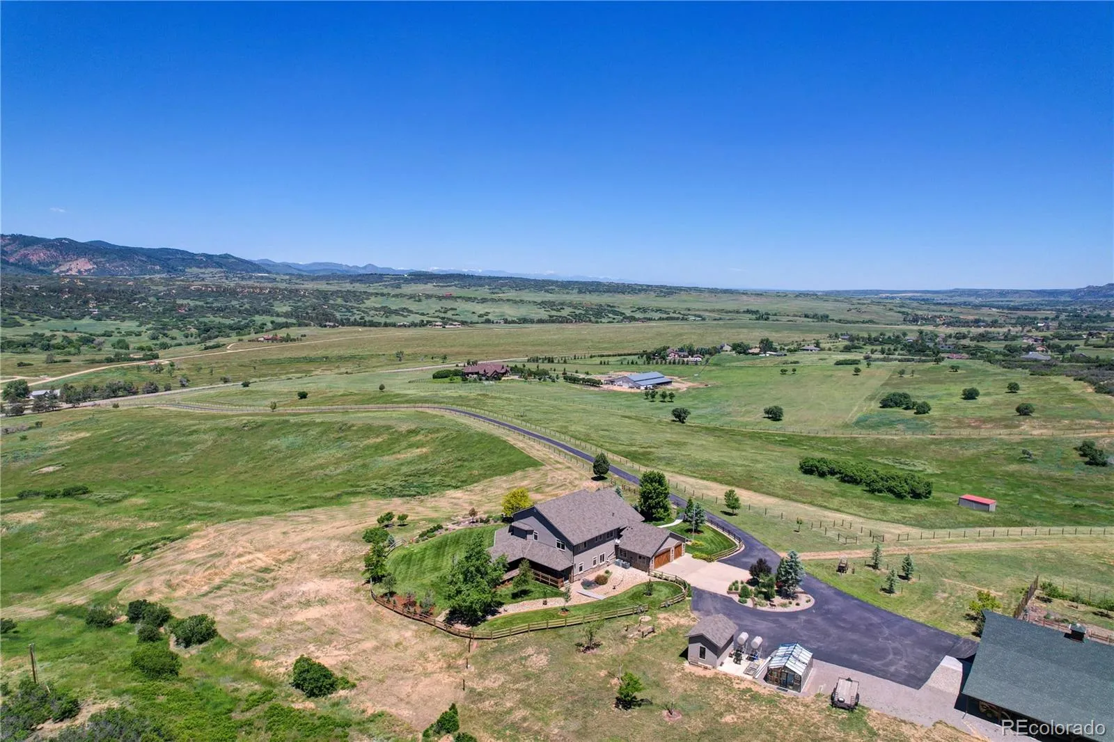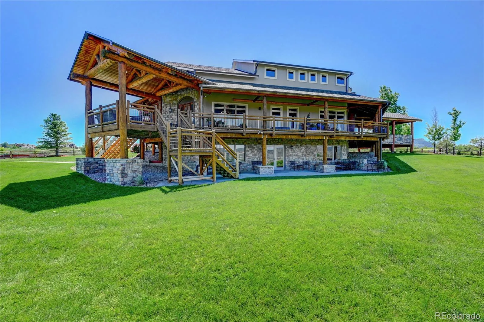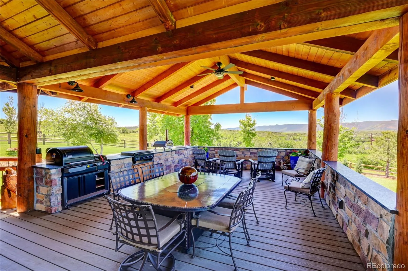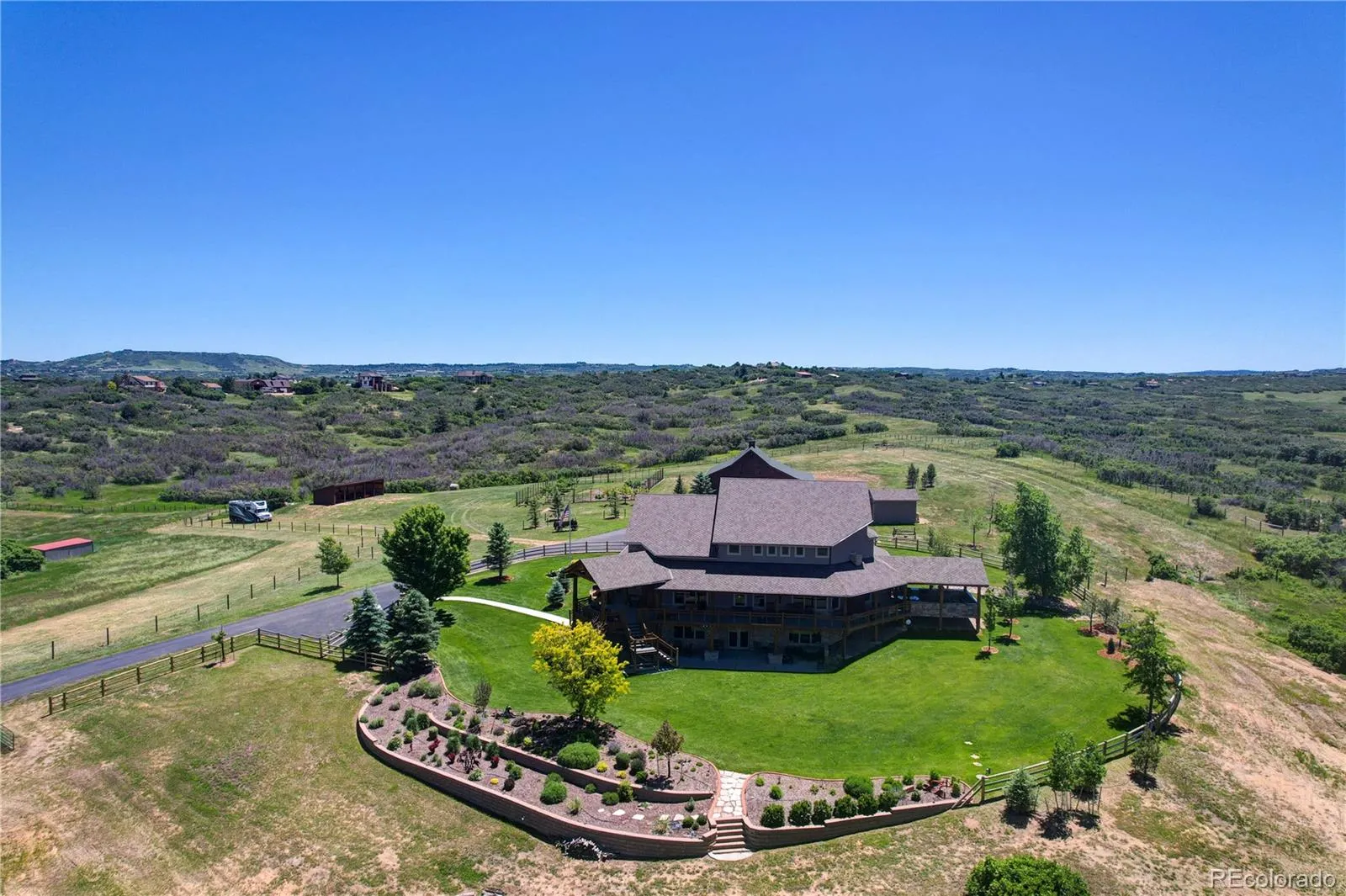 Magnificent and private 40 acre horse property with gorgeous rolling hills located in highly desirable Plum Creek Valley on Perry Park Rd (Hwy 105).Completely remodeled “Lodge” with an open expansive floor plan with exposed log beams and incredible views of the valley and foothills. The massive wrap around covered deck features an expanded new outdoor kitchen/dining on South side with grill, granite counters, fans, fire feature and wired for TV. Open and updated kitchen features new cabinetry, granite and butcher block counters, granite sink with hot water dispenser, Fisher & Paykel 6 burner cooktop with double oven, refrigerator drawers in island and custom dry bar with glass doors and wine fridge.Large main floor Primary bedroom has expansive sitting area, fireplace and private entrance to wrap around covered deck. Primary bathroom has been completely remodeled with heated floors, new cabinetry and tile. Spacious walk out level features a theater, 2nd full kitchen and can be used as in-law suite. Over $1 million in remodeling/upgrading with new paint, carpeting and lighting throughout. New gated full asphalt drive from road to house connecting to barn and single detached garage. The large new 40 x 50 Post and Beam barn has concrete floors, loft, bathroom, electricity and water with full length lean-to on South side. There is a large garden area with water and deer fence as well as a glass 12×20 greenhouse with electricity and water with automatic 6 vents. Power to shed and island area of driveway. Large 15×50 lean-to near garden. Over $50,000 in new landscaping. Large lean-to just East of the garden for equipment or hay storage