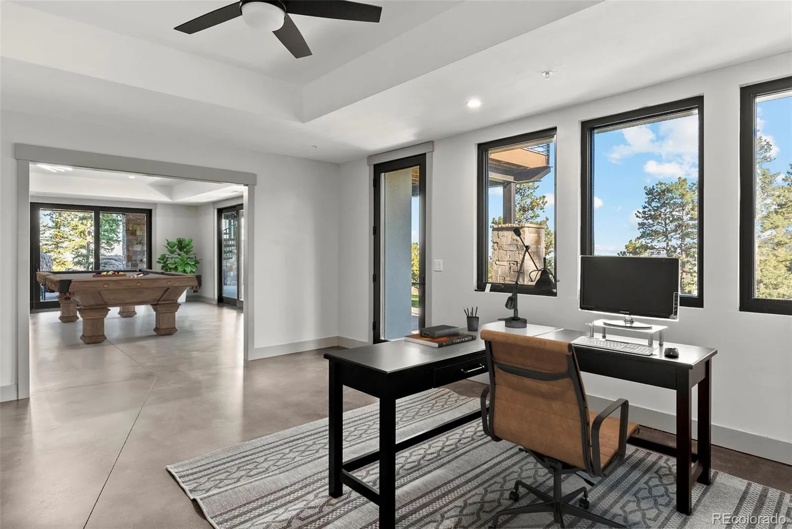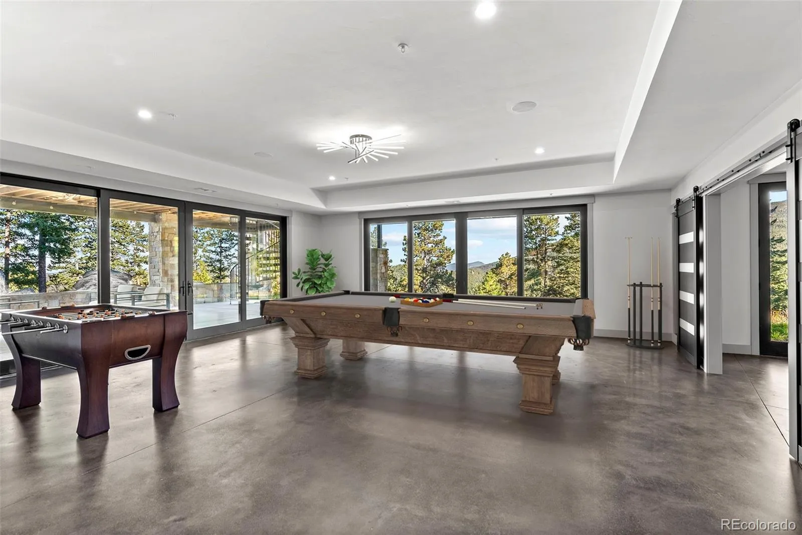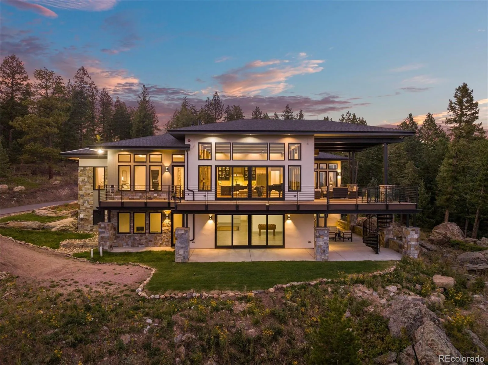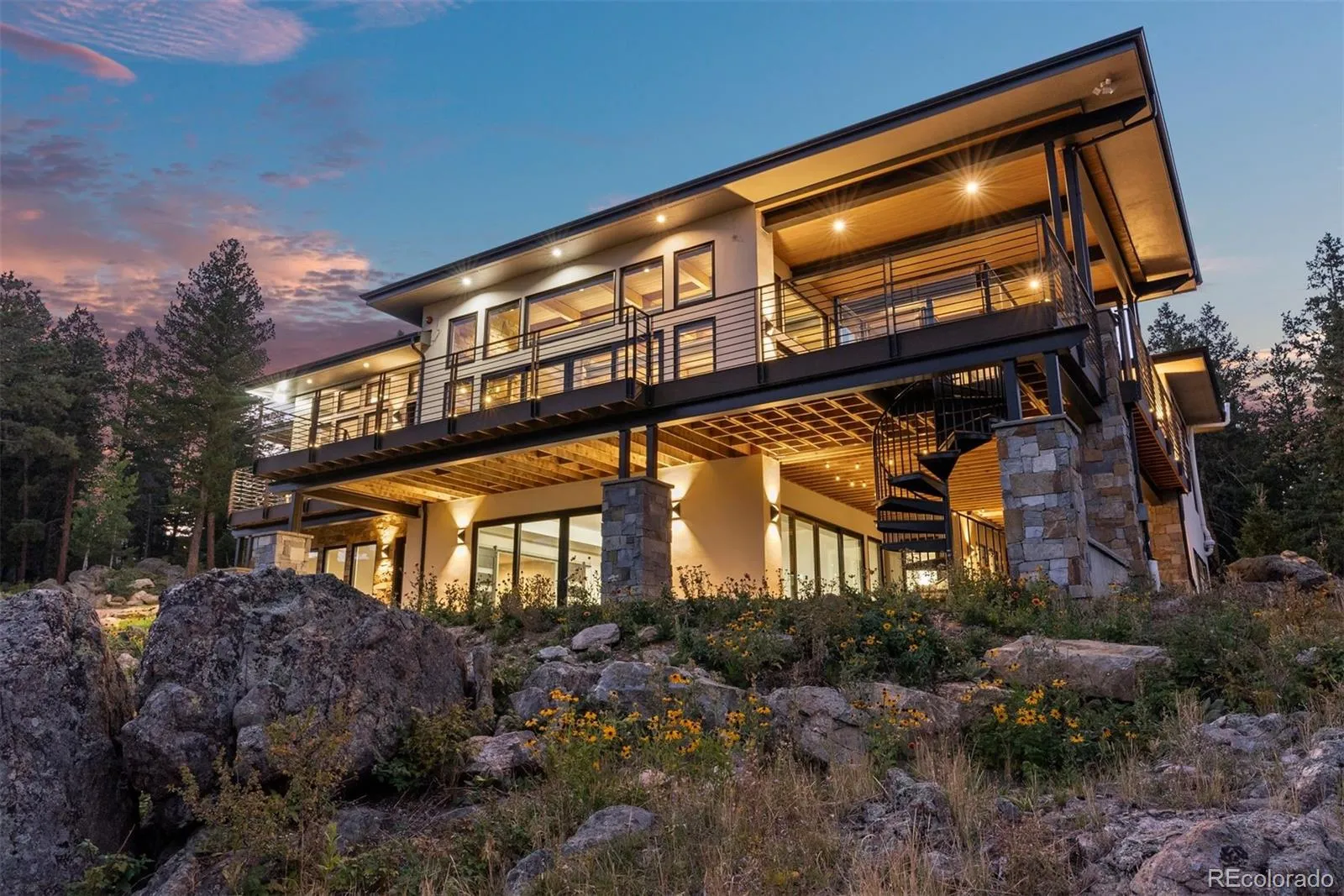 Nestled on 10 private acres, this stunning modern home perfectly marries contemporary design with the natural beauty of Evergreen. Situated at the top of a private country road, this newer construction features an open floor plan, inviting abundant natural light and creating a warm, welcoming atmosphere. As you enter, the expansive great room captivates with its impressive 20-foot wood ceilings, elegant I-beams, and automated accent lighting. Large windows and sliding glass doors open to the spacious deck and showcase breathtaking mountain views, while a striking gas fireplace with custom stonework and rolled steel surround serves as a cozy focal point. The gourmet kitchen is a chef’s dream, highlighted by a magnificent 14-foot Quartzite Island with a waterfall edge, Thermador appliances, and custom Plato cabinetry and offers the ideal space for entertaining. The luxurious main floor primary suite features a spa-like en-suite bathroom with dual Quartzite vanities and custom lighting, a soaking tub, and a glass-enclosed shower. With 5 additional bedrooms throughout the home, to include a private In-Law suite, and 2 offices, this exceptional home offers space to suite all needs. The walkout lower level enhances the home’s entertaining potential. This space features a spacious entertaining area complete with an oversized 12-foot bar topped with a stunning live edge butcher block. While a remarkable 1,400 square foot covered patio area extends the living space outdoors, perfect for enjoying the surrounding nature. With energy-efficient features, smart home technology, and impeccable craftsmanship, 1082 W Meadow Drive stands as a true sanctuary, offering the perfect blend of luxury and comfort in a breathtaking setting.