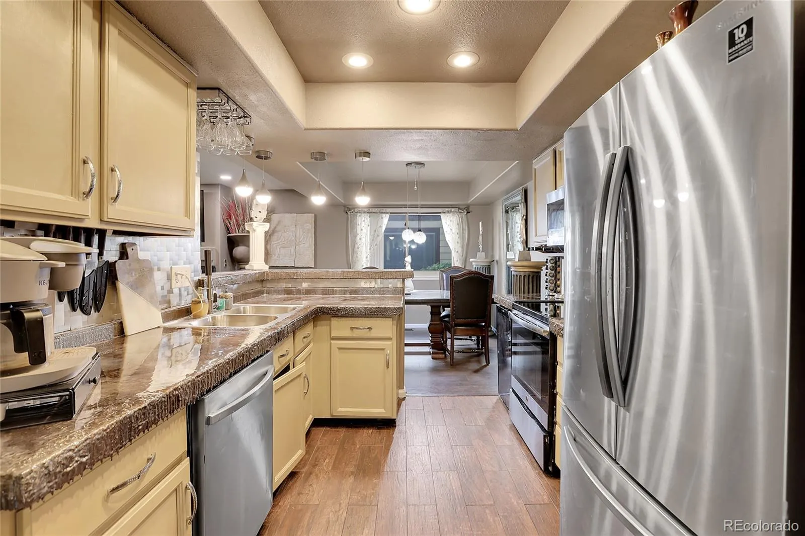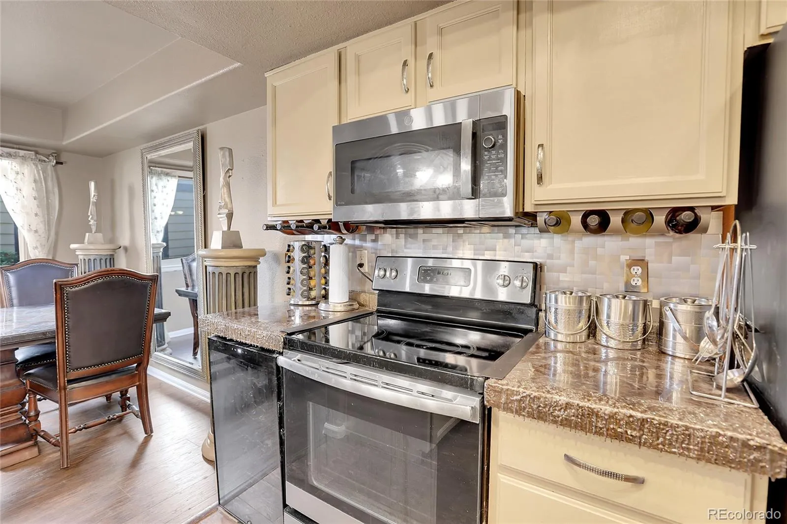 The kitchen is a highlight of the home, featuring high-quality stainless steel appliances, cream cabinetry, and light hardwood flooring that exudes modern elegance. The decorative backsplash and pendant lighting add a touch of refinement, making this kitchen not only a culinary workspace but also a social hub for gatherings.